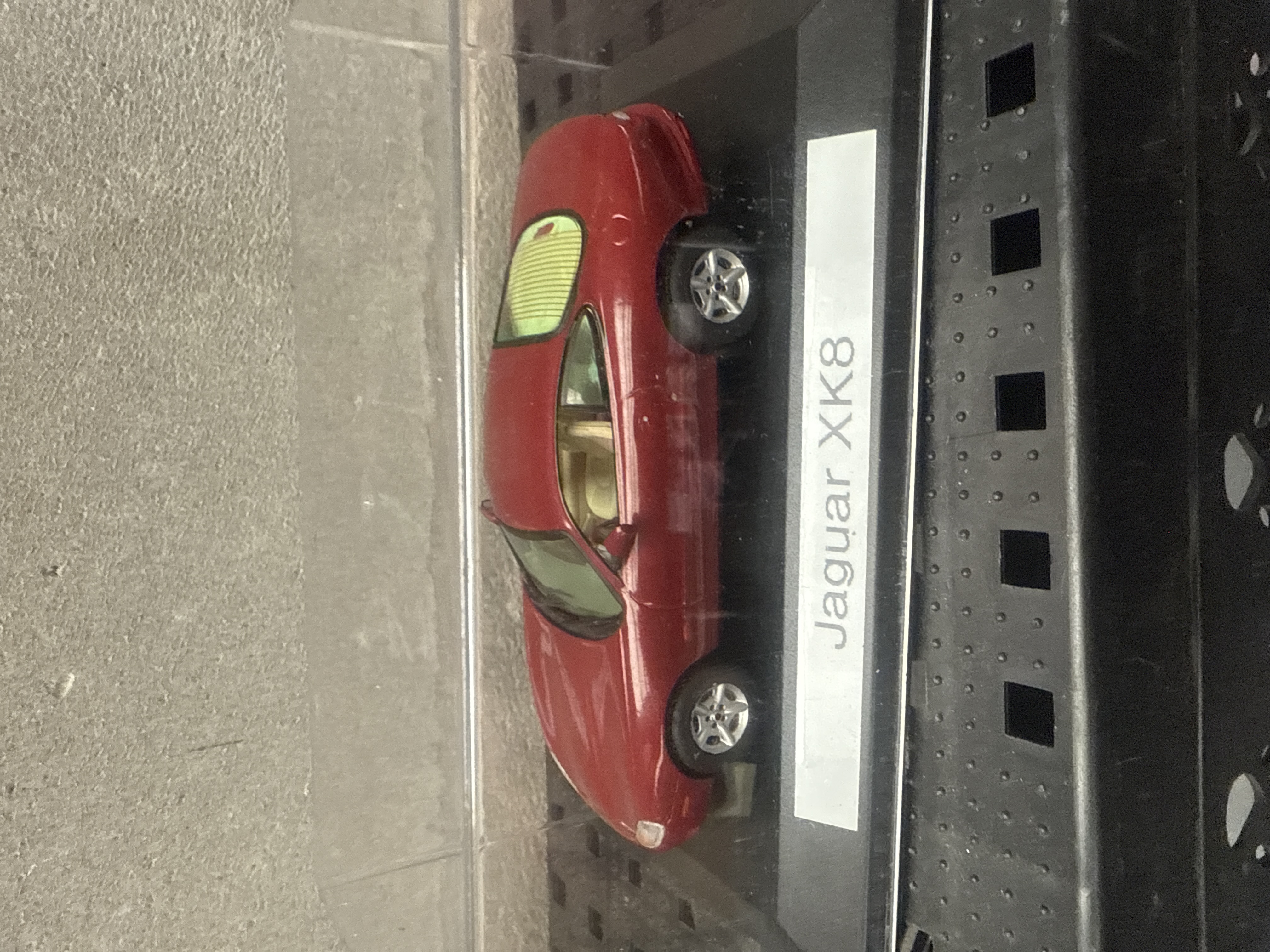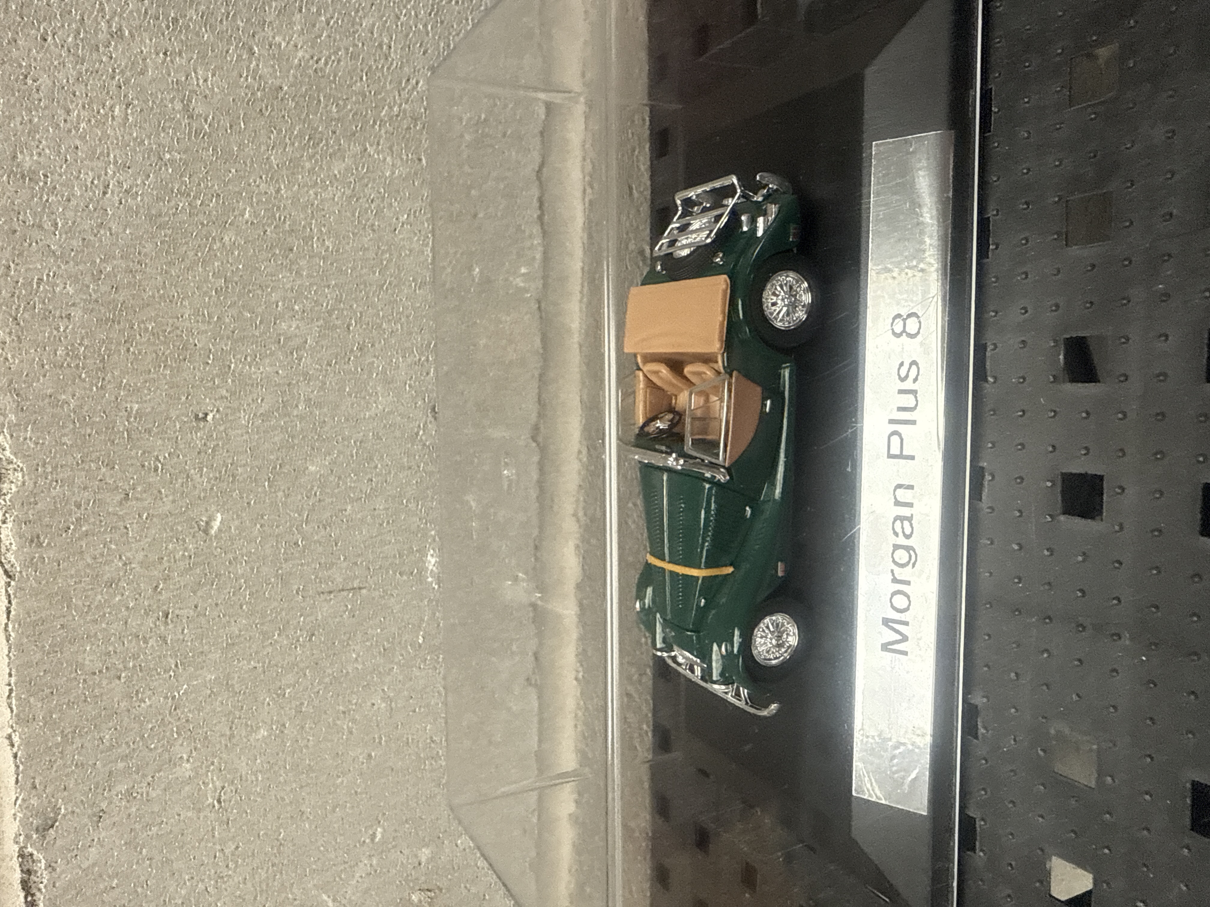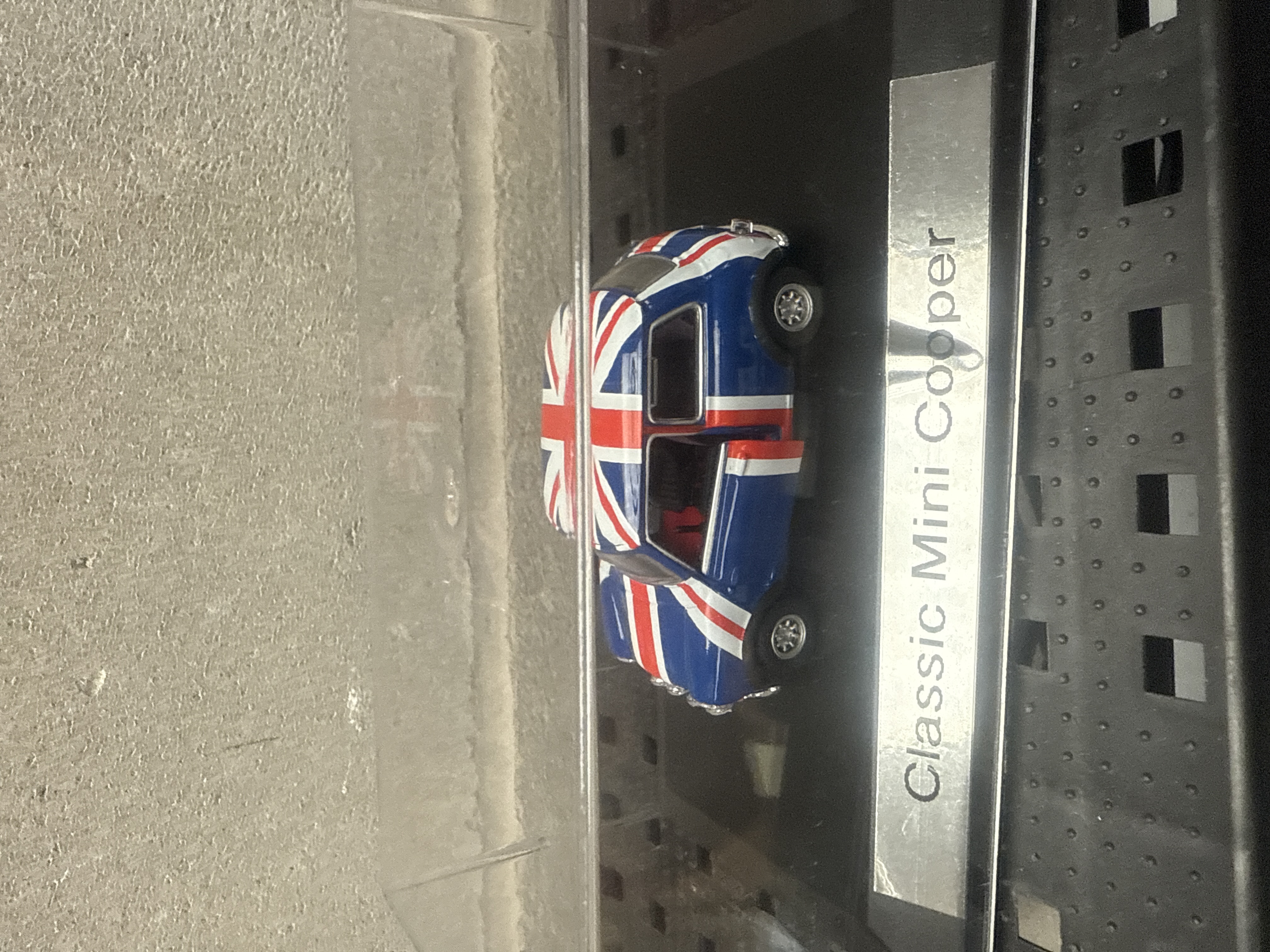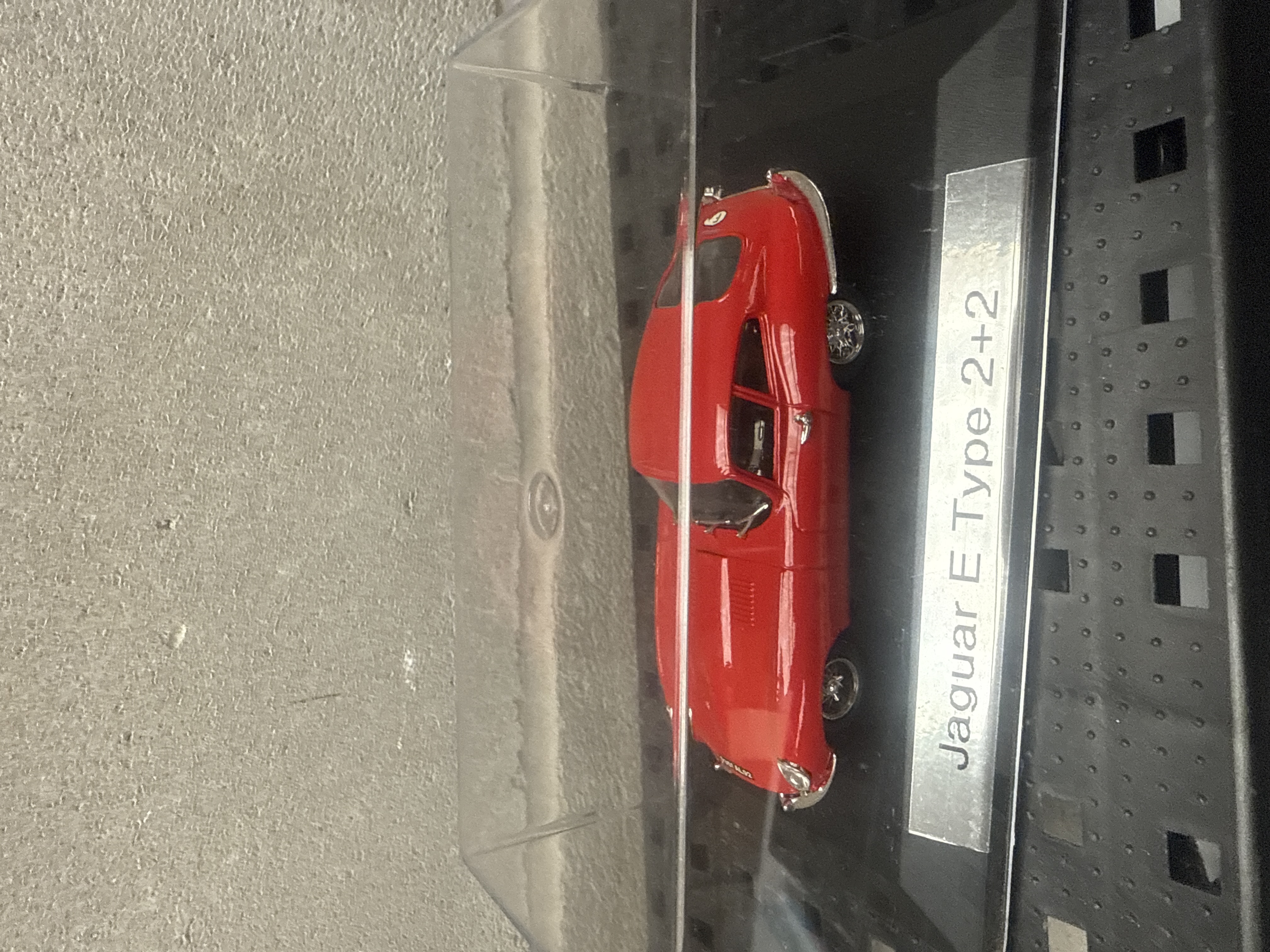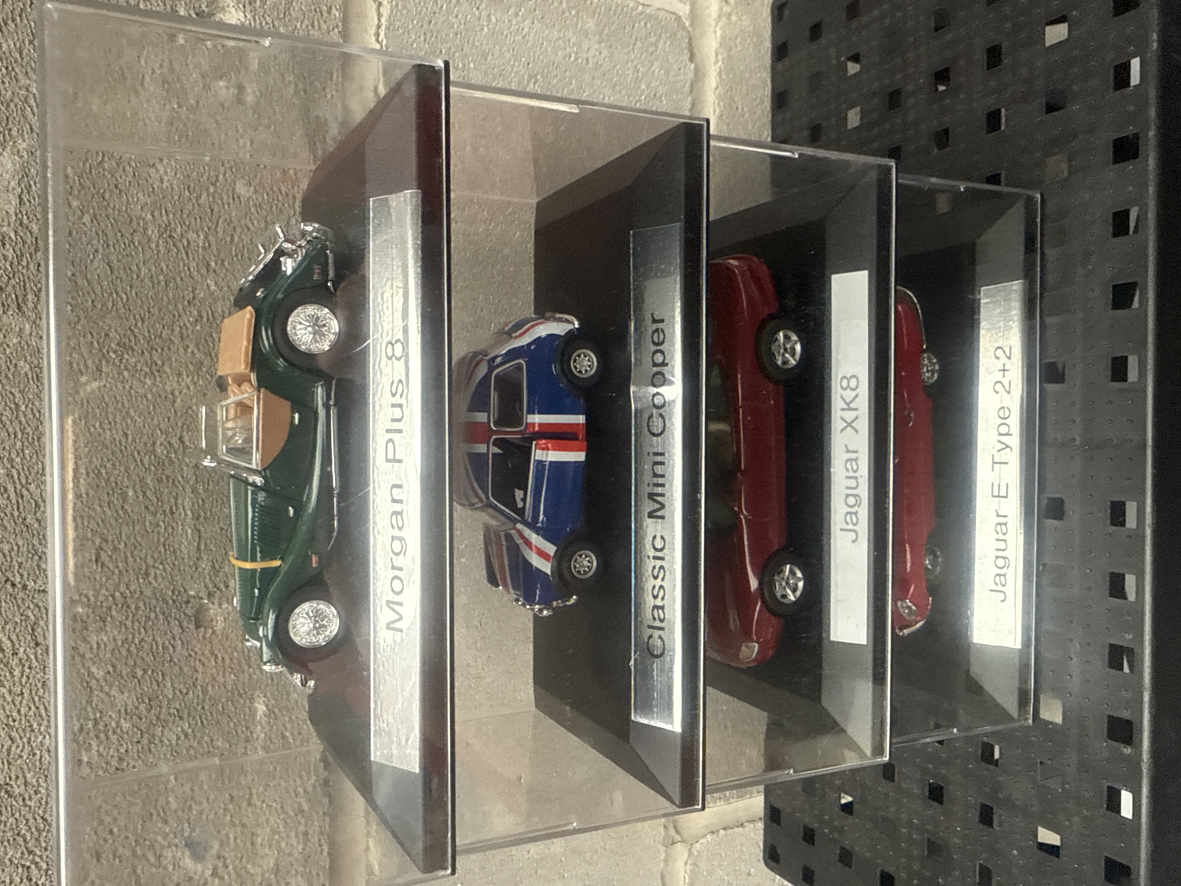 A collection of four 1:43 scale die-cast model cars, each individually housed within a clear acrylic display case atop a black base with a silver-toned nameplate. The models, representing iconic British automobiles, include: a green Morgan Plus 8 open-top touring car with a tan interior; a blue, white, and red ‘Classic Mini Cooper’ adorned with a Union Jack flag motif; a red Jaguar XK8 coupé; and a red Jaguar E Type 2+2 coupé. All models are constructed from a combination of die-cast metal and plastic.