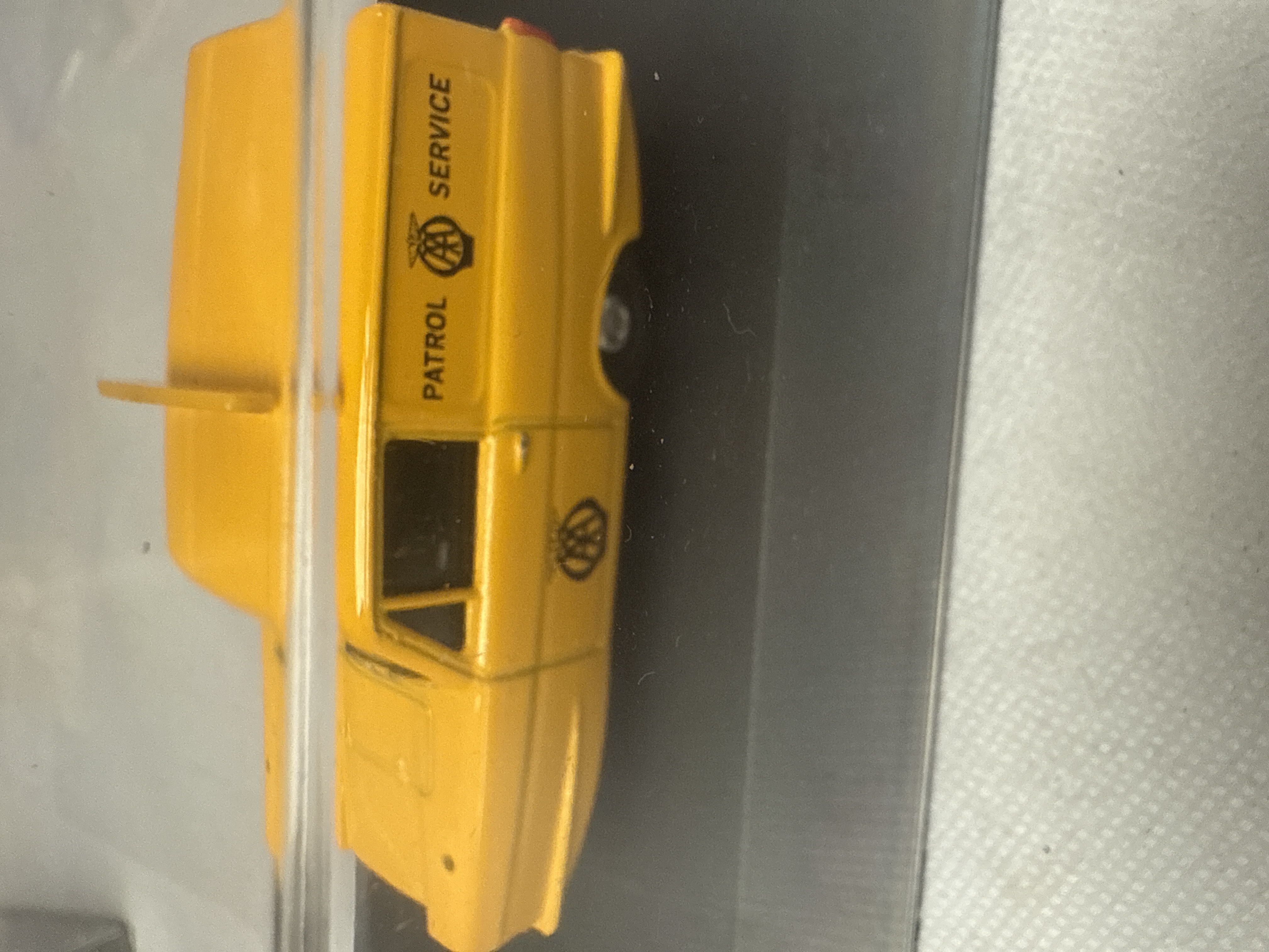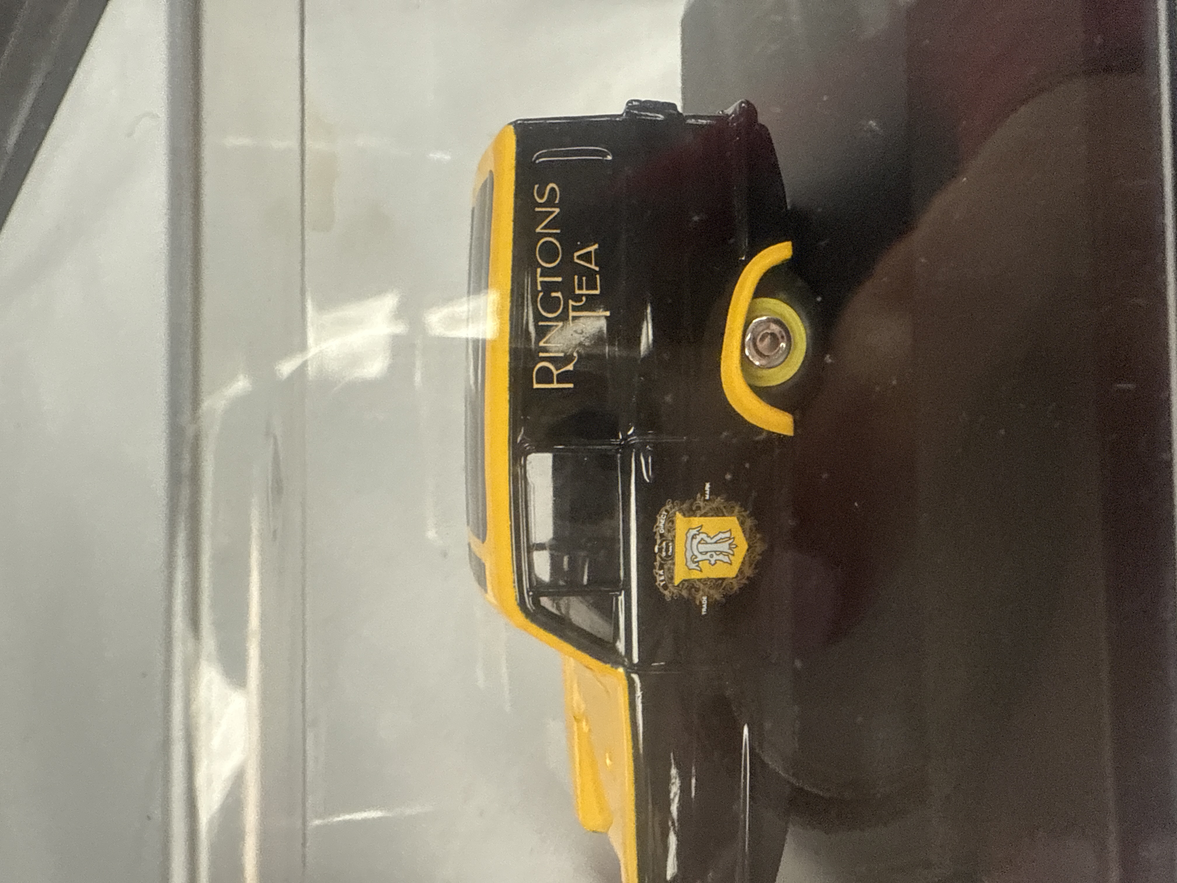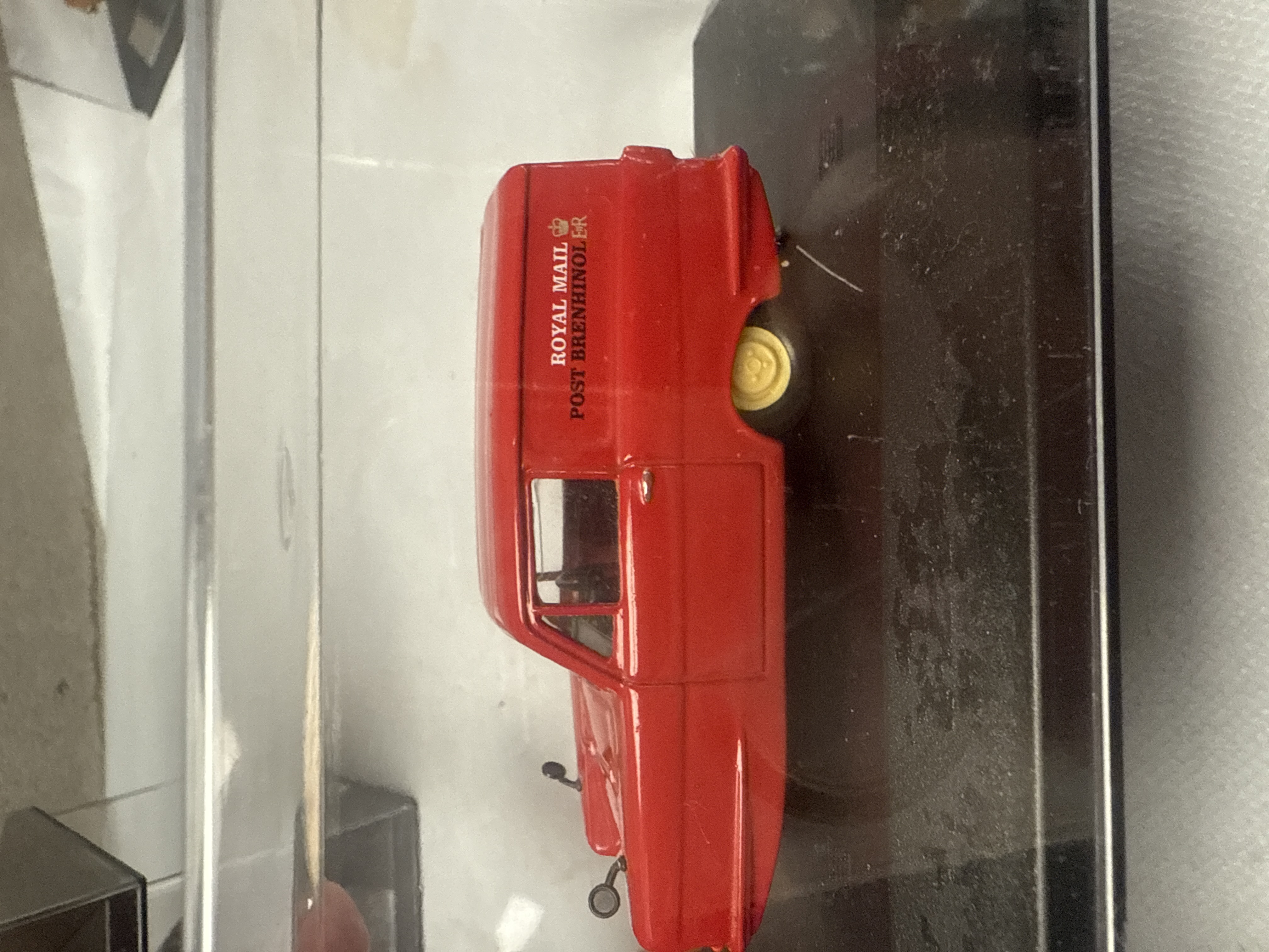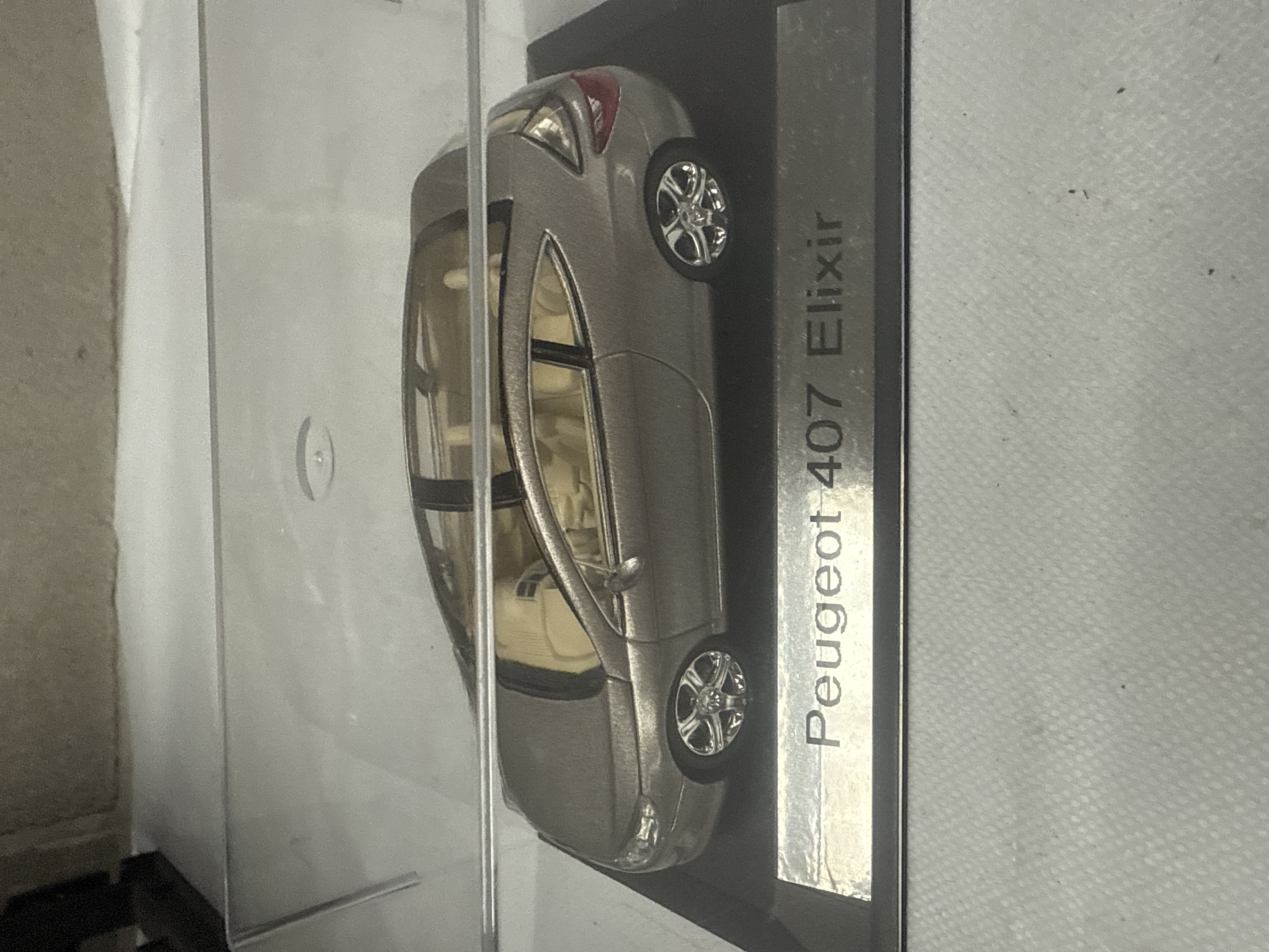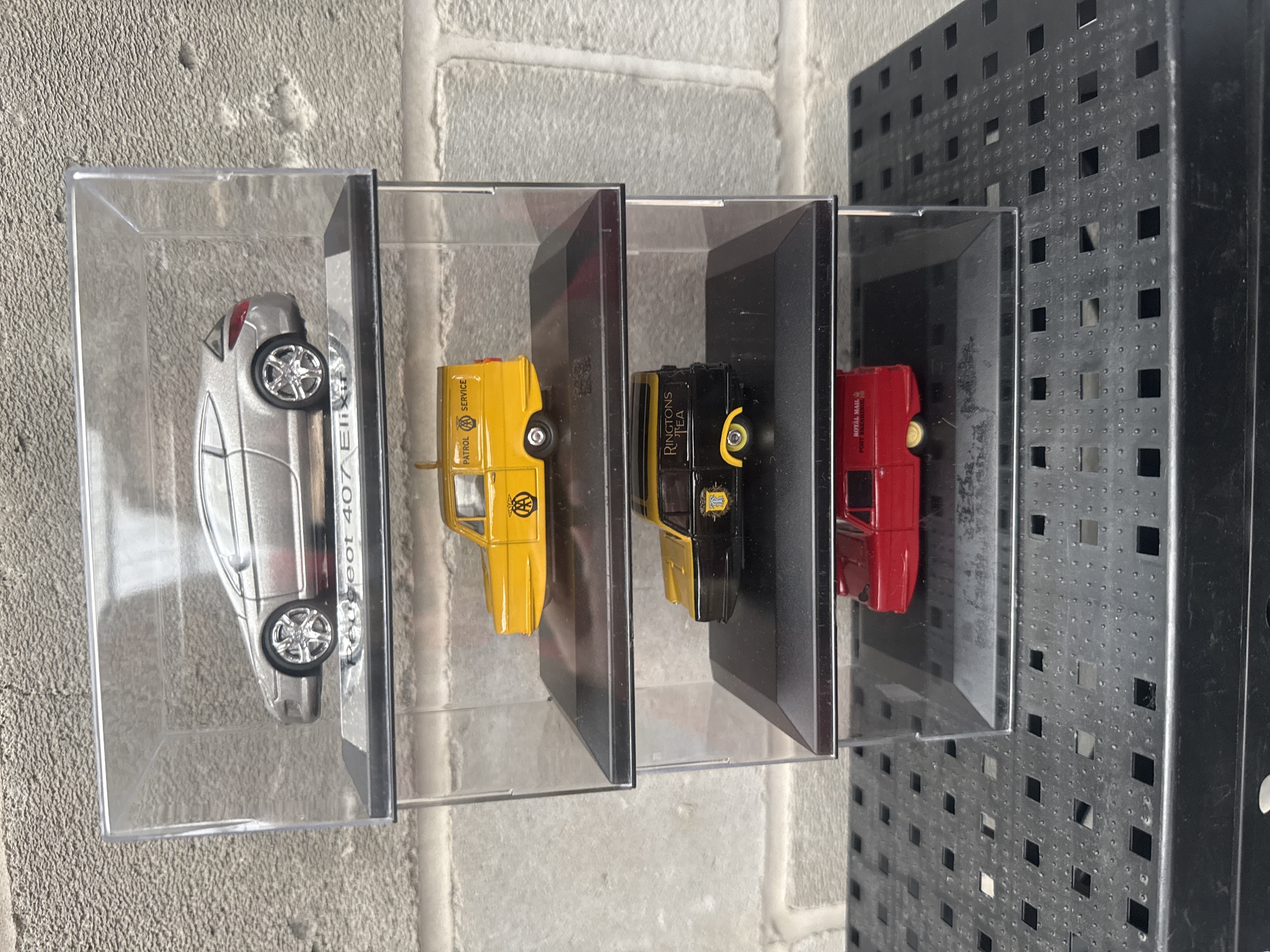A set of four die-cast model vehicles, each presented within individual clear plastic display cases with dark bases. The lot includes a silver Peugeot 407 Elixir coupe. Also featured are three smaller, vintage-style van models: a yellow van marked ‘PATROL AA SERVICE’ with the AA logo; a black and yellow van featuring ‘RINGTONS TEA’ and a heraldic crest; and a red van marked ‘ROYAL MAIL’ with a crown emblem, also bearing the Welsh inscription ‘POST BRENINOLER’ (Royal Mail). All models are constructed from metal with plastic components.