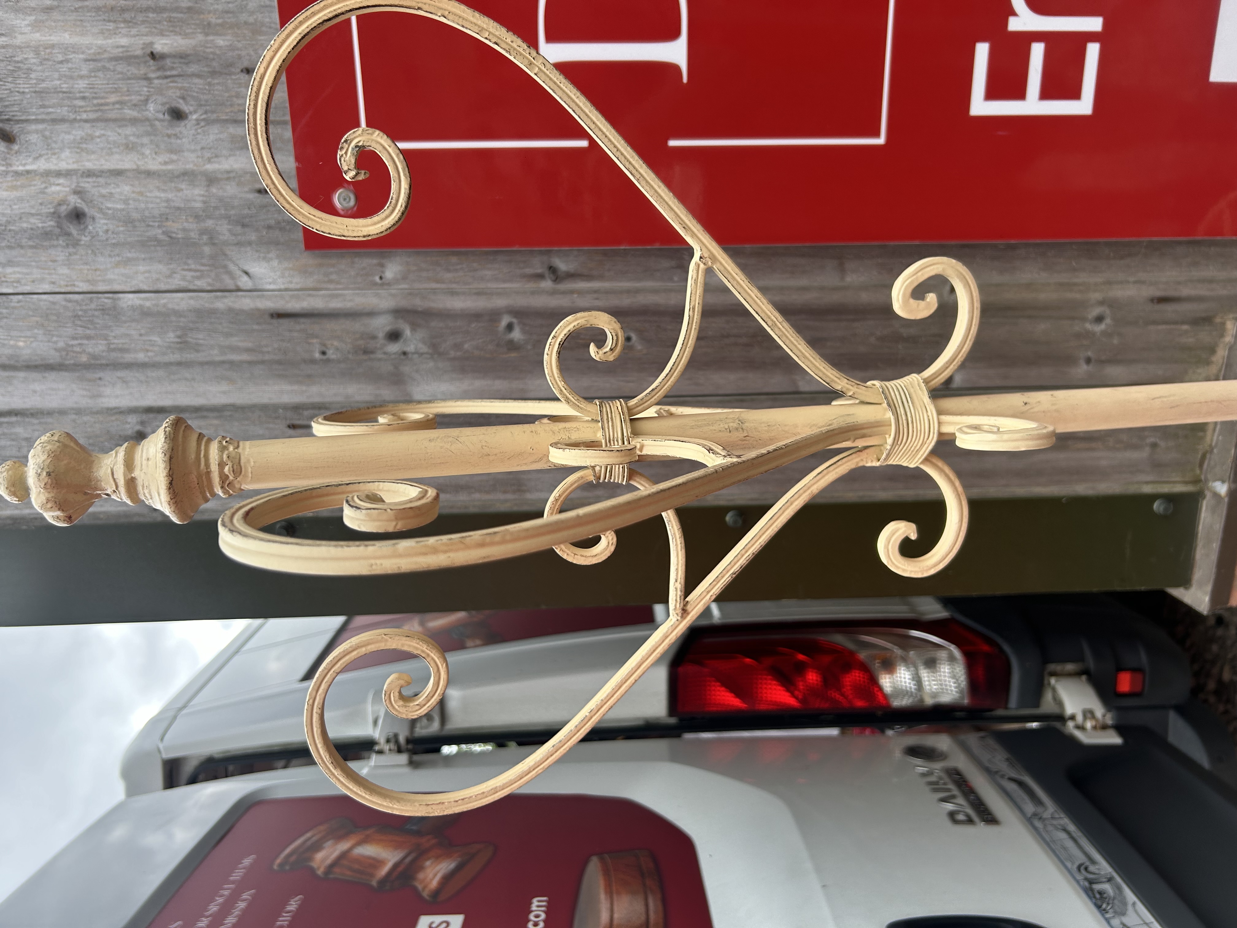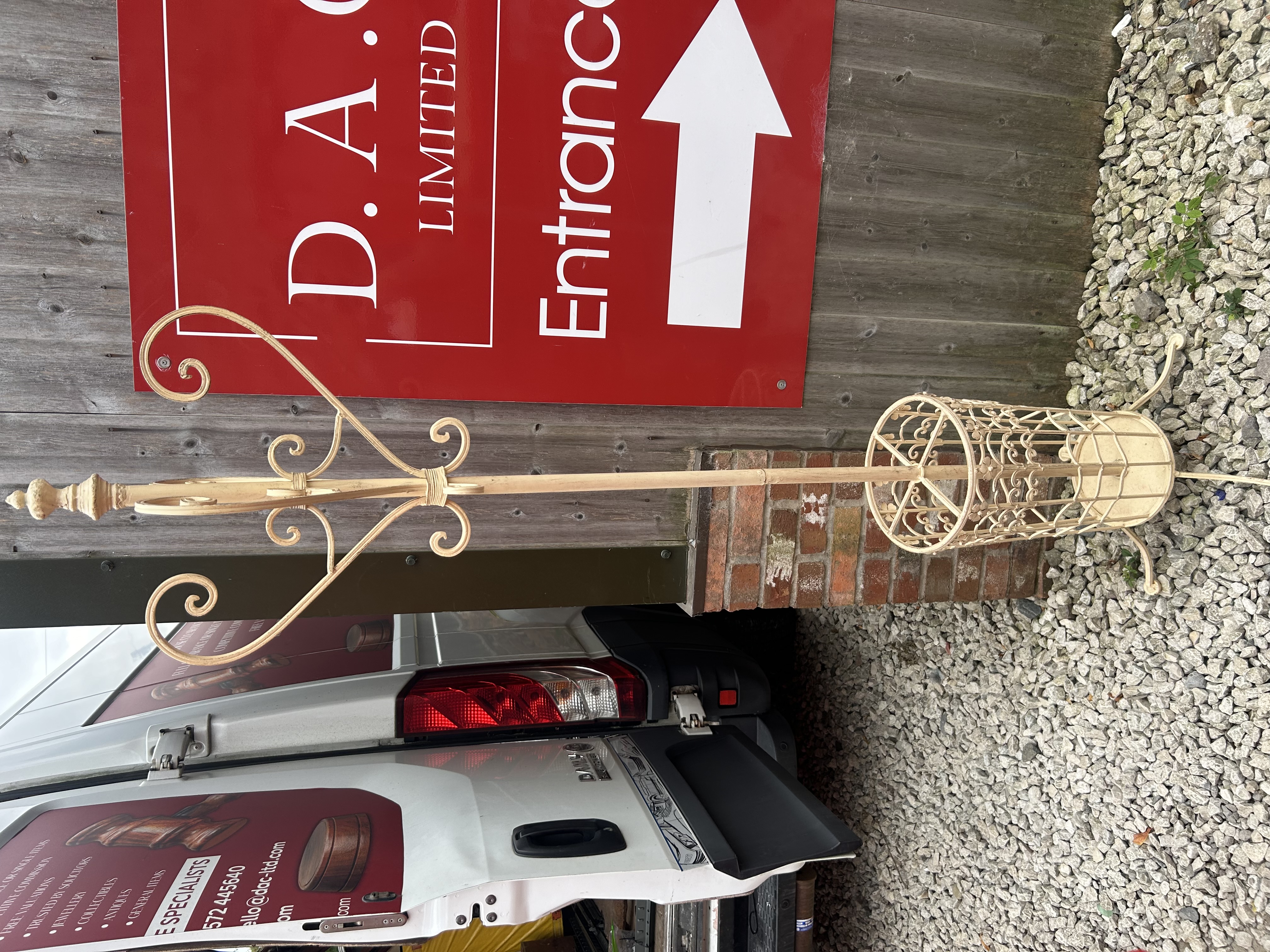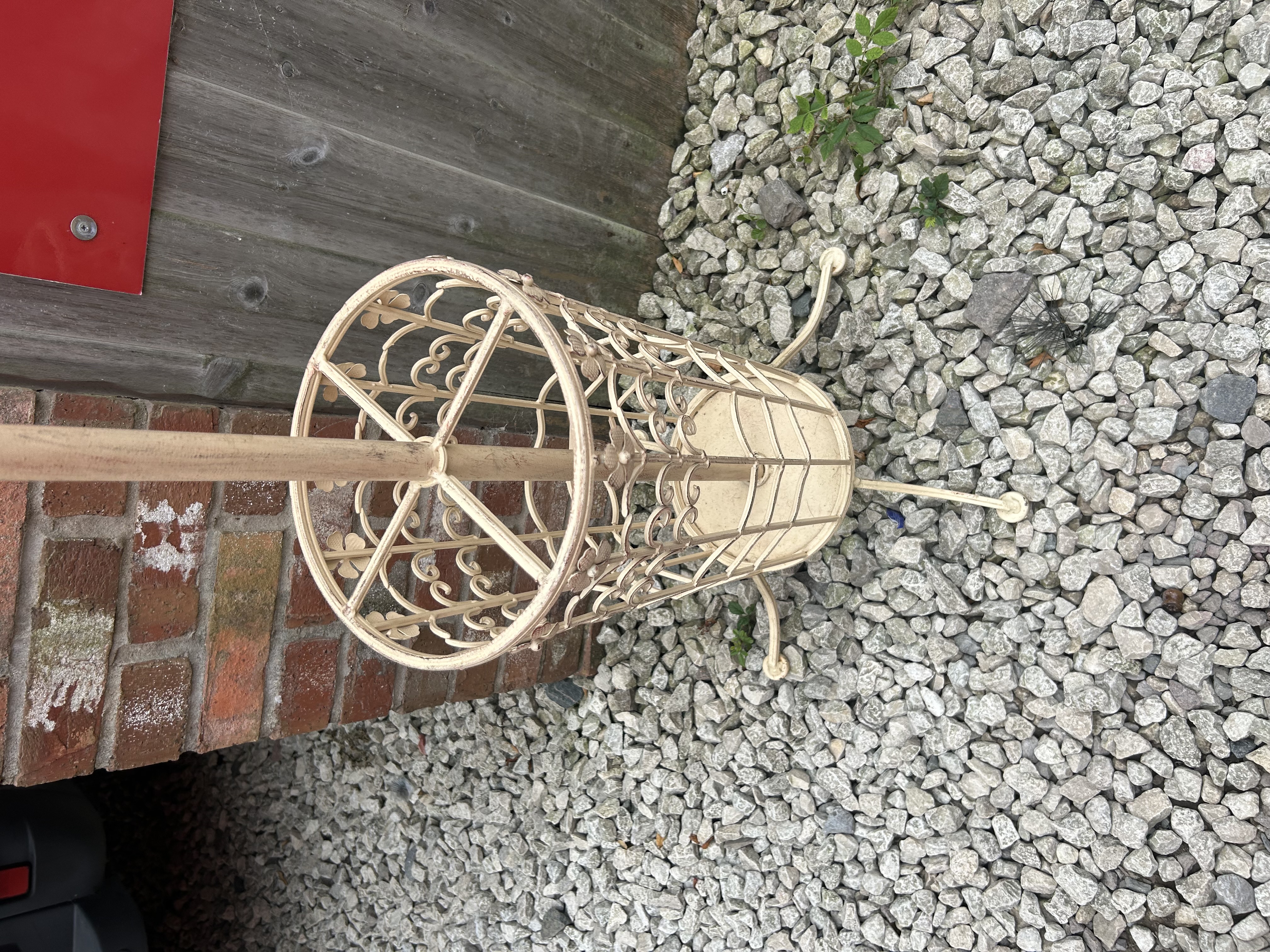 A cream-painted wrought iron coat and umbrella stand, featuring a central standard topped with a finial. Four decorative, scrolled arms extend outwards, forming heart-shaped coat hooks, while the base incorporates a circular, cage-like umbrella holder with matching scrolled openwork, supported by four splayed feet. The piece is finished in a light cream or beige paint. No visible manufacturer marks or text are present.