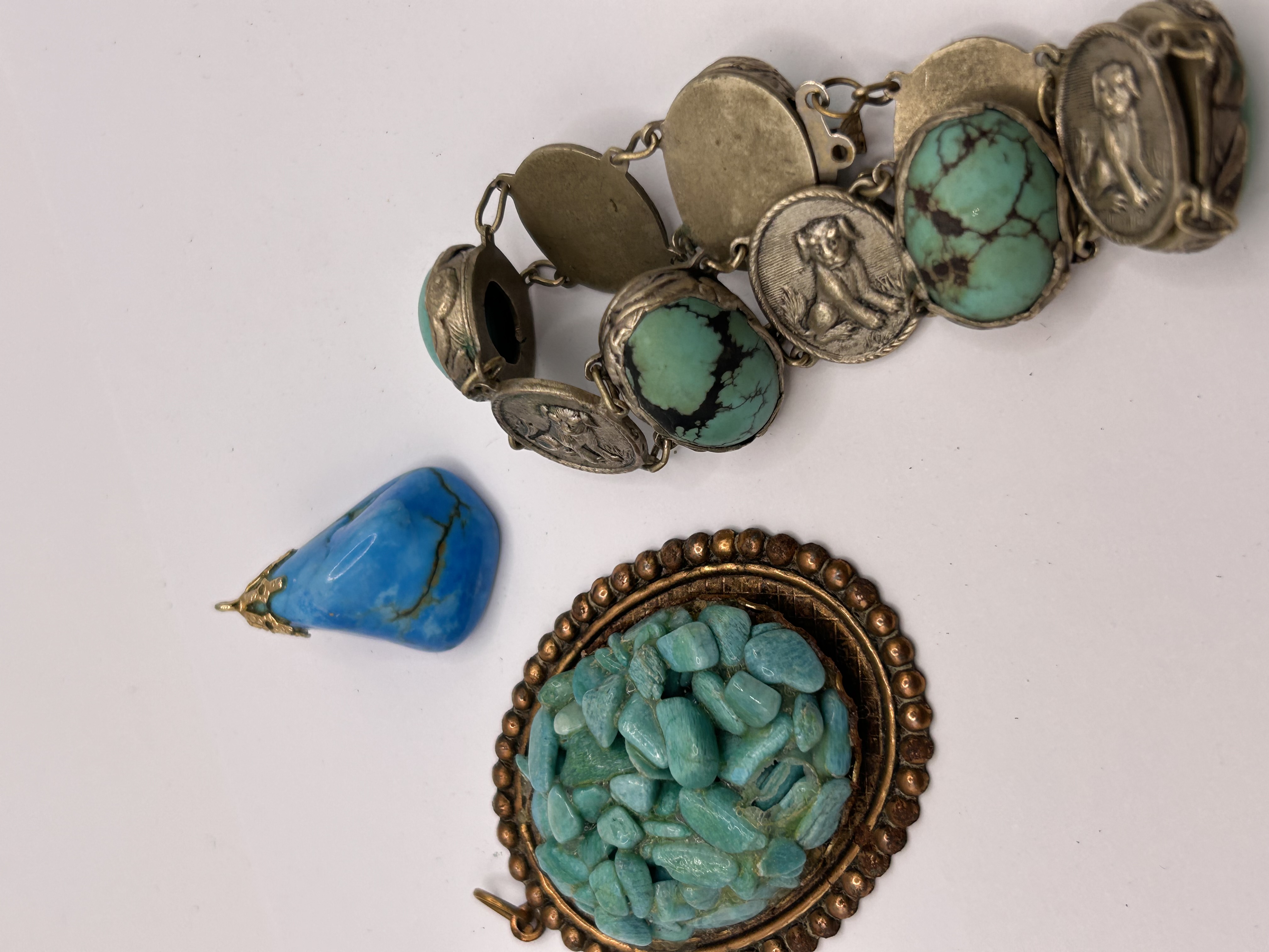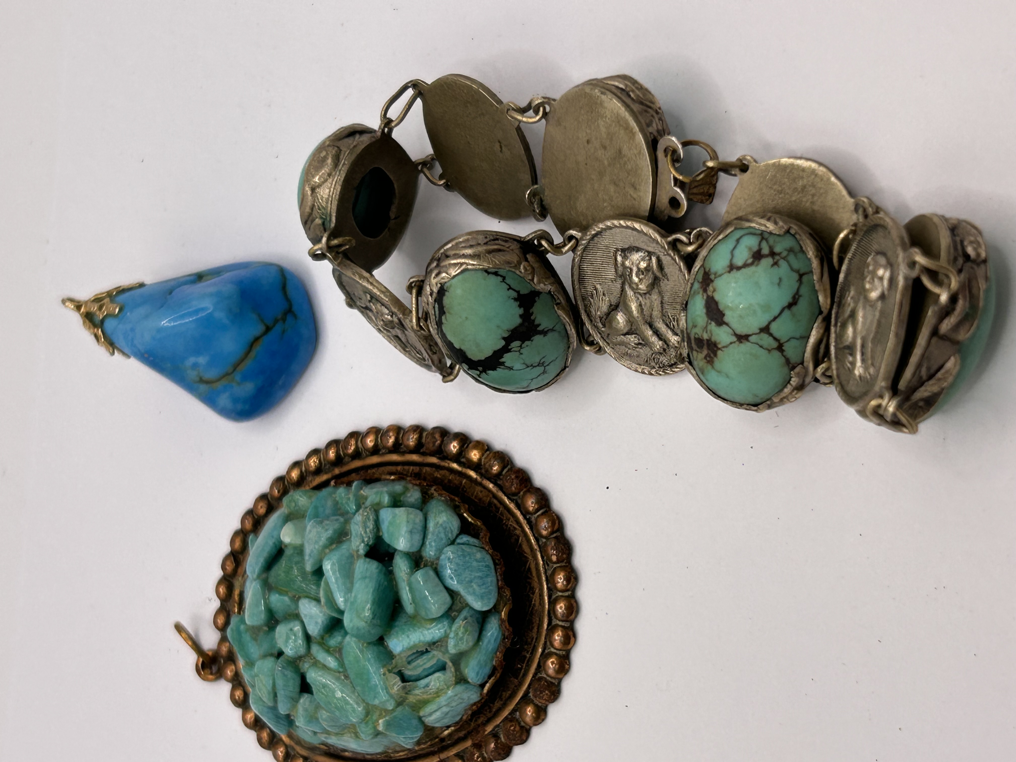 An Arts & Crafts Revival sterling silver link bracelet, featuring alternating oval cabochon turquoise gemstones with significant dark matrix and links embossed with classical figures. The silver-toned metal exhibits a rich patina consistent with age. Accompanying this is an antique brass or bronze-toned oval pendant or brooch, set with a dense cluster of numerous small, irregular, tumbled light blue-green opaque turquoise gemstones. The metal setting is textured and shows significant patina. Also included is a smaller pendant with a gold-toned bail, suspending a single, irregular, vibrant blue opaque turquoise gemstone with prominent dark matrix.