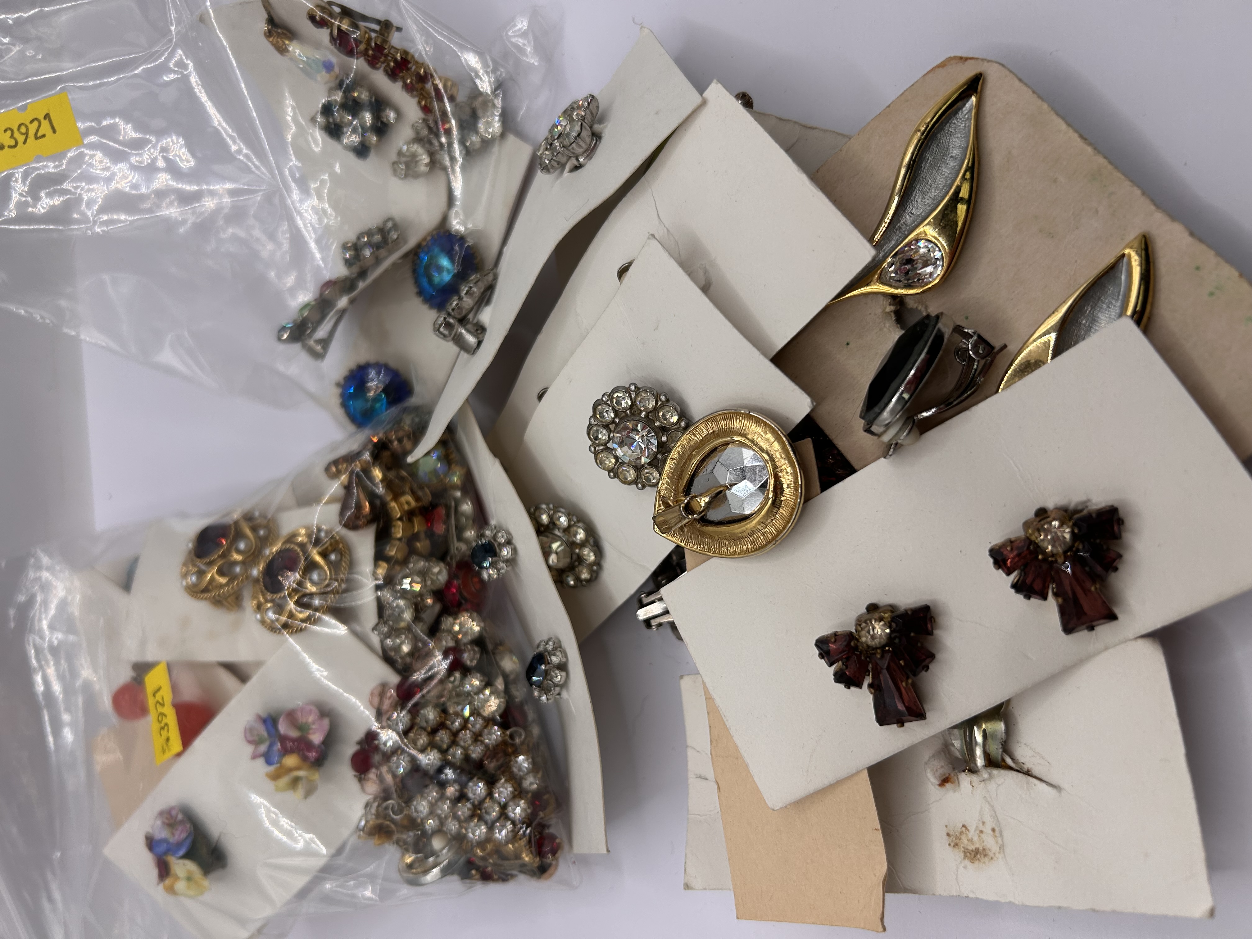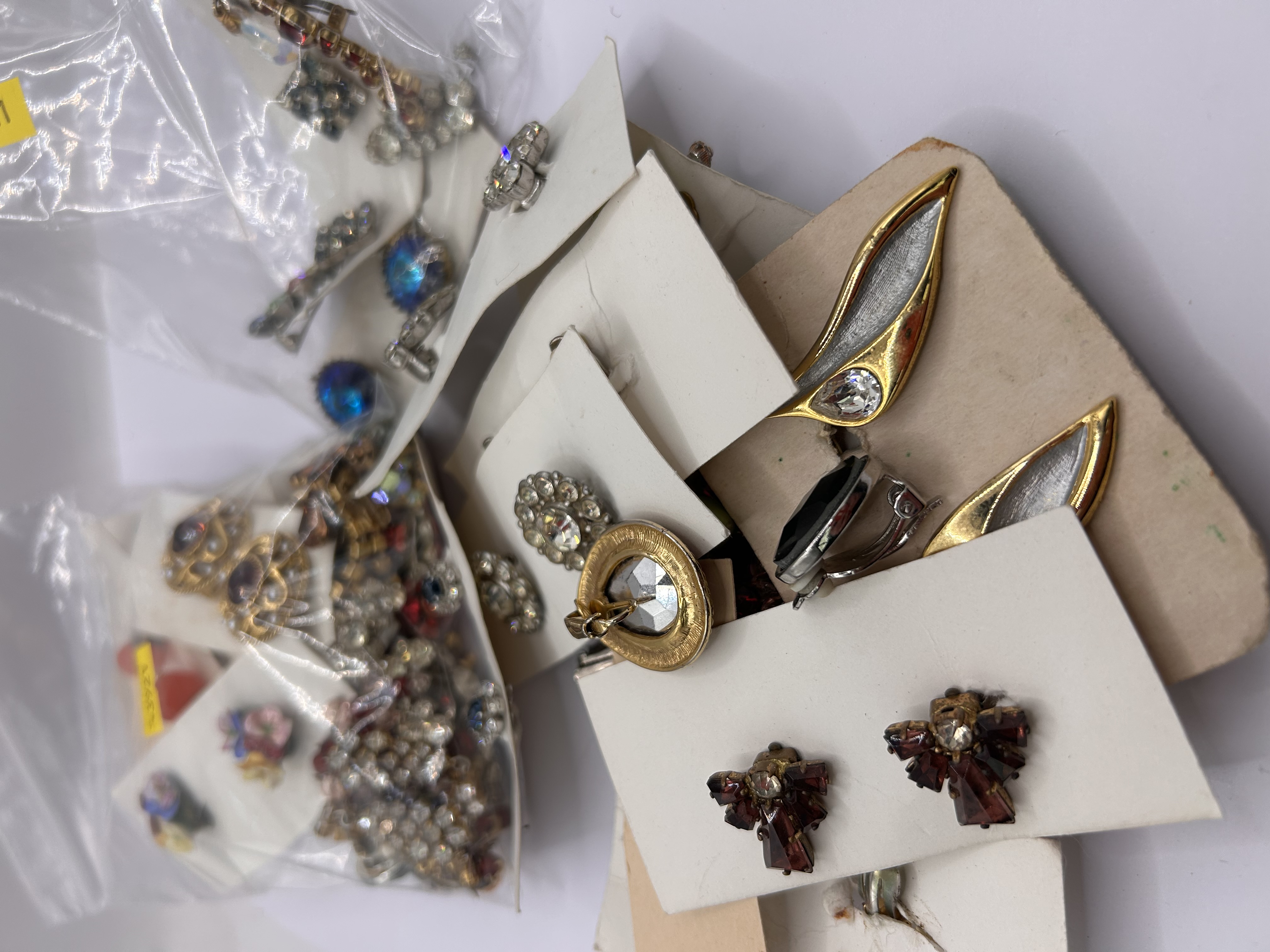 A collection of approximately 20-30 pieces of vintage costume jewellery, primarily clip-on earrings, with some pieces potentially being brooches or pins. The items are crafted from both gold-toned and silver-toned base metals. Adorning the pieces are numerous clear, red/maroon, blue, and multi-coloured faceted rhinestones, set in various cuts such as round brilliant, pear, and baguette. Some pieces may also feature glass cabochons. The overall style suggests a mid-20th century vintage aesthetic, likely dating from the 1940s-1970s. Many pieces are presented on plain card stock or in clear plastic bags. no specific maker’s marks or hallmarks are visible on the jewellery itself.