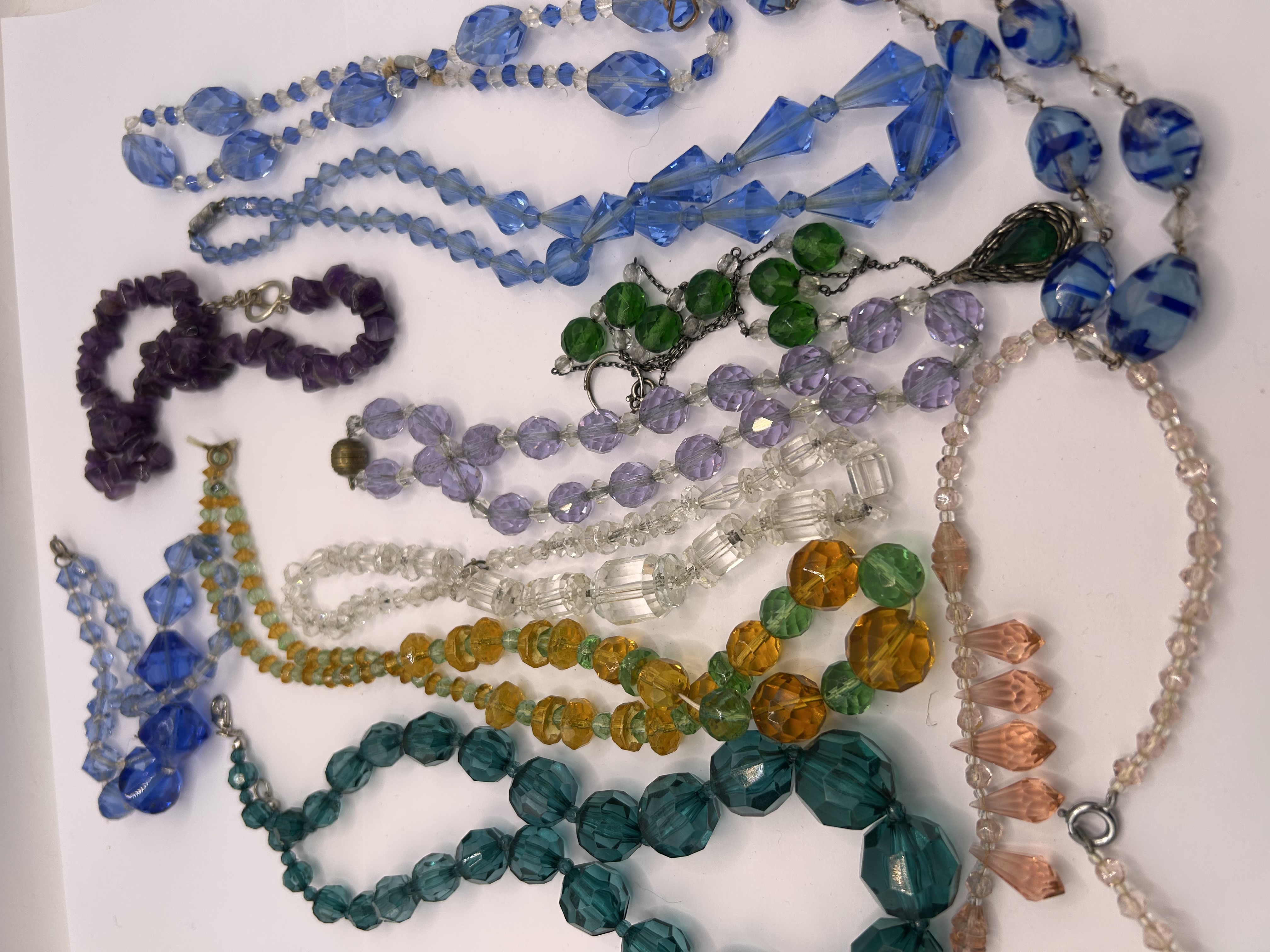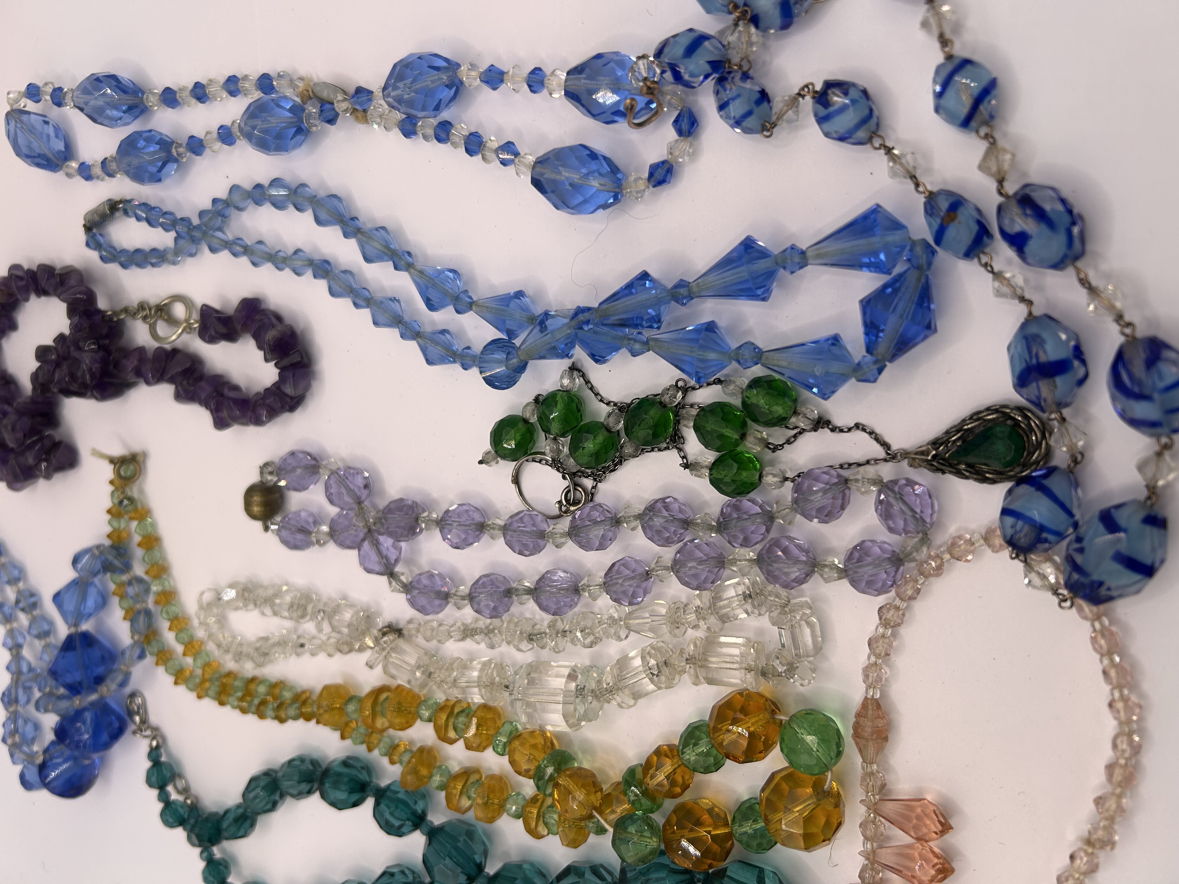 A collection of vintage beaded jewelry, primarily comprising approximately ten or more necklaces and possibly a few bracelets, featuring a diverse array of glass beads in various shades of blue (ranging from light to royal), purple, lavender, green, yellow, amber, clear, and light pink/peach. The beads exhibit multiple cuts including faceted rondelles, briolettes, rounds, geometric shapes, and some irregular, polished chip-like forms. Most visible clasps appear to be silver-tone base metal, with one prominent gold-tone clasp. No visible hallmarks or maker’s marks.