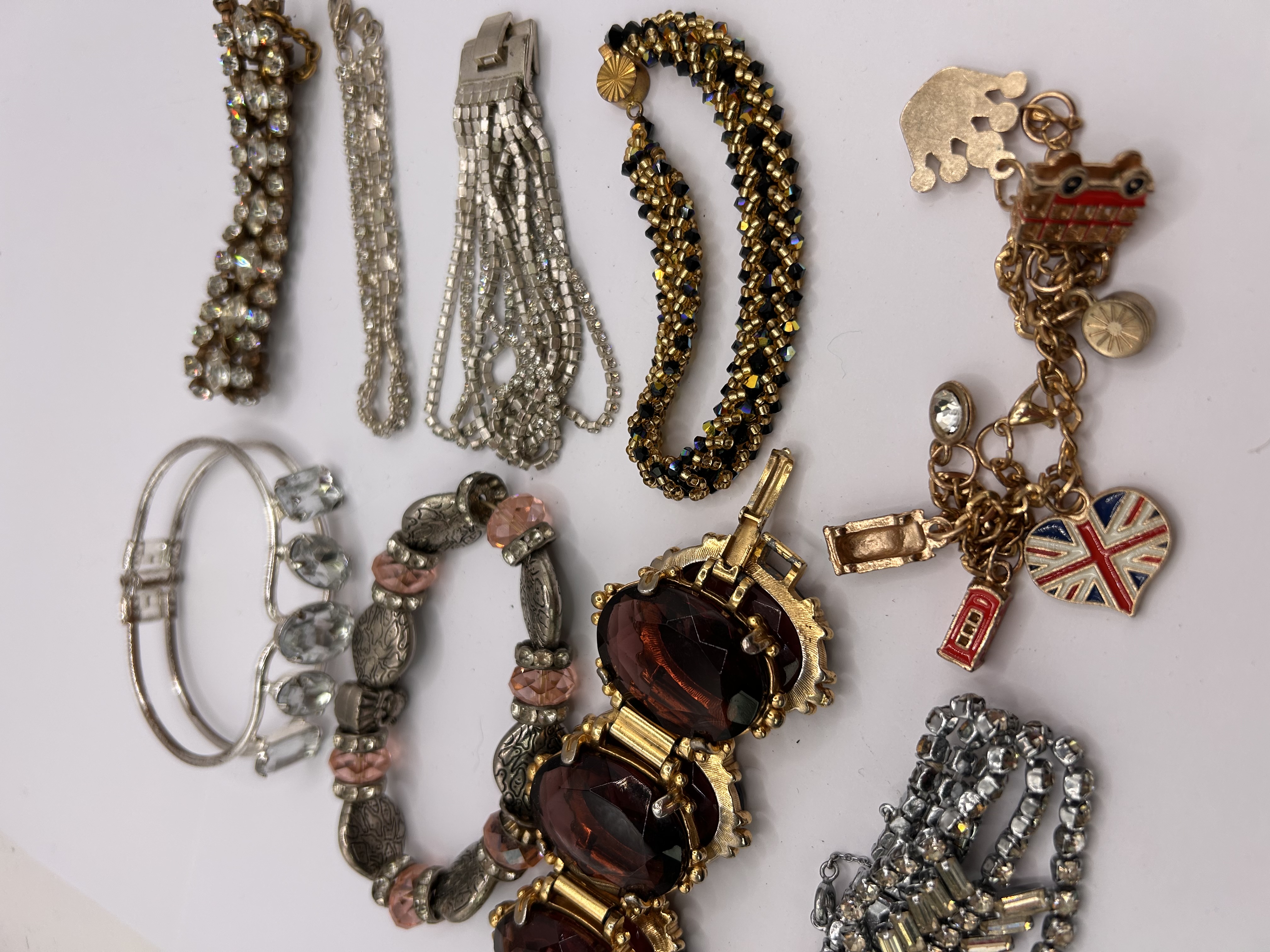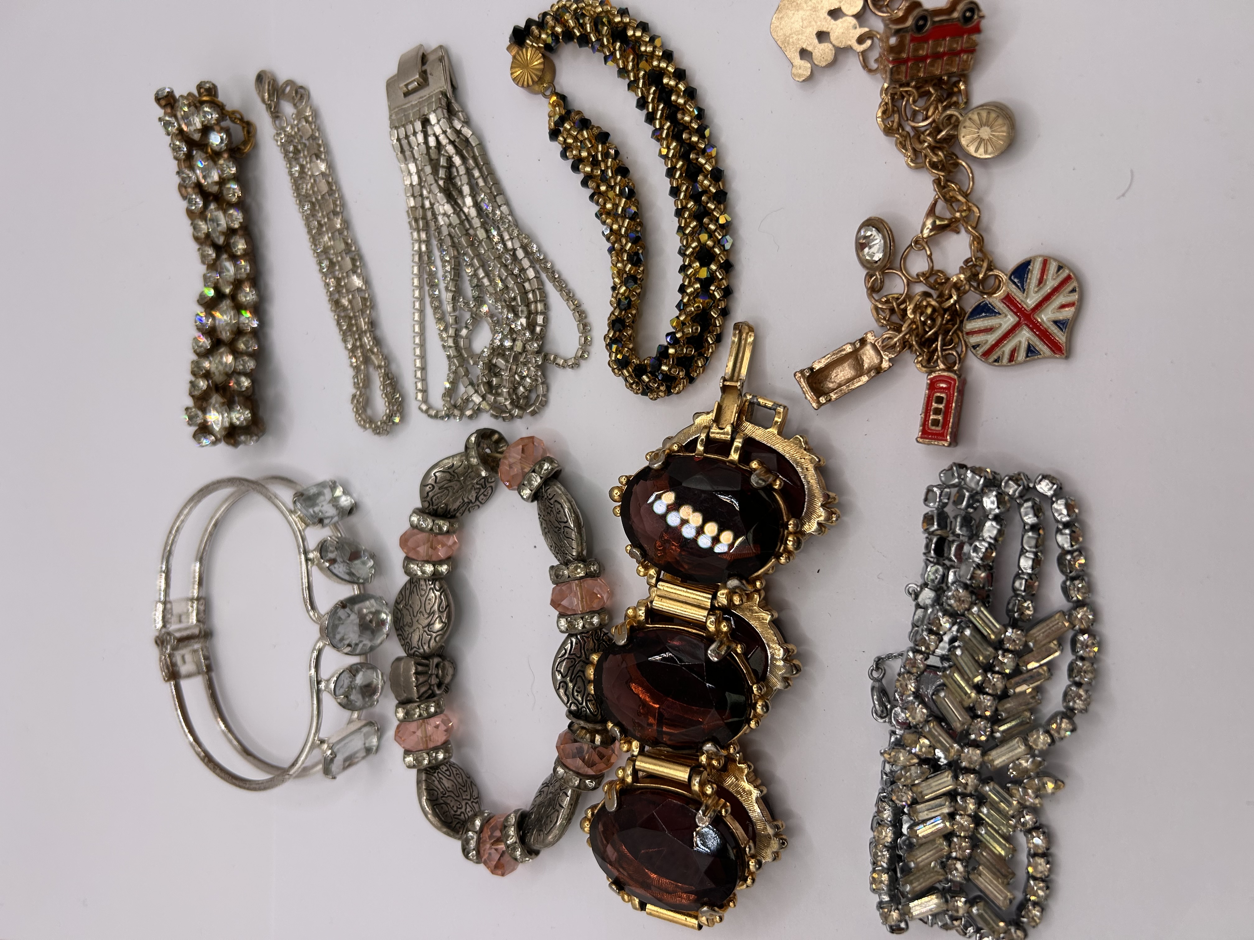 This collection comprises nine diverse vintage-style costume bracelets crafted from various apparent base metals, including silver-tone, gold-tone, and antique silver-tone finishes. The group includes: