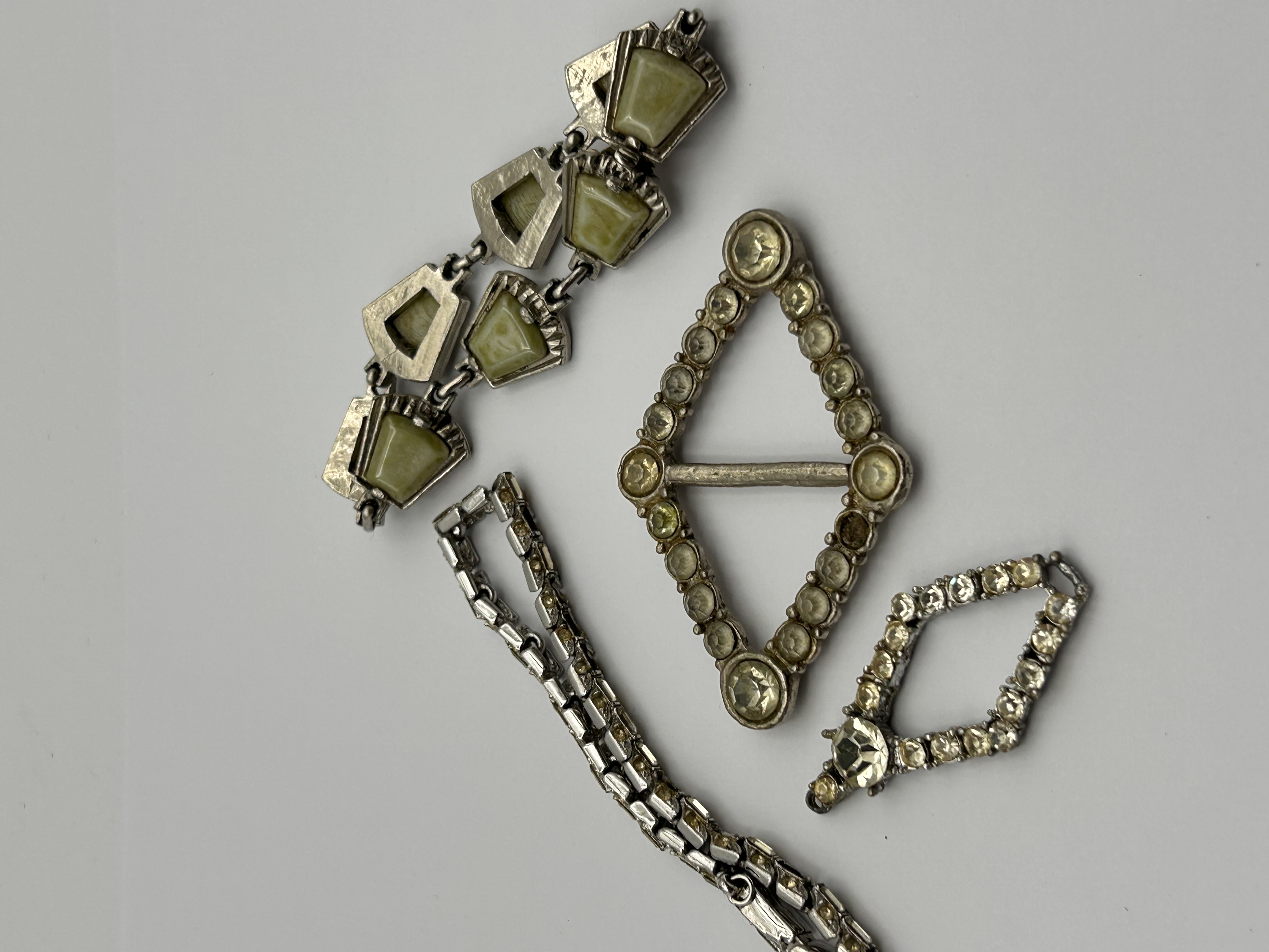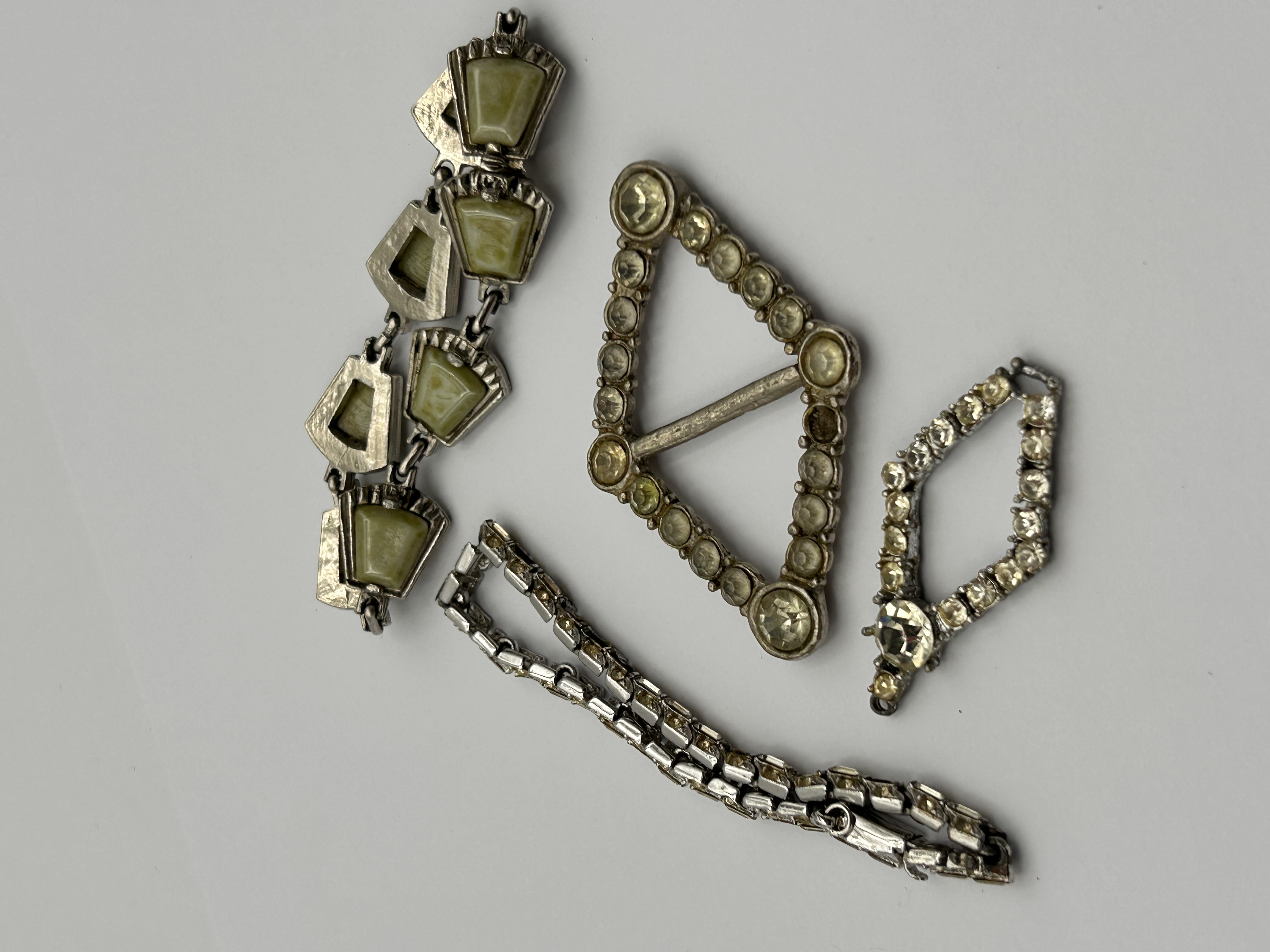 A collection of four vintage costume jewelry components, crafted from silver-tone base metal. The largest item is a segment of a bracelet or necklace, featuring six irregular geometric-shaped bezel-set green glass cabochons, exhibiting a muted olive green/chartreuse hue. To its left is a segment of a flexible link bracelet, adorned with numerous small, round, clear faceted paste rhinestones. A prominent triangular buckle is also present, embellished with multiple smaller round, yellowed or amber-toned faceted paste rhinestones around its perimeter and a single larger central clear paste stone set on its bar. The final item is a smaller, elongated decorative element, similarly set with small round, clear faceted paste rhinestones surrounding a larger central clear paste stone. No hallmarks or maker’s marks are visible.