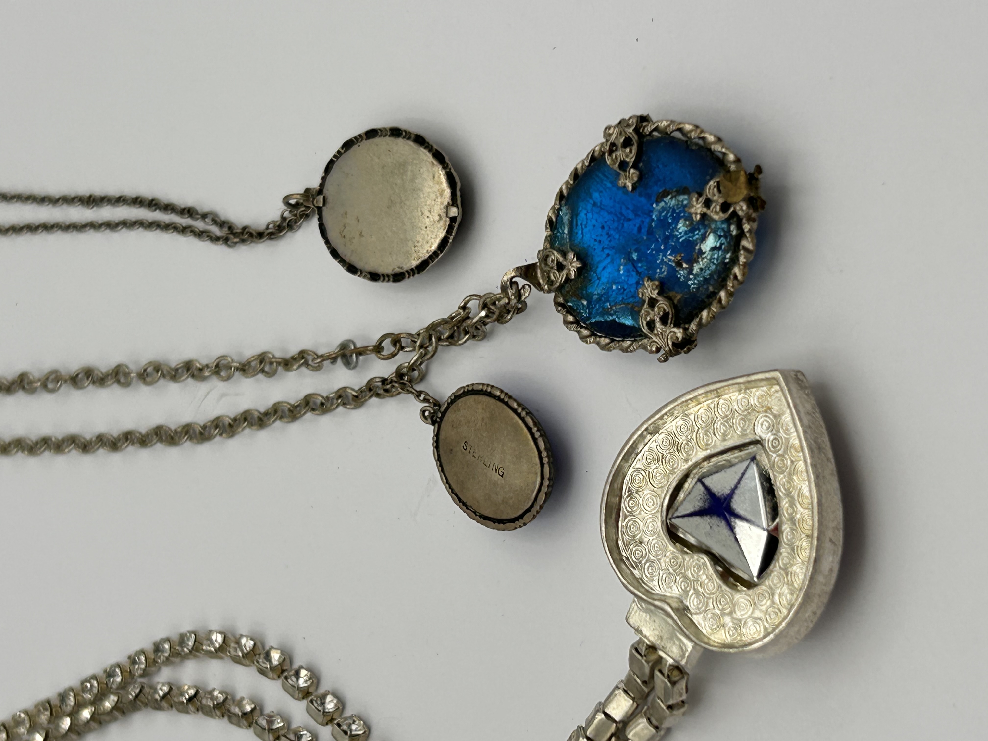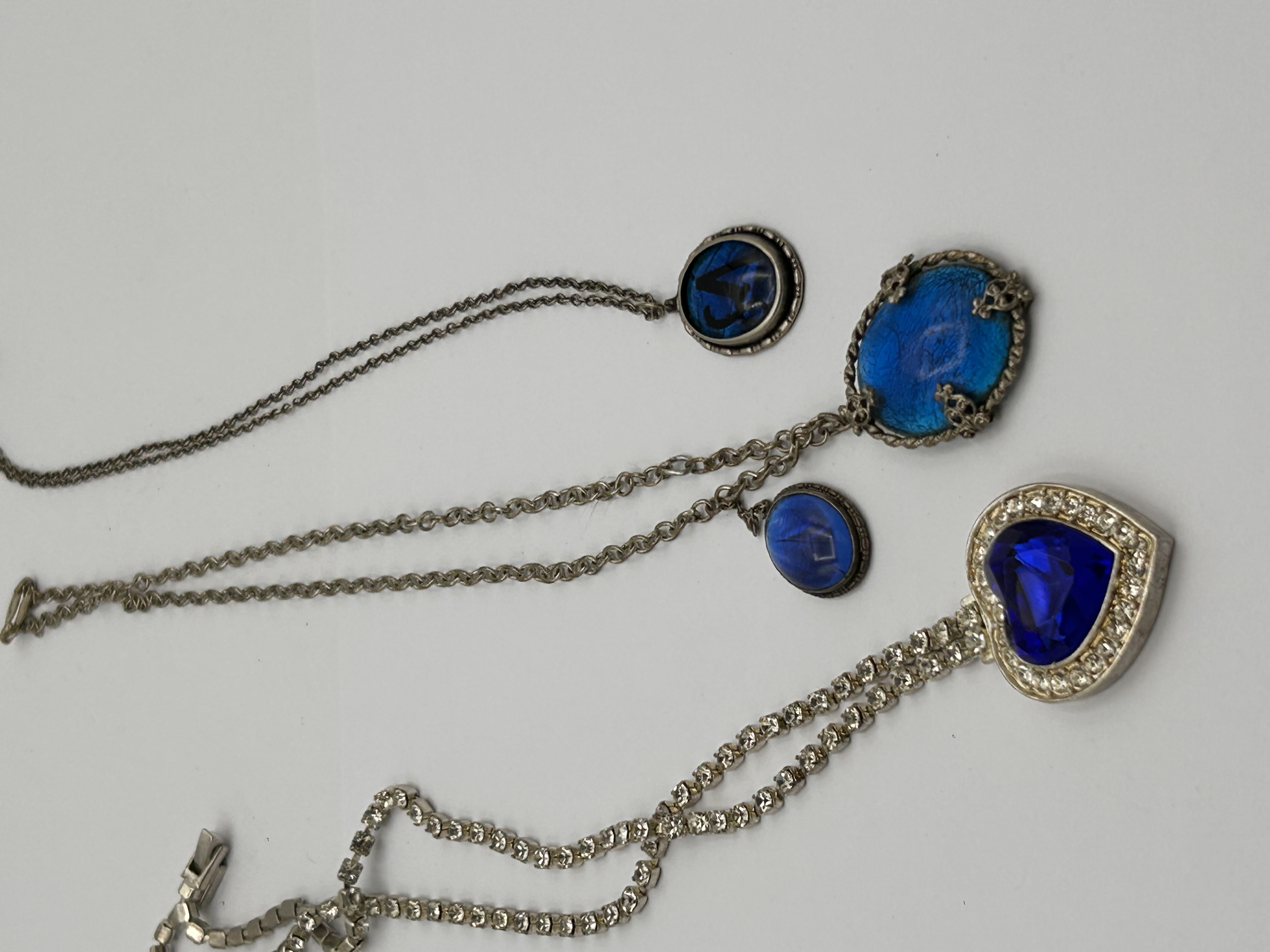 A collection of four necklaces. The first is a ‘Titanic’ Heart of the Ocean style necklace, featuring a large heart-shaped pendant set with a deep blue faceted glass stone, surrounded by numerous small, round faceted clear glass simulants. The pendant is suspended from a ‘tennis necklace’ style chain also set with small, round faceted clear glass simulants. The reverse of the pendant features a small, clear faceted glass simulant set within a star design and an engraved pattern. The metal is silver-colored.
