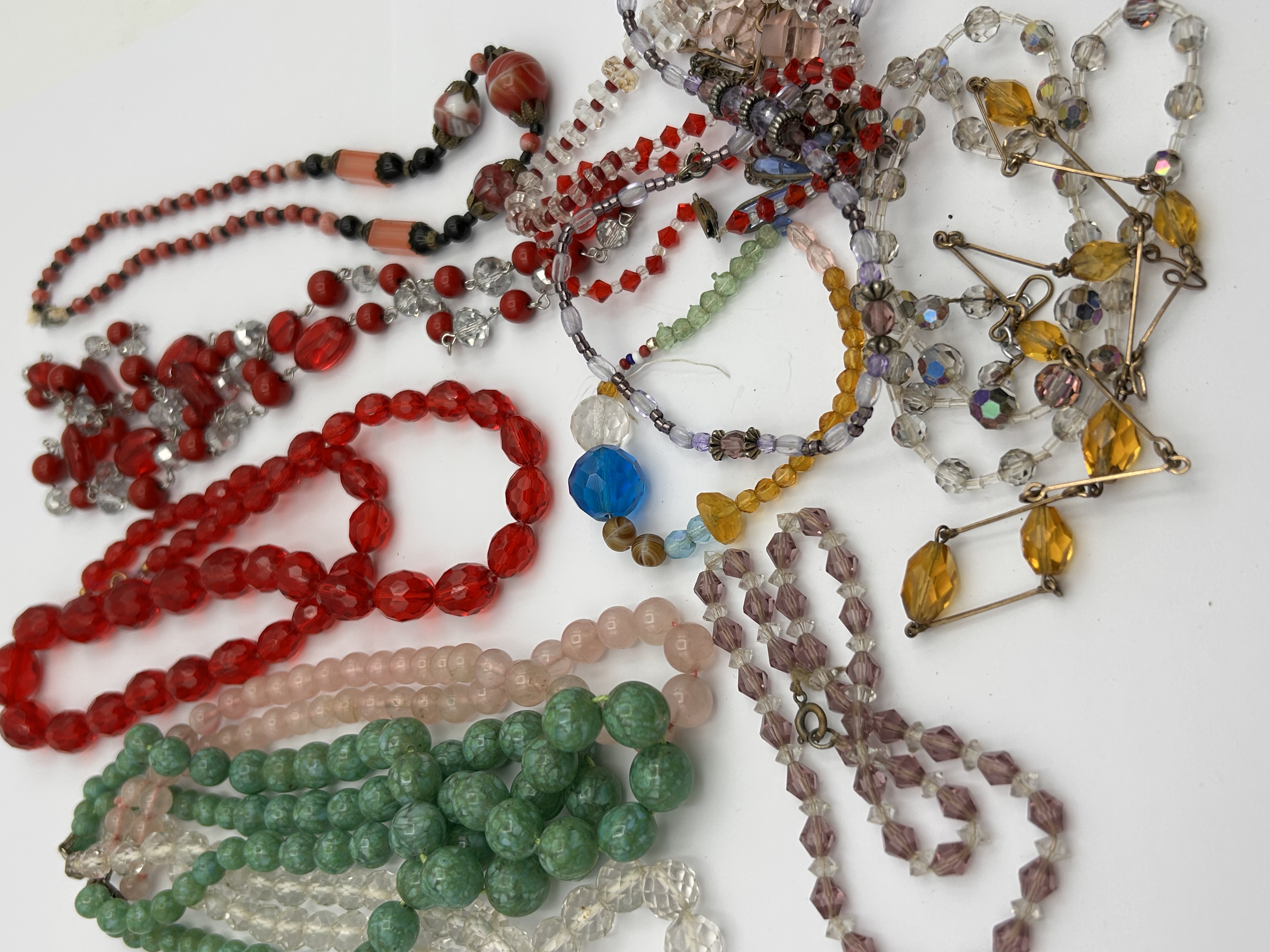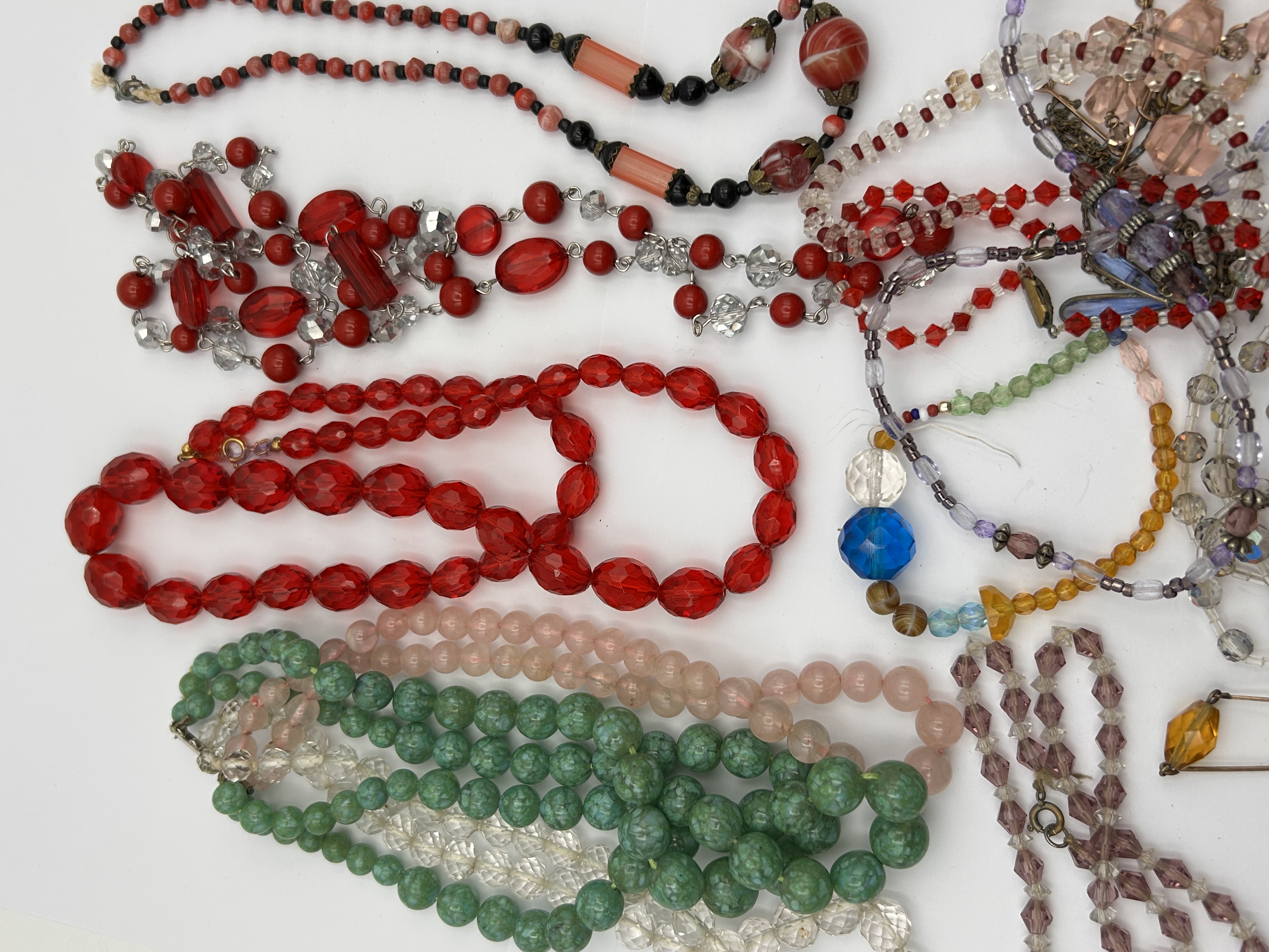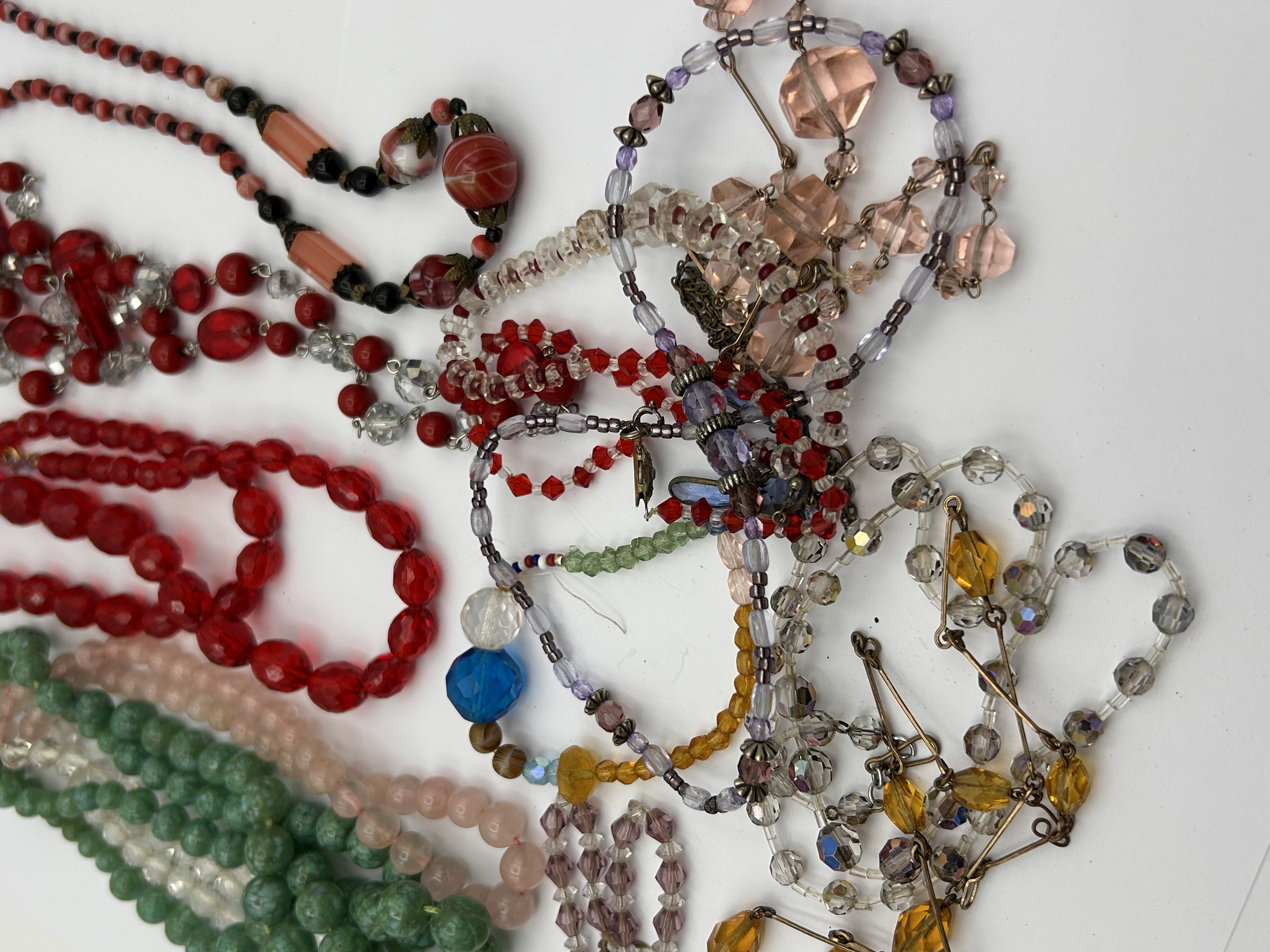 A diverse collection of vintage costume jewellery, predominantly necklaces and some bracelets. The items feature a wide variety of beads, including glass and plastic, in numerous colours such as red, green, pink, clear, purple, yellow, orange, blue, and black. Bead shapes vary significantly, featuring round, oval, faceted, and novelty cuts such as hearts or butterflies. Metal components, including clasps and connectors, are crafted from base metal in both silver-tone and gold-tone finishes. No specific hallmarks or maker’s marks are discernible. The collection presents a diverse range of styles, consistent with a pre-owned assortment of vintage costume jewelry.