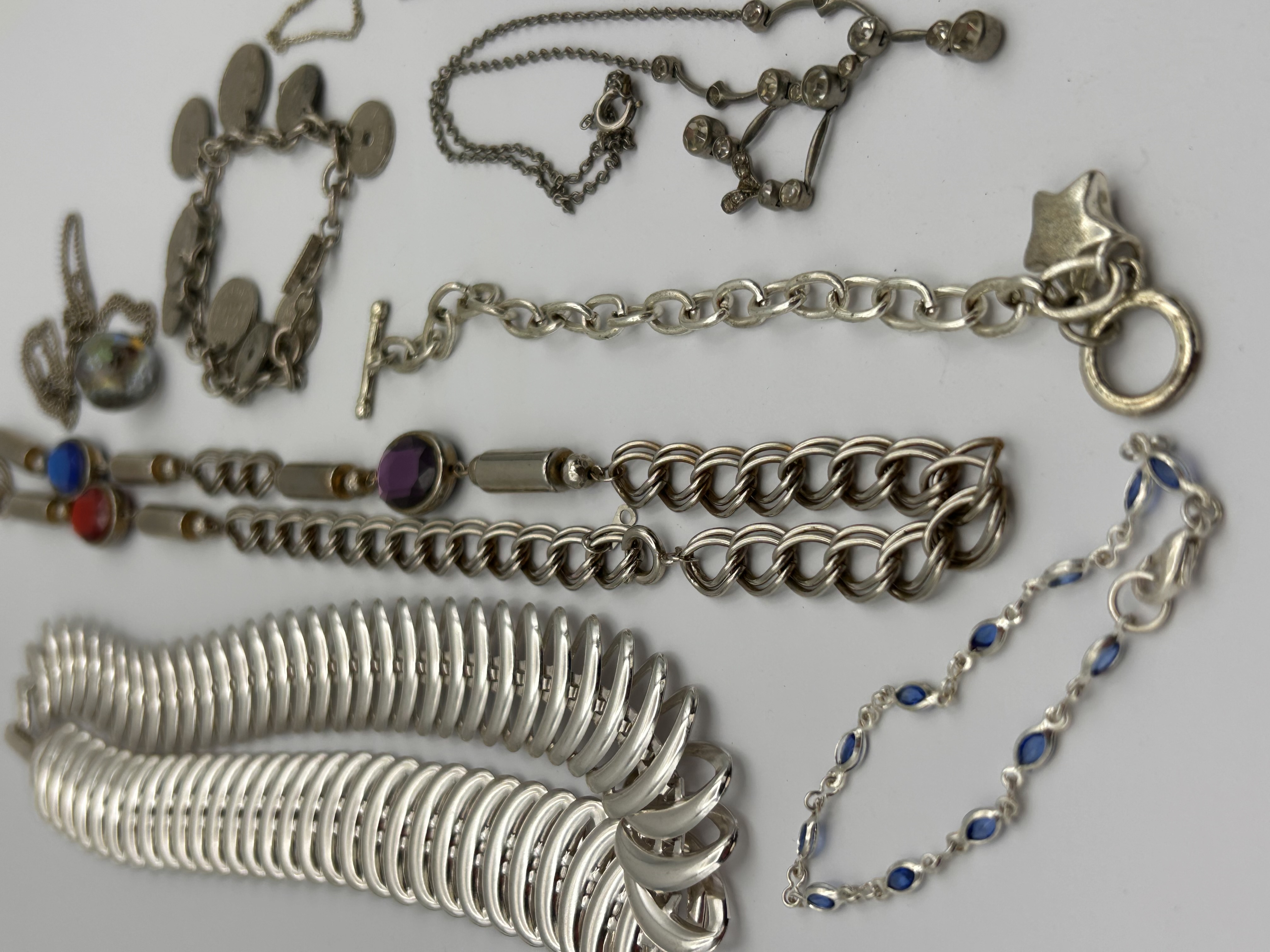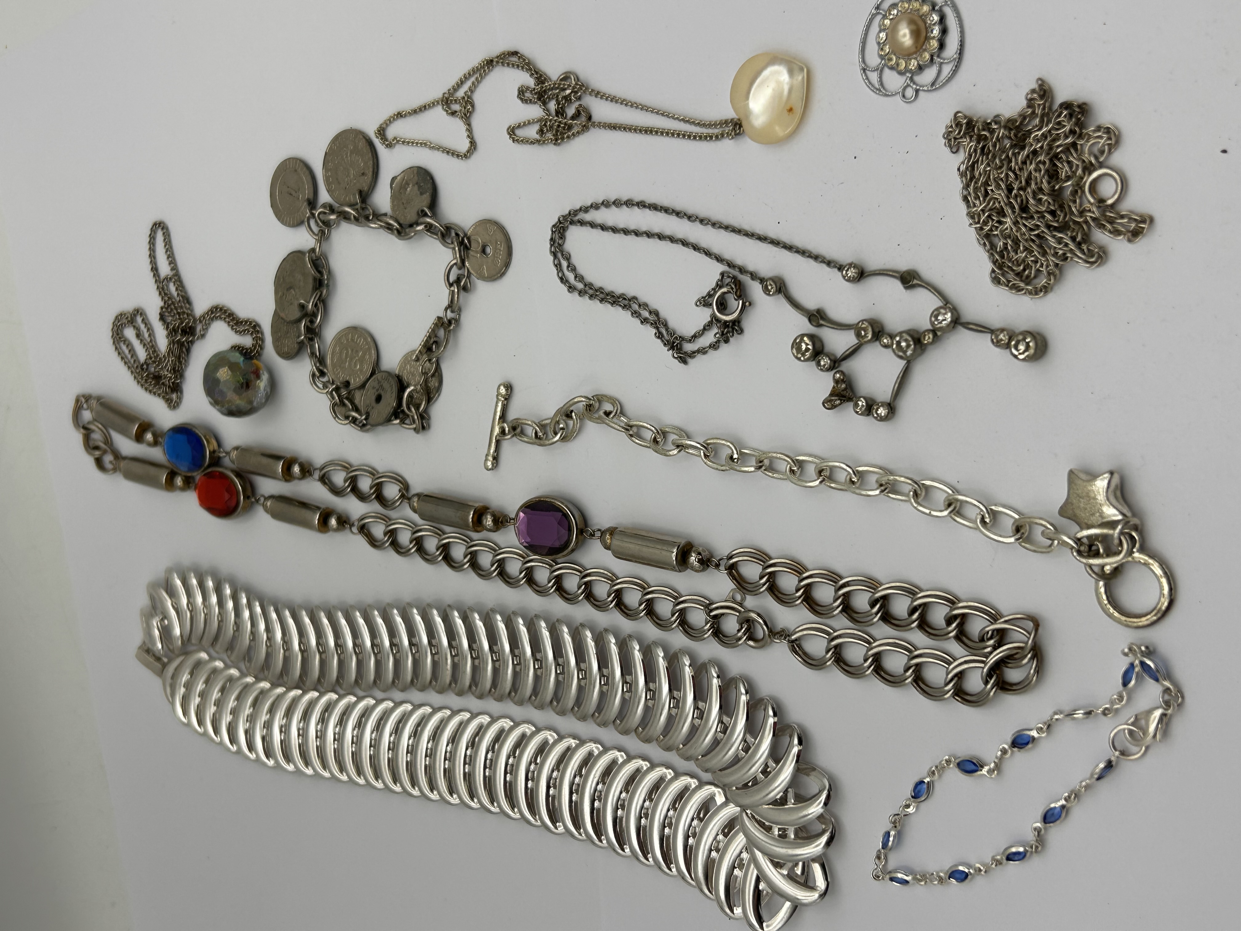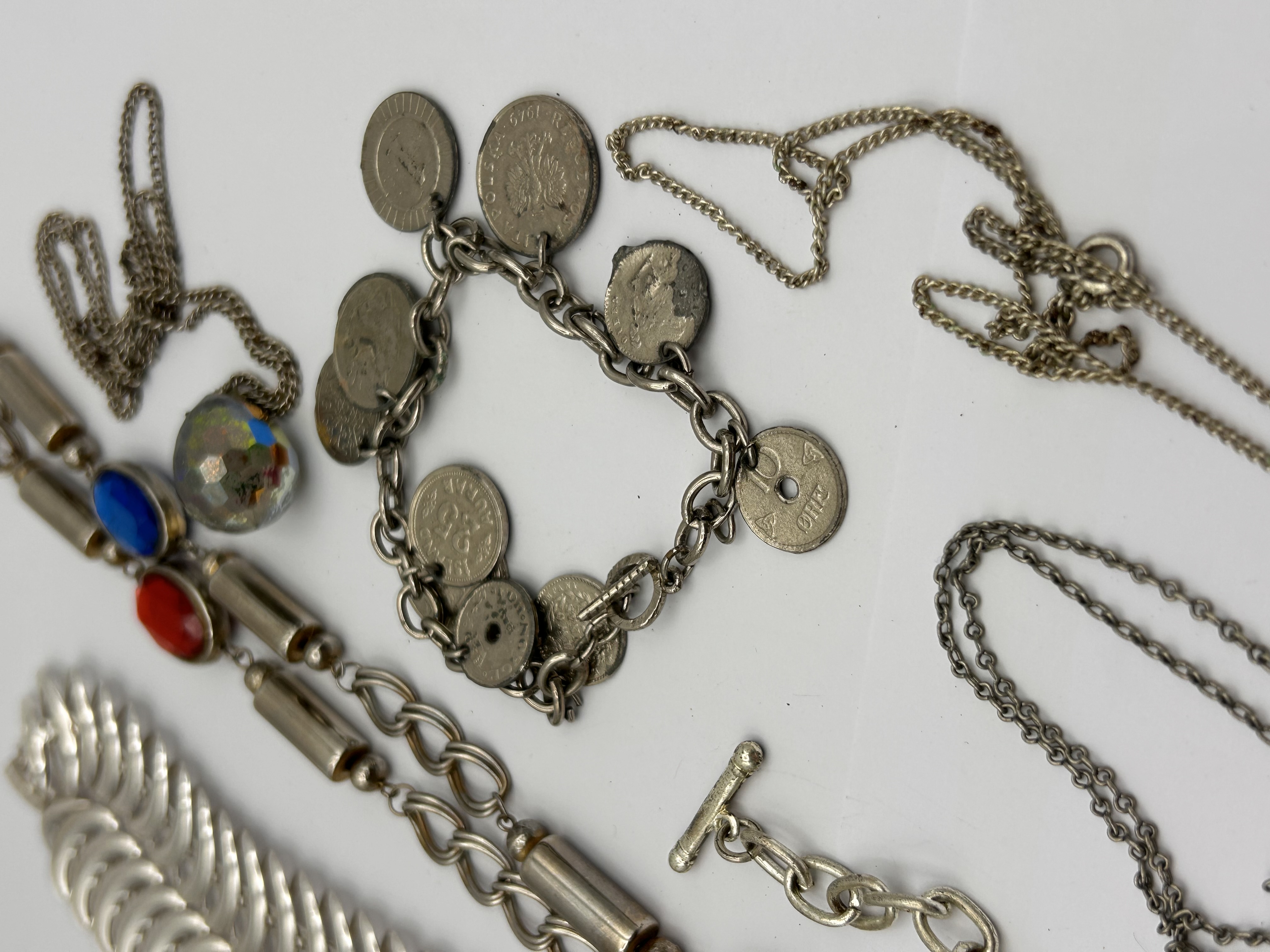 A collection of ten silver-tone costume jewelry items, crafted from base metal alloys. The assortment includes: