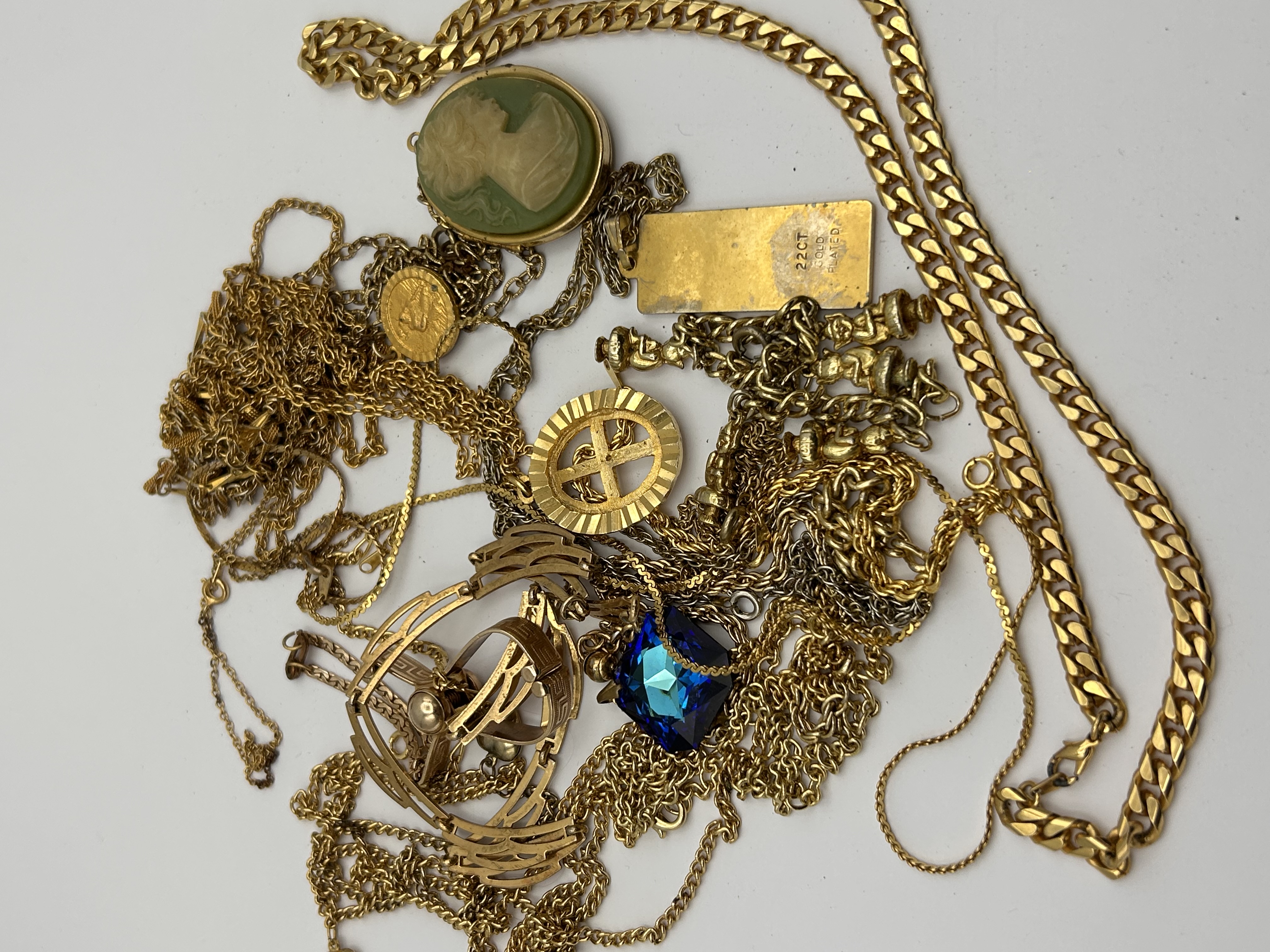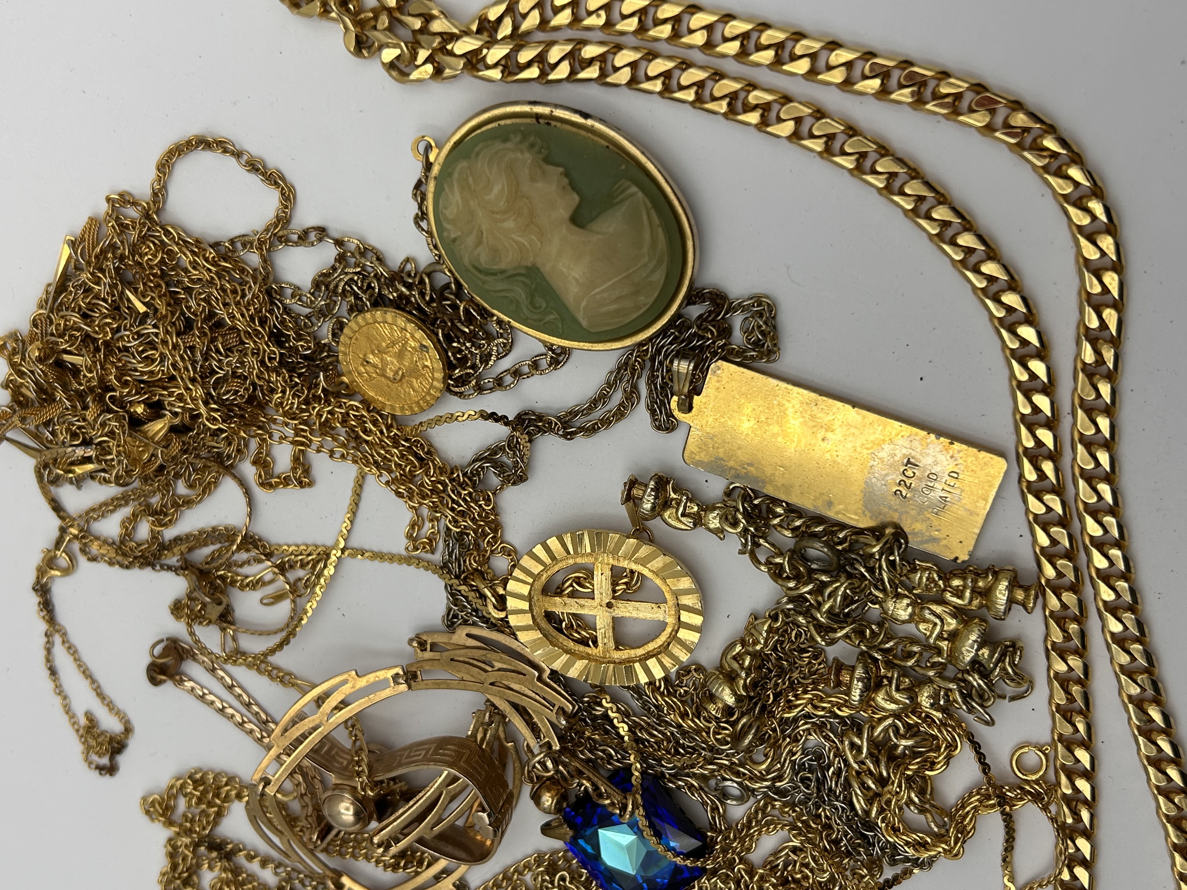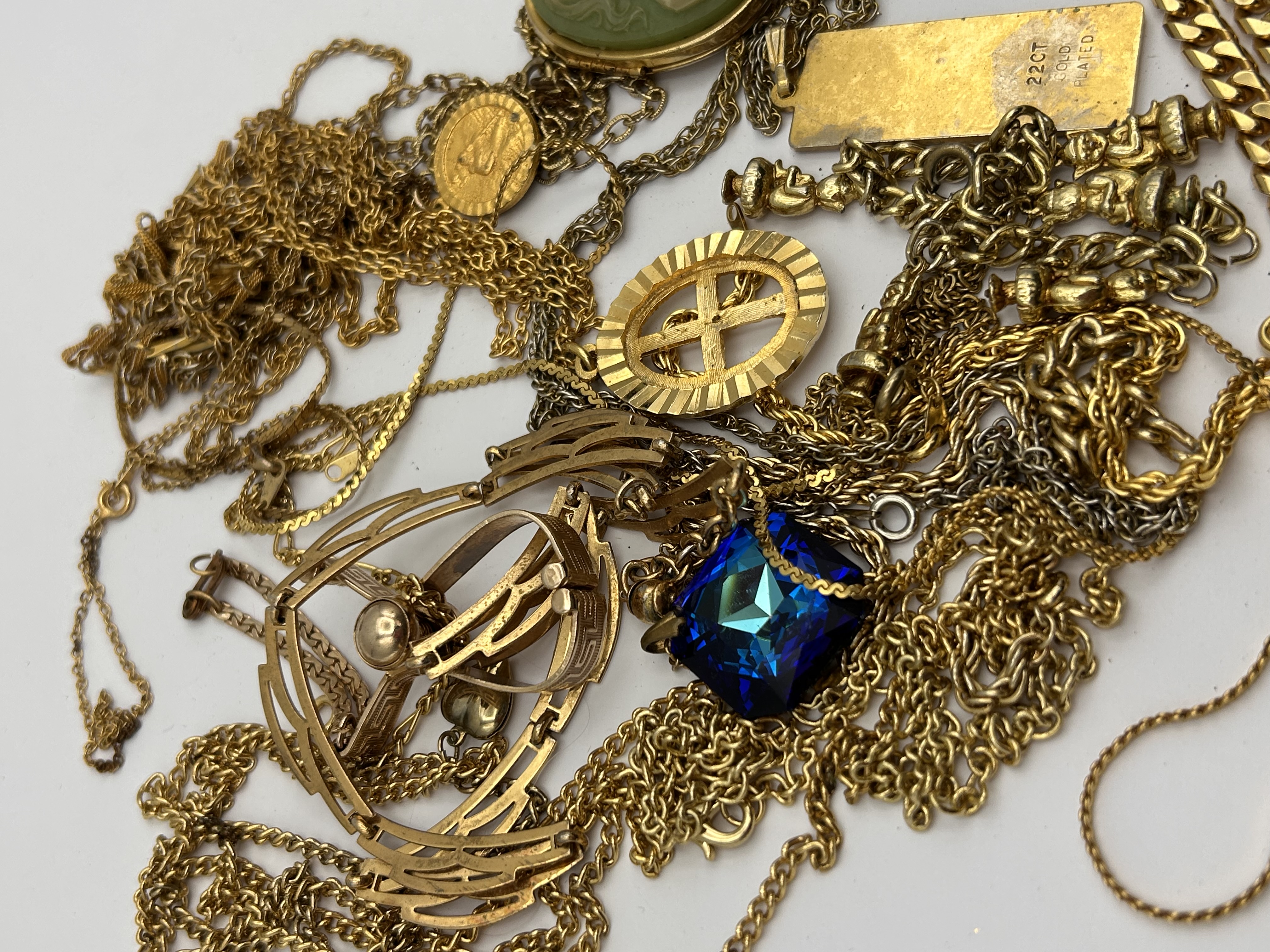 A diverse collection of yellow-toned jewellery, comprising gold-plated items. The assortment includes numerous chains of various link styles and thicknesses, a large, faceted, cushion-cut vibrant blue gemstone pendant set in yellow metal, and an oval cameo pendant featuring a cream-colored female profile against a green background, set in yellow metal. Also present are a circular coin pendant with an embossed figure, a circular pendant with a cross-like design, and a rectangular bar pendant clearly marked ’22CT GOLD PLATED’. The collection further includes a complex, multi-layered abstract pendant/brooch with a spherical element, and a string of small, anthropomorphic figures. The items exhibit a mix of styles, suggesting various periods.