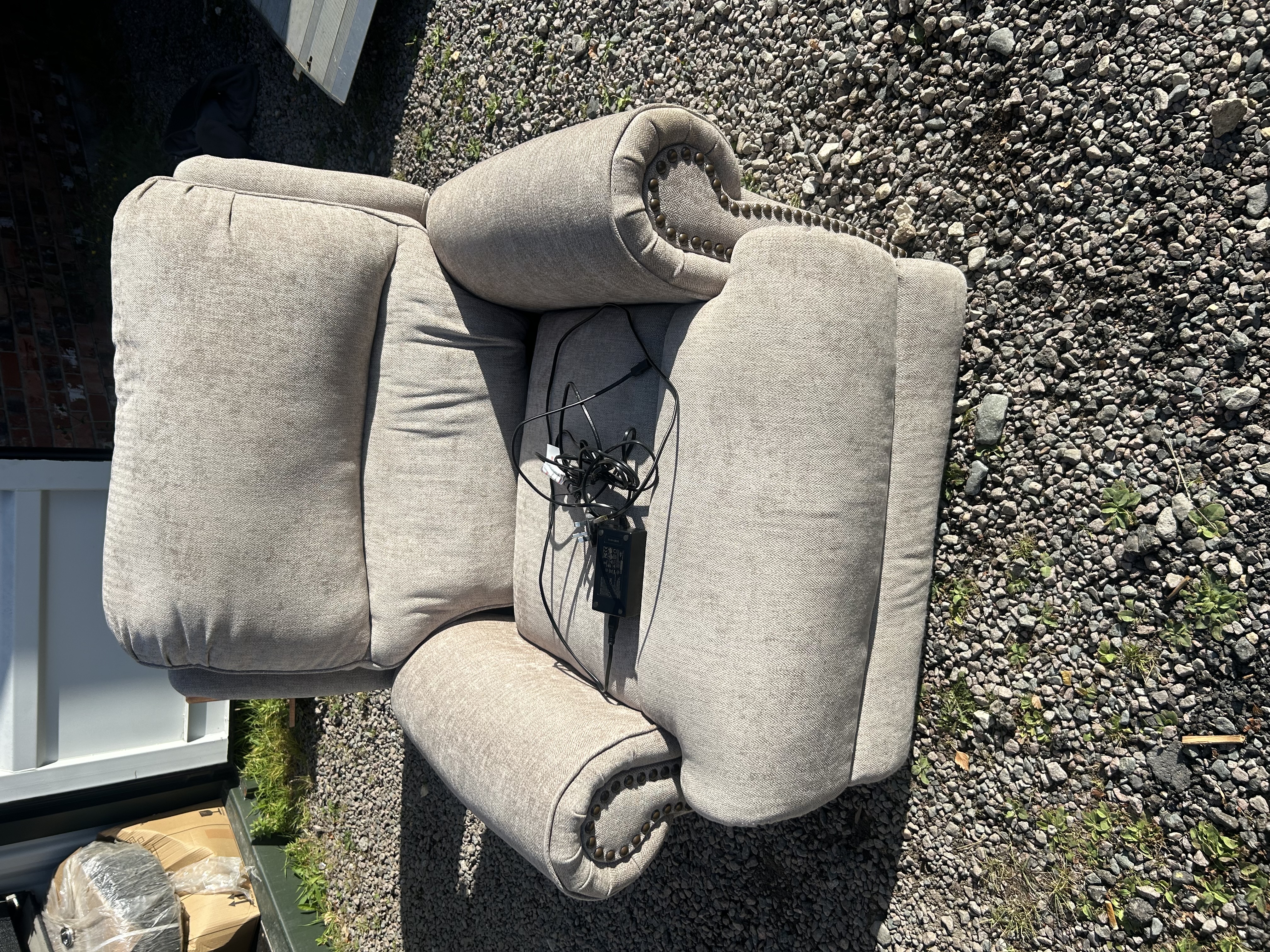 A contemporary electric power lift recliner chair, upholstered in a light beige fabric with a prominent herringbone weave. The design features rolled arms accented with a line of decorative brass-toned nailhead trim. The chair is equipped with an electronic control remote, which includes buttons for “UP,” “DOWN,” “HEAT,” and “MASSAGE,” indicating powered recline, lift, heat, and massage capabilities. A power adapter, marked “MODEL: XY-12003000-UL,” “INPUT: 100-240V~50/60Hz 1.5A,” “OUTPUT: 29V==3.0A 87.0W,” and bearing “MADE IN CHINA” with FCC/CE certifications, is included.