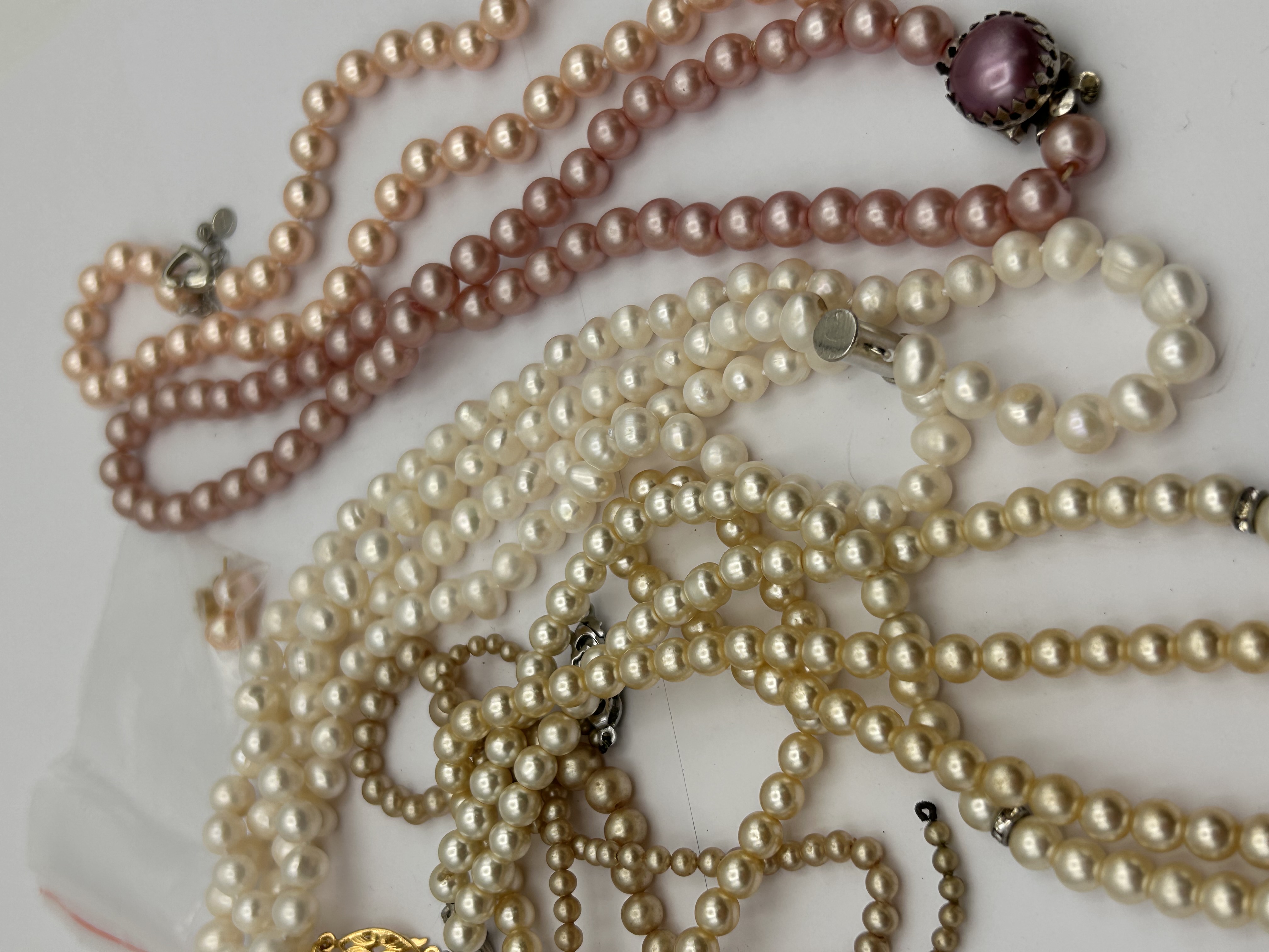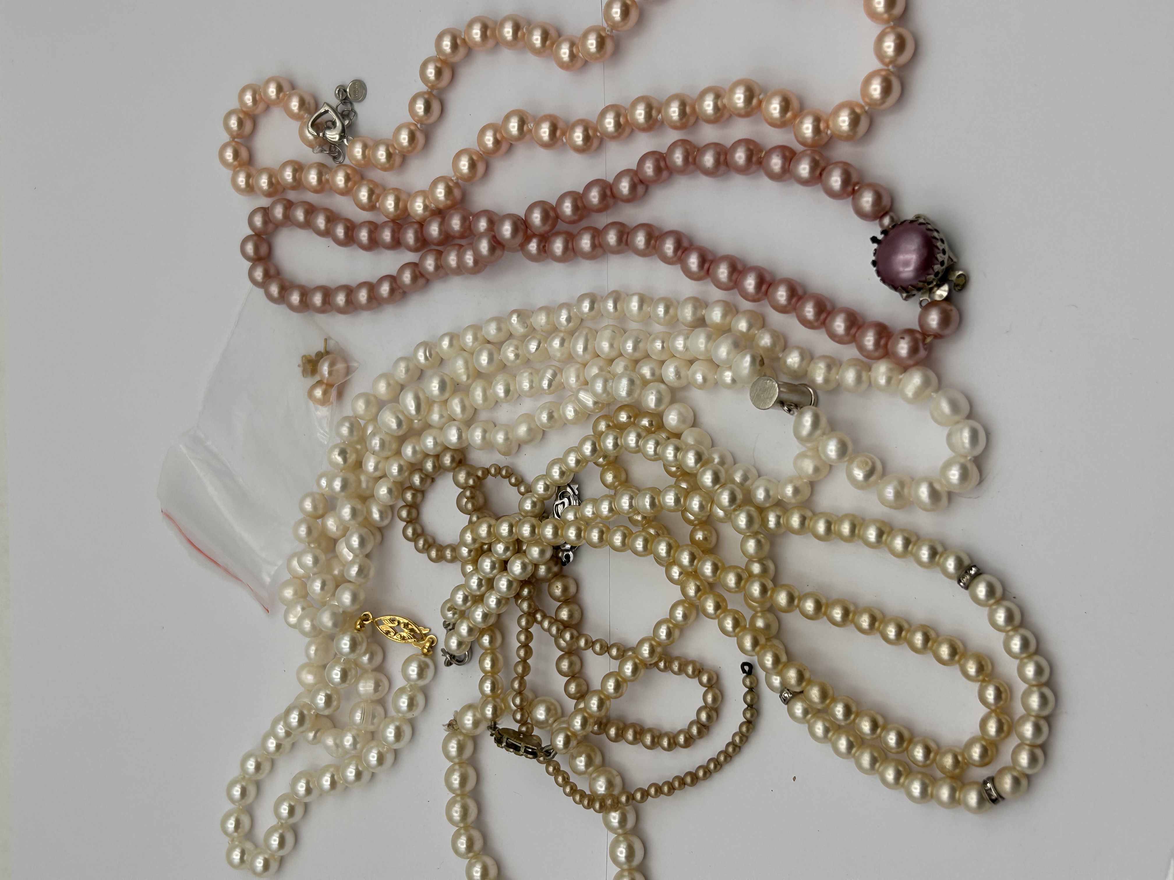 A collection of multiple pearl jewelry items, primarily comprising various necklaces and a pair of stud earrings. The necklaces feature pearls in a range of colors, including white to cream, light yellow to golden, and pink to peach hues. Pearl sizes vary from approximately 2mm to 8mm, exhibiting mostly round to off-round shapes, though some strands include more baroque pearls. Clasp types vary, with some appearing yellow-toned (possibly gold-tone or gold) and others silver-toned (likely white metal). Noteworthy clasps include a decorative filigree yellow-toned clasp on a white pearl strand, several simple silver-toned box or spring-ring clasps, and one prominent ornate silver-toned clasp on a pink pearl necklace, which features a central purplish-pink oval cabochon stone surrounded by small, clear accent stones. The small stud earrings present with small round pearls set in silver-toned settings. While some web intelligence suggests ‘cultured pearls’ or ‘freshwater pearls,’ one comparable lot was identified as ‘faux pearl costume jewelry.’ Without further gemological testing, these items are offered as pearl jewelry, potentially comprising cultured, freshwater, or imitation pearls.