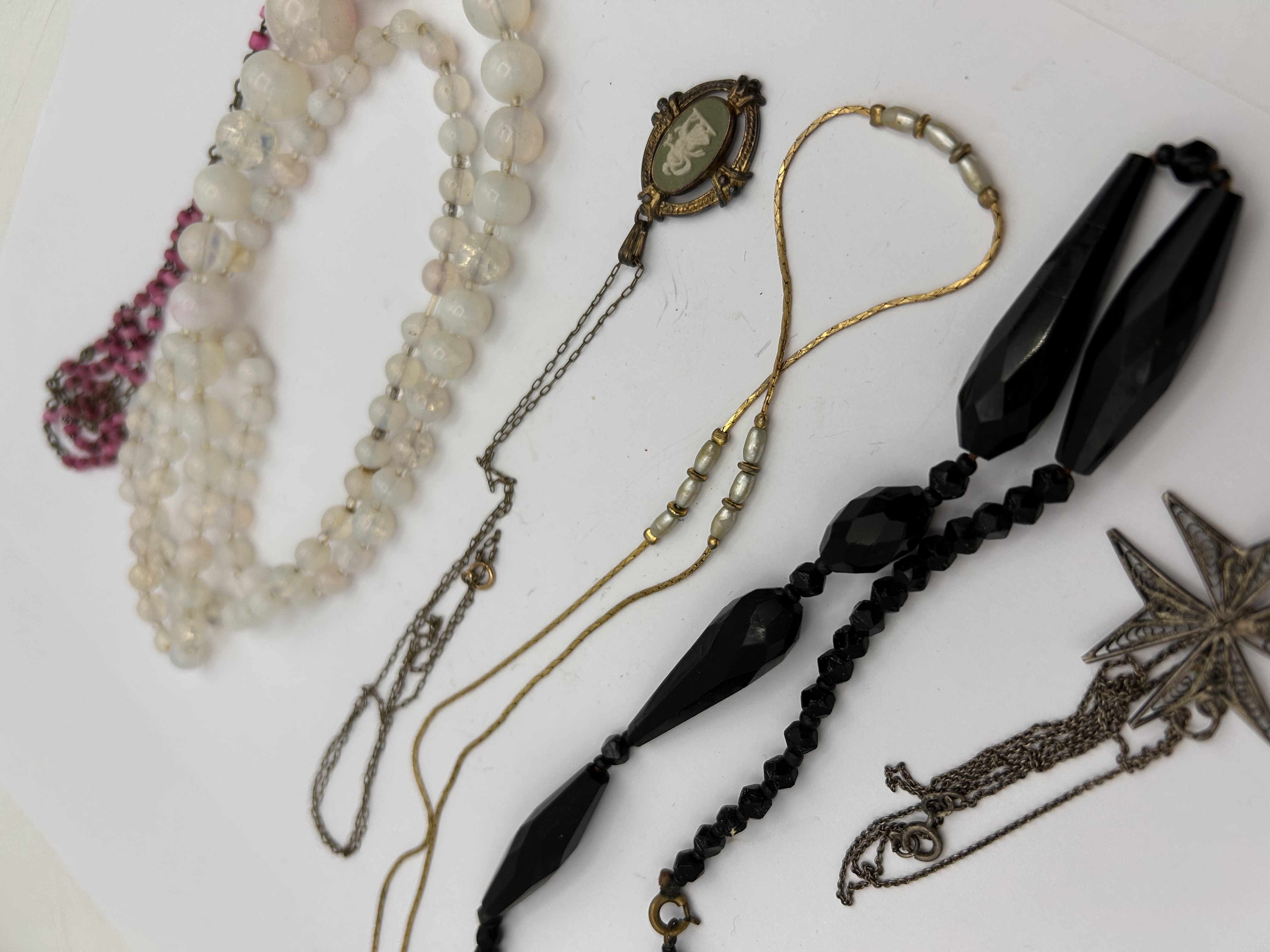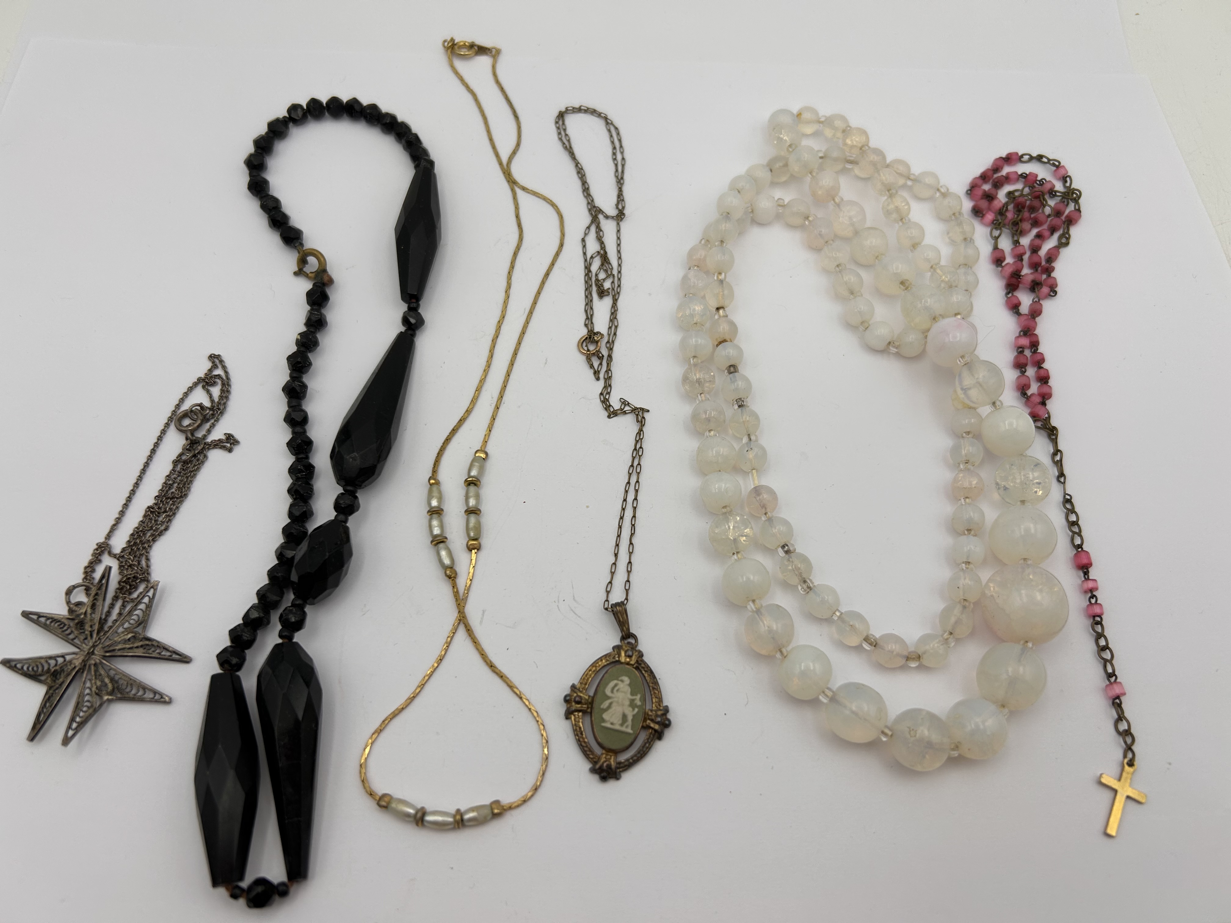 A group of six distinct necklaces and strands of beads. The collection includes a necklace with a dark metal filigree star-shaped pendant on a fine chain. Another necklace features large faceted black beads of mixed shapes (round and elongated) secured with a brass-toned clasp. A delicate gold-toned chain is intermittently strung with small cream-colored oval beads. Also present is a dark metal chain supporting an oval pendant, which displays a light-toned classical cameo-style profile set within an ornate brass-toned frame. A substantial long necklace comprises numerous milky white and opalescent glass beads of various sizes, some with a subtle pinkish tint, interspersed with smaller clear faceted beads. The final piece is a rosary-style strand with small pink beads connected by fine metal links, terminating in a small gold-toned Latin cross.