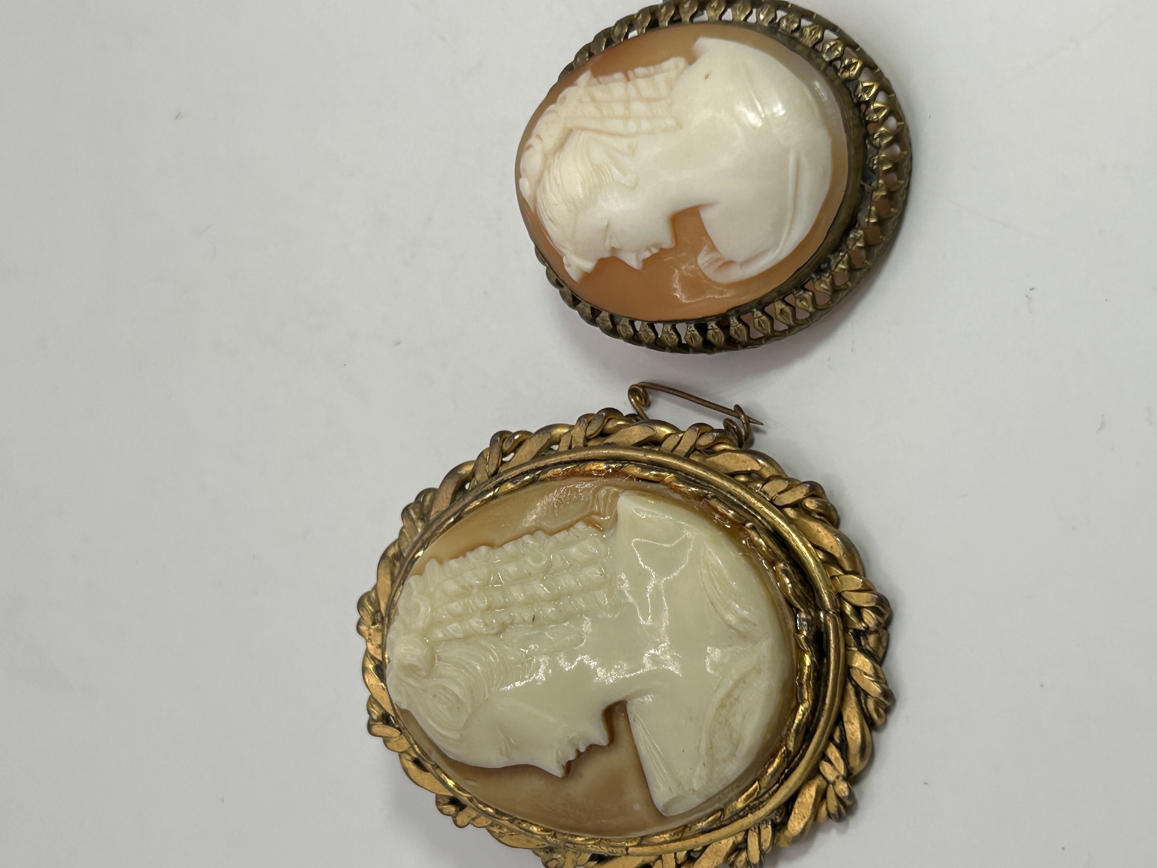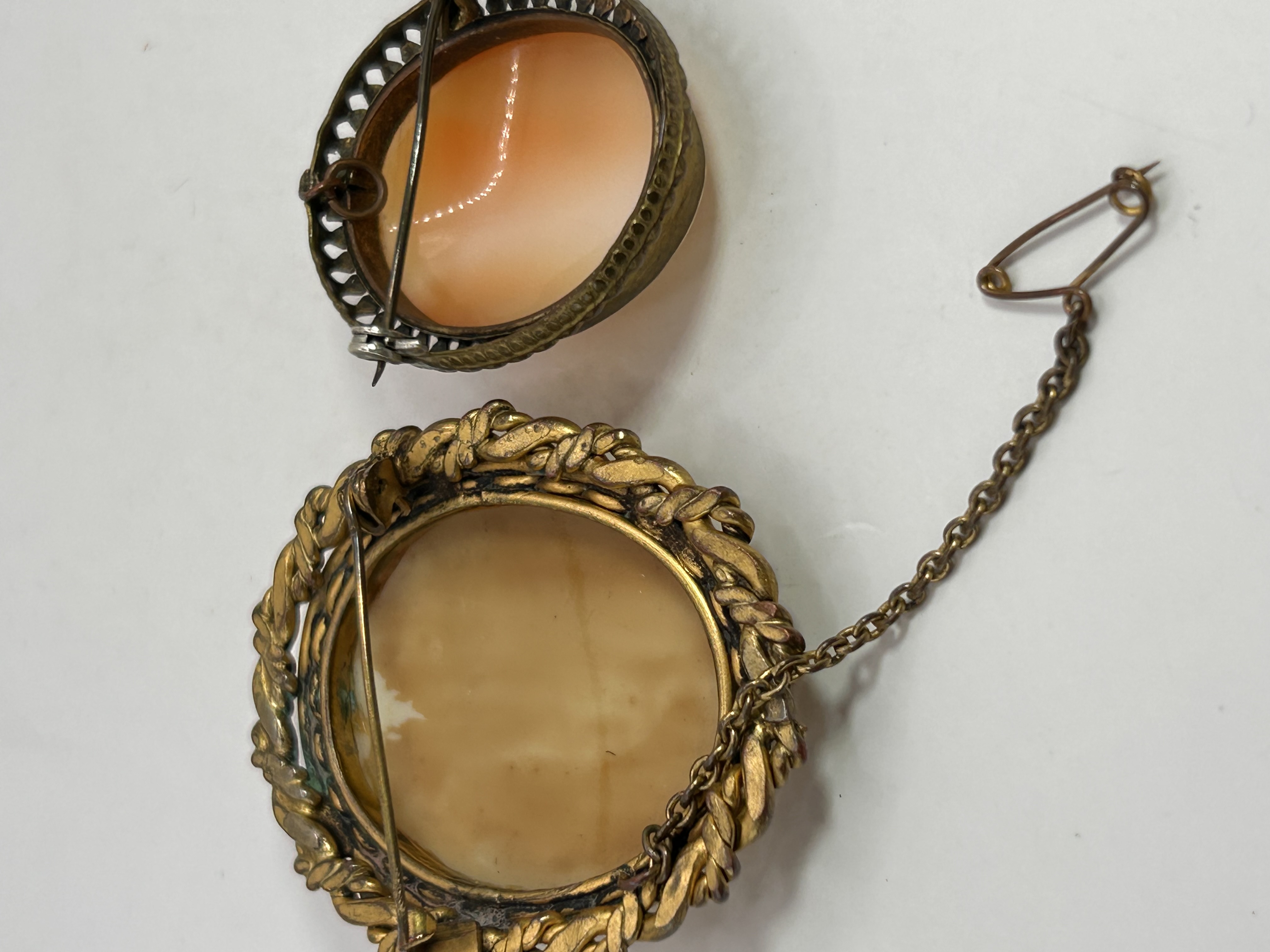 A pair of Victorian shell cameo brooches. The larger, oval brooch features a carved female profile in white relief against an orange-brown conch shell background, depicting a figure in classical or neoclassical style. It is set in an ornate, gold-toned metal frame with a leaf-like border. The reverse is fitted with a C-clasp pin mechanism and an attached safety chain. The smaller, oval brooch similarly features a carved female profile in white relief against an orange-brown conch shell background. It is set in a simpler, gold-toned frame with a beaded edge, and its reverse also has a C-clasp pin mechanism. No visible text or maker’s marks are present on either brooch.