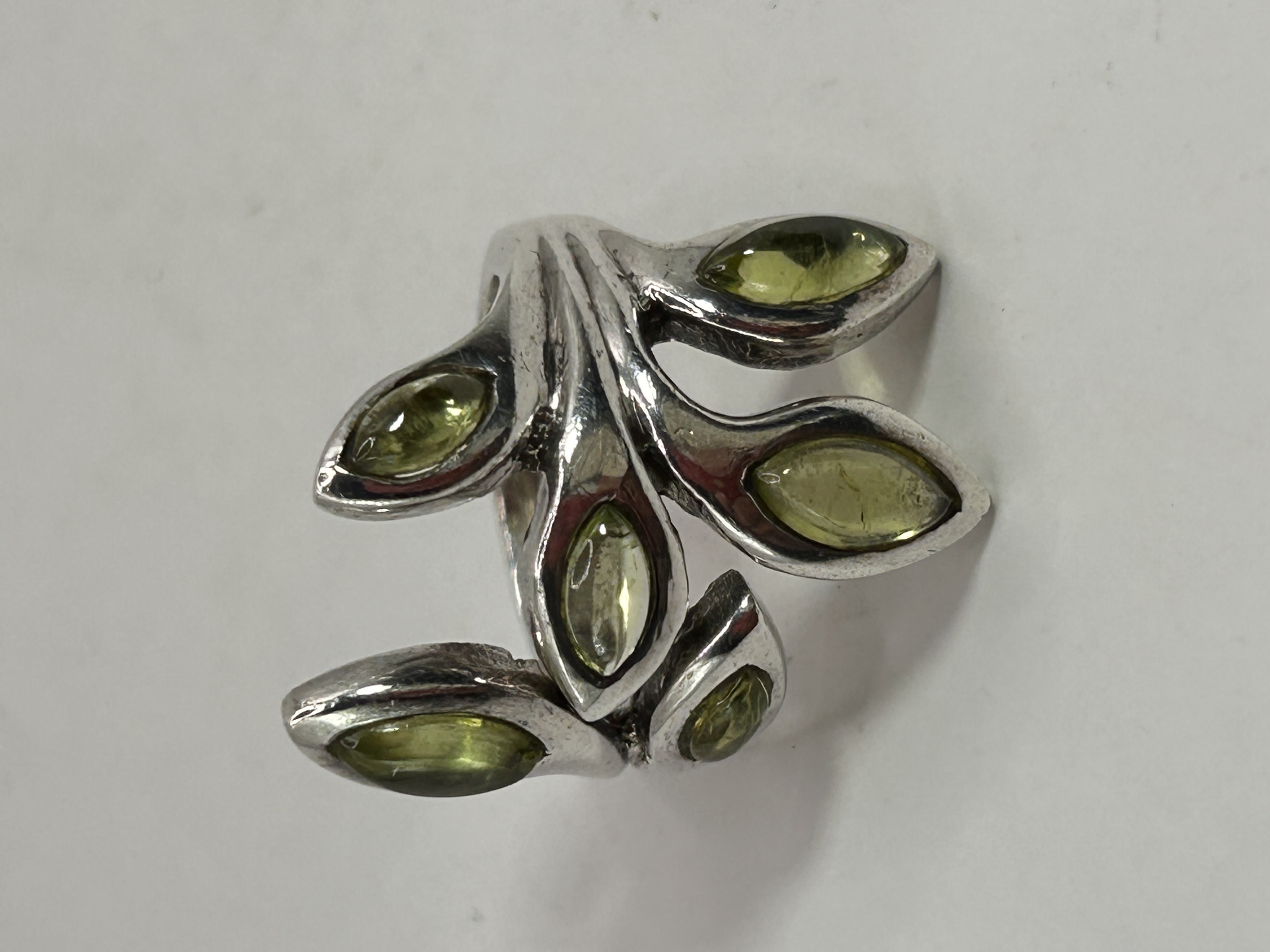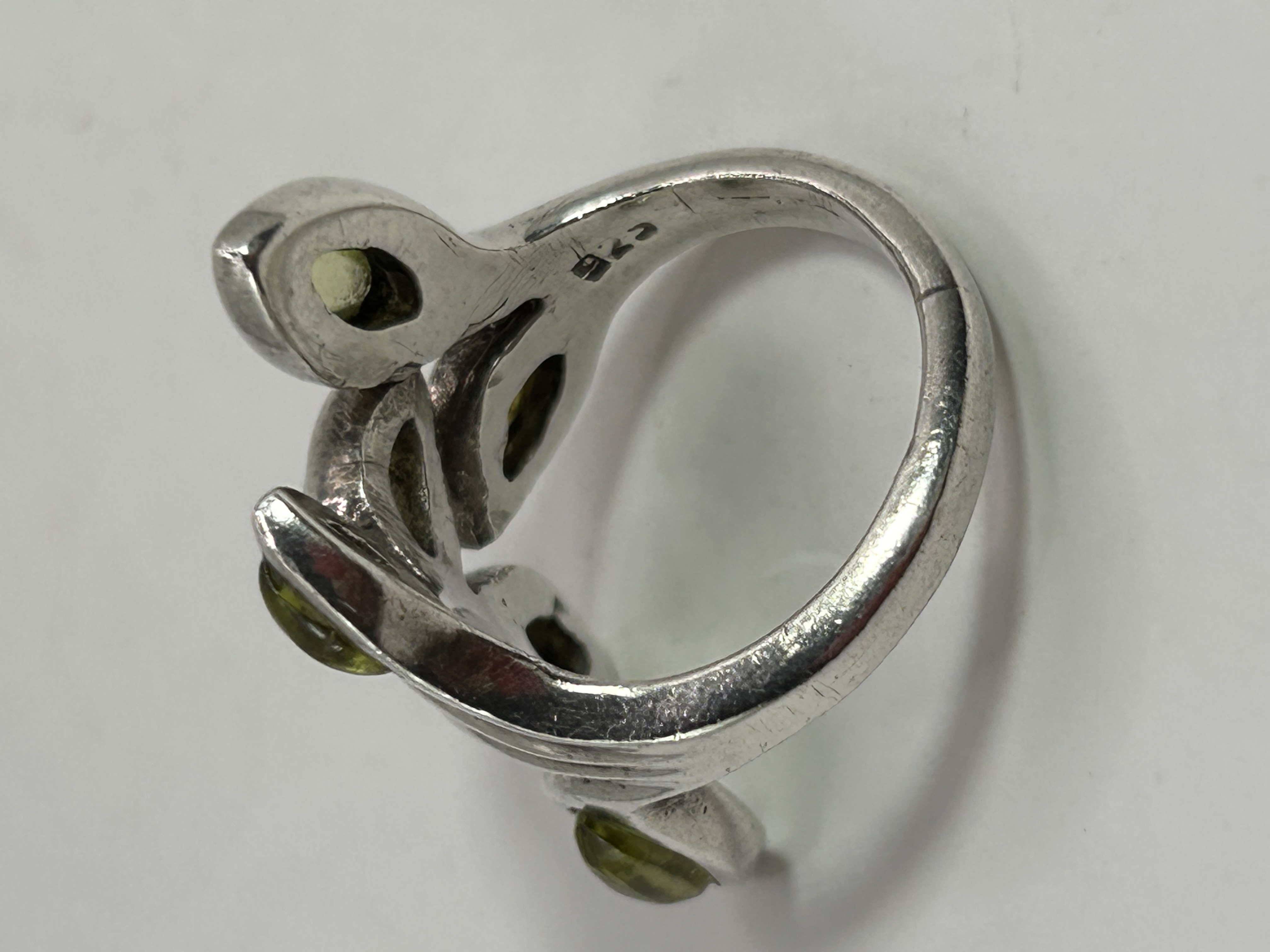A sterling silver ring featuring an organic, naturalistic design with intertwined leaf-like motifs. The ring is set with five elongated, transparent yellowish-green peridot gemstones. The interior of the band is hallmarked ‘925’ for sterling silver and bears a visible stylized maker’s mark.