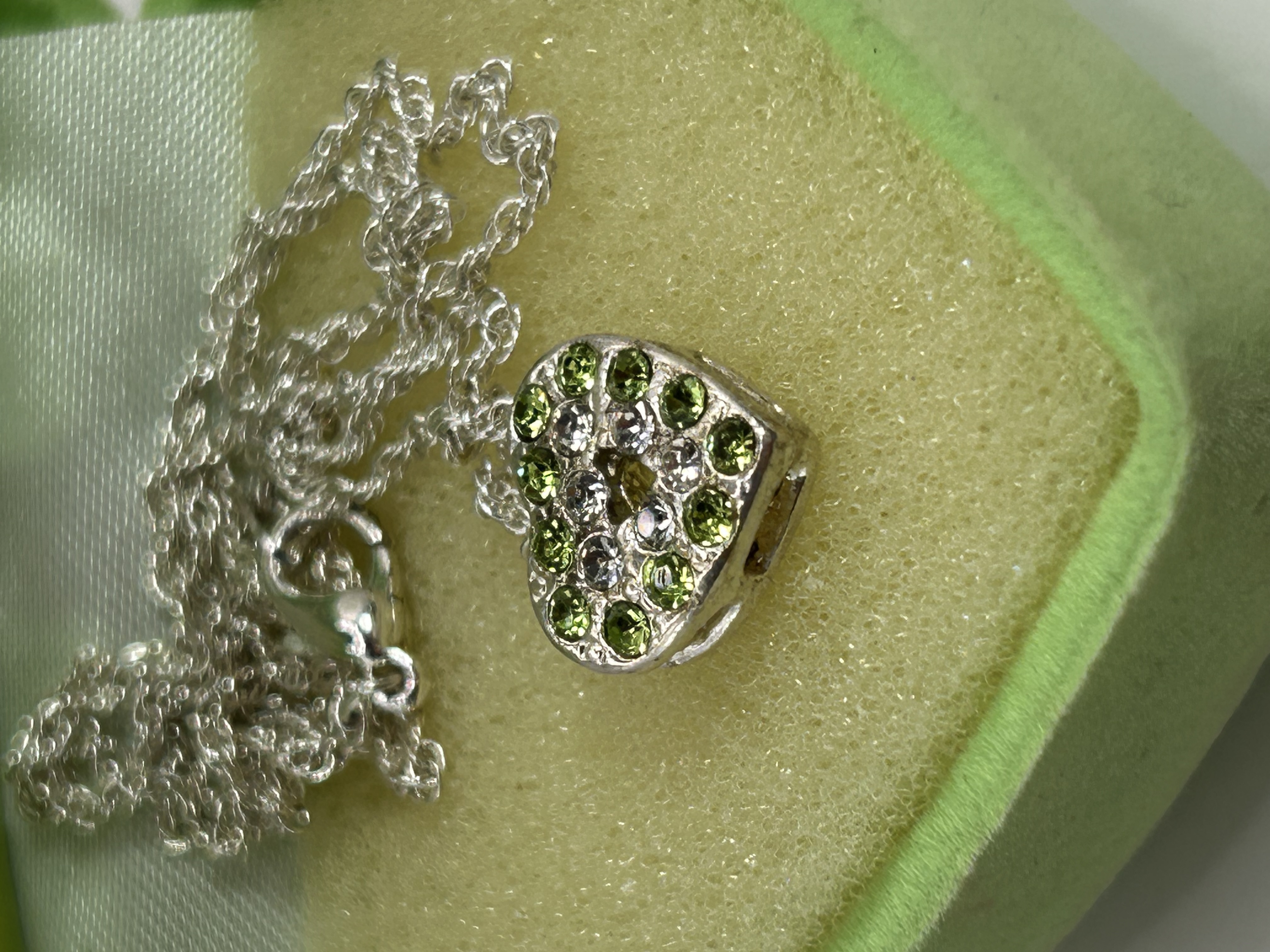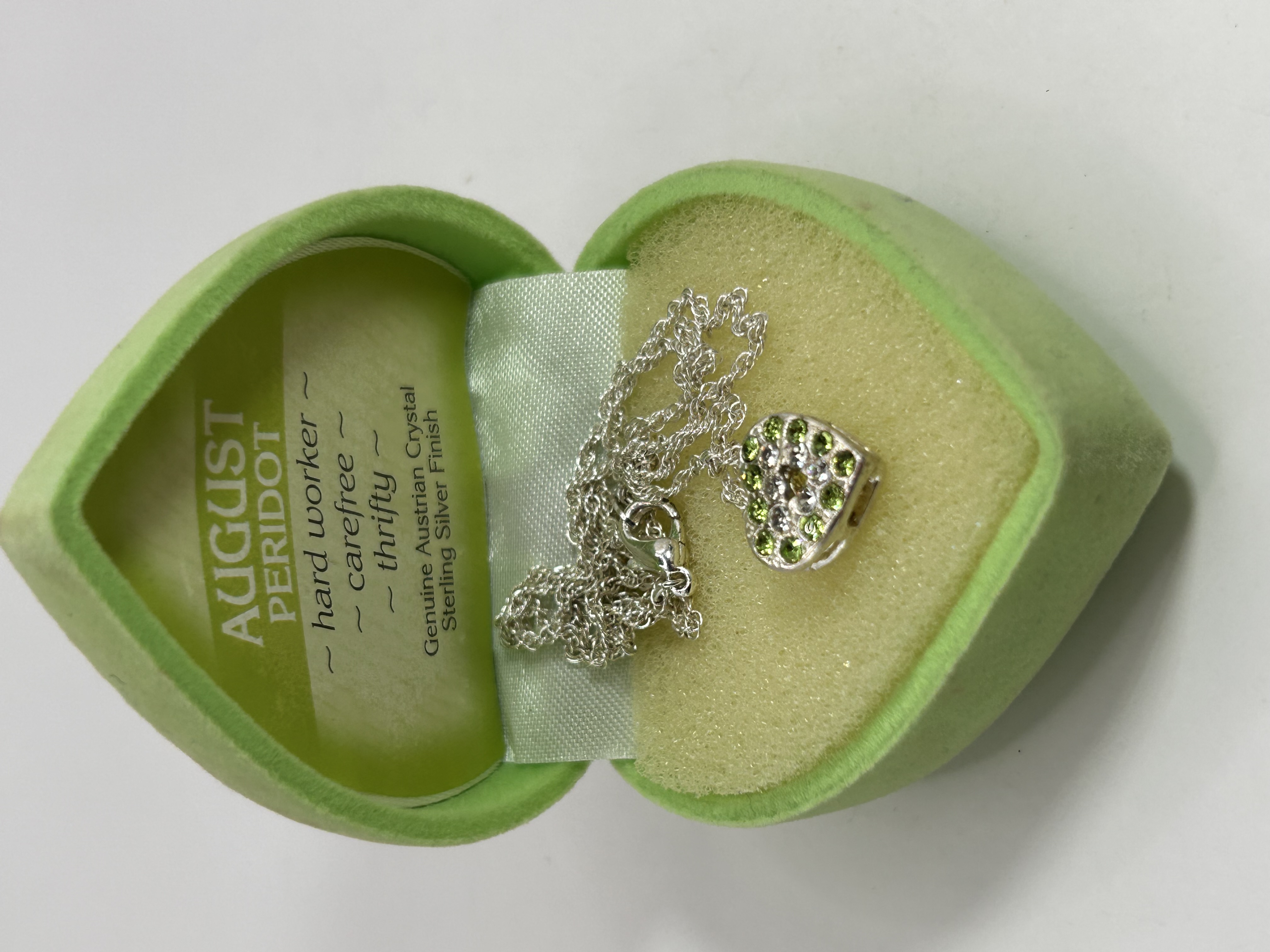 A modern silver-toned necklace featuring a heart-shaped pendant. The pendant is adorned with pave-set green and clear/white Genuine Austrian Crystals. The necklace includes a chain and lobster clasp. It is presented in its original matching green, heart-shaped, felt-covered gift box. The interior lid of the box is printed with ‘AUGUST PERIDOT’ and lists the traits ‘hard worker,’ ‘carefree,’ and ‘thrifty,’ further clarifying the materials as ‘Genuine Austrian Crystal’ and ‘Sterling Silver Finish.’