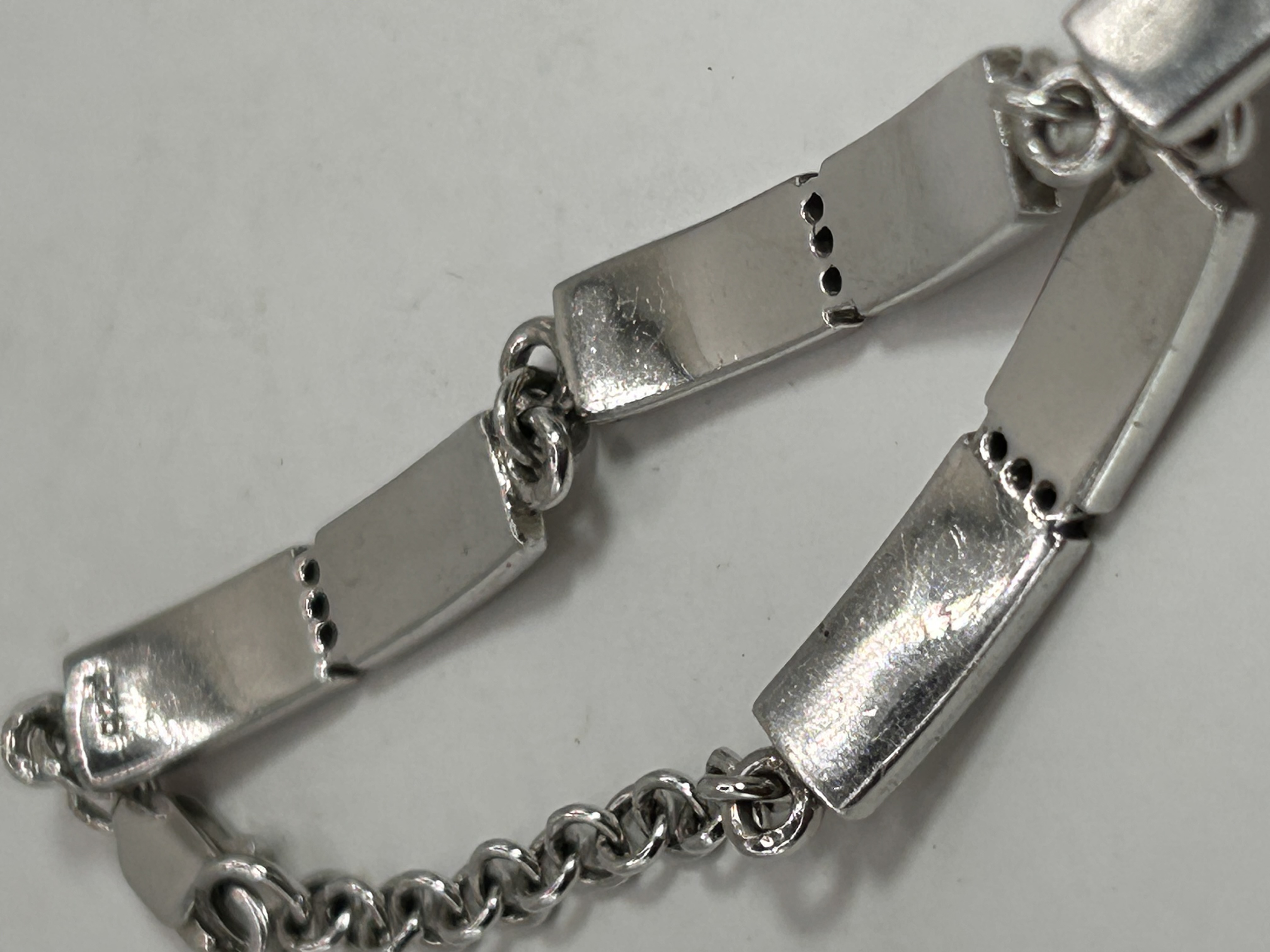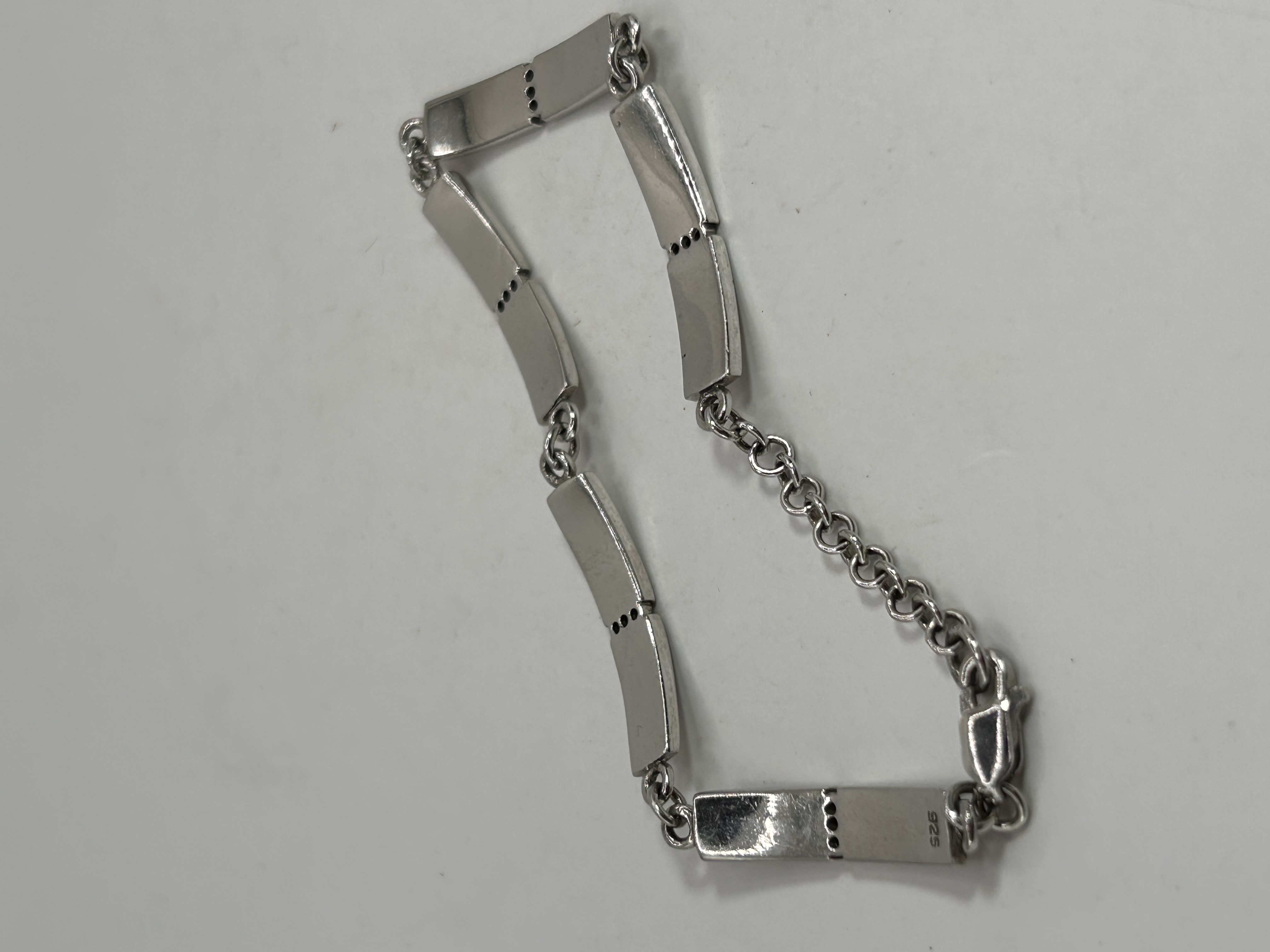 Crafted from sterling silver, this bracelet features rectangular links with slightly rounded edges. Each link is adorned with three small, evenly spaced indentations along one side. The links are connected by simple jump rings, with an additional section of curb chain leading to a lobster clasp. A ‘925’ mark is visible on the reverse of one end link.