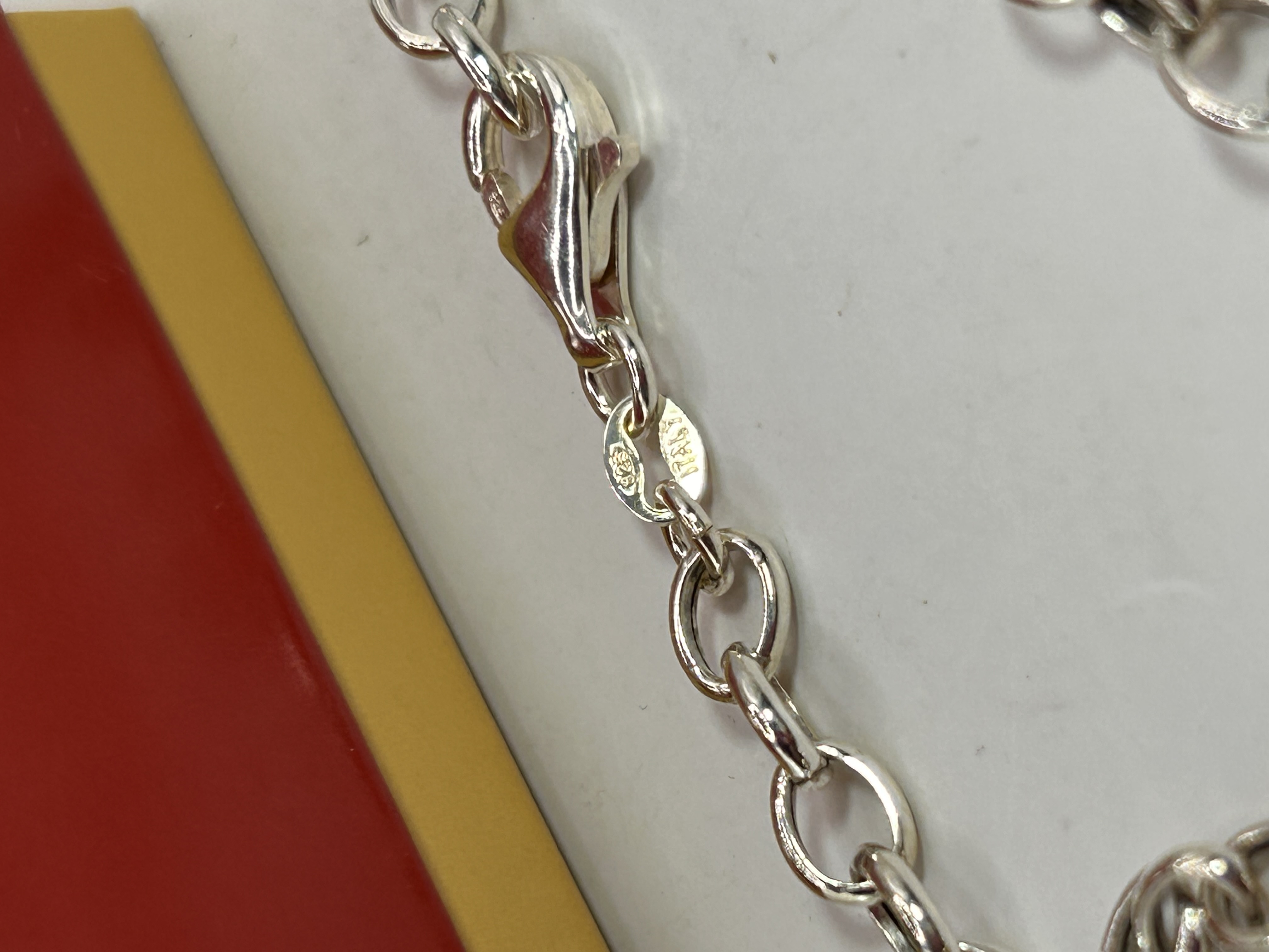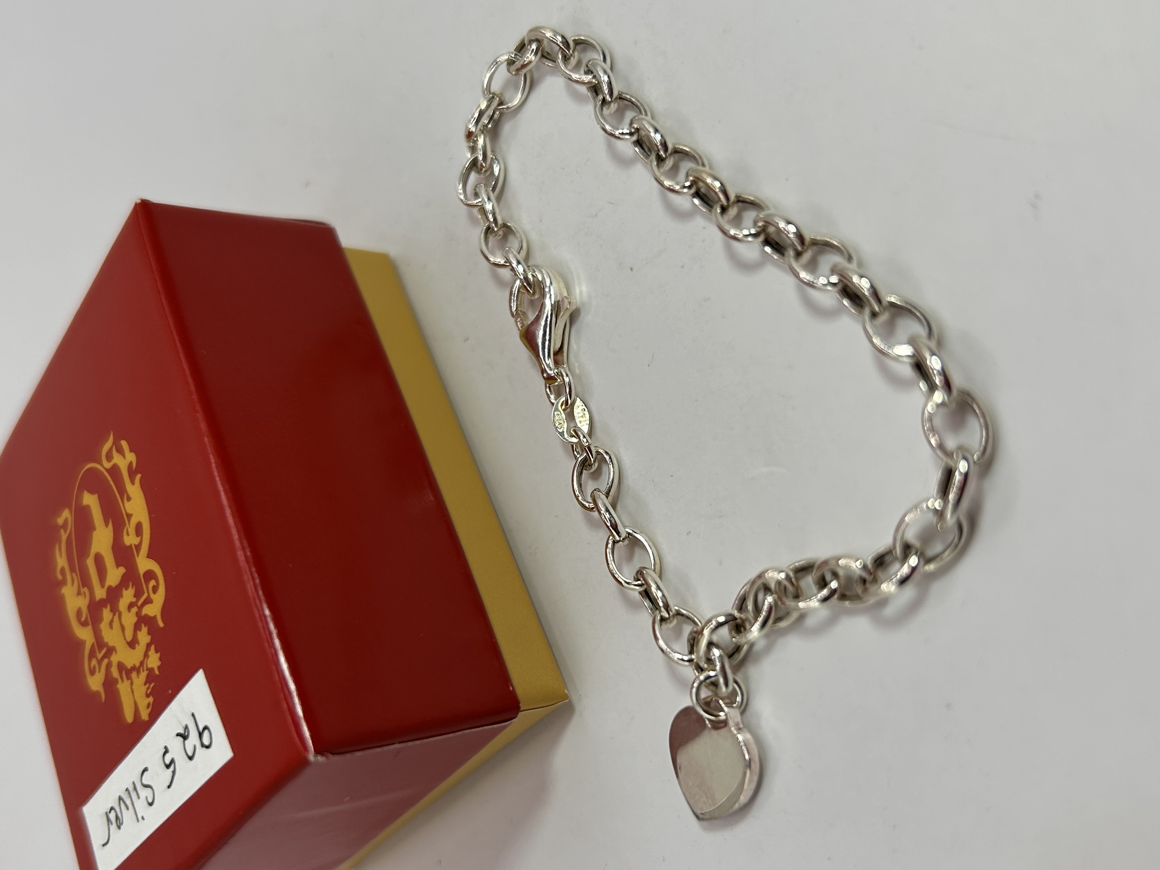 An Italian sterling silver 925 link bracelet, featuring a simple oval link design. The bracelet is adorned with a polished, flat heart-shaped charm and secured by a lobster claw clasp, which bears the ‘925’ hallmark and ‘ITALY’ stamp. The item is presented in a red and gold box with an ornate emblem and a handwritten label ‘925 Silver’.