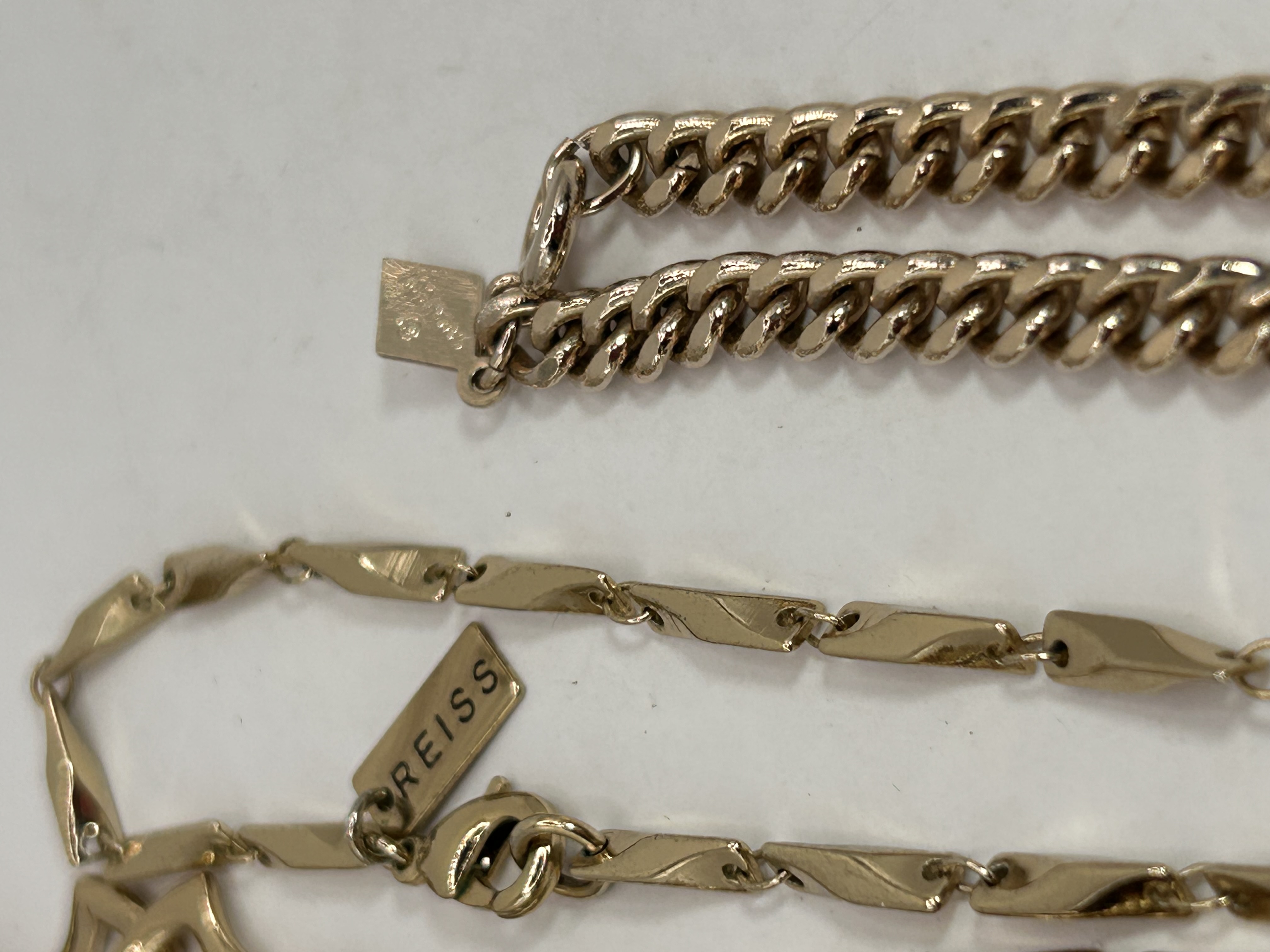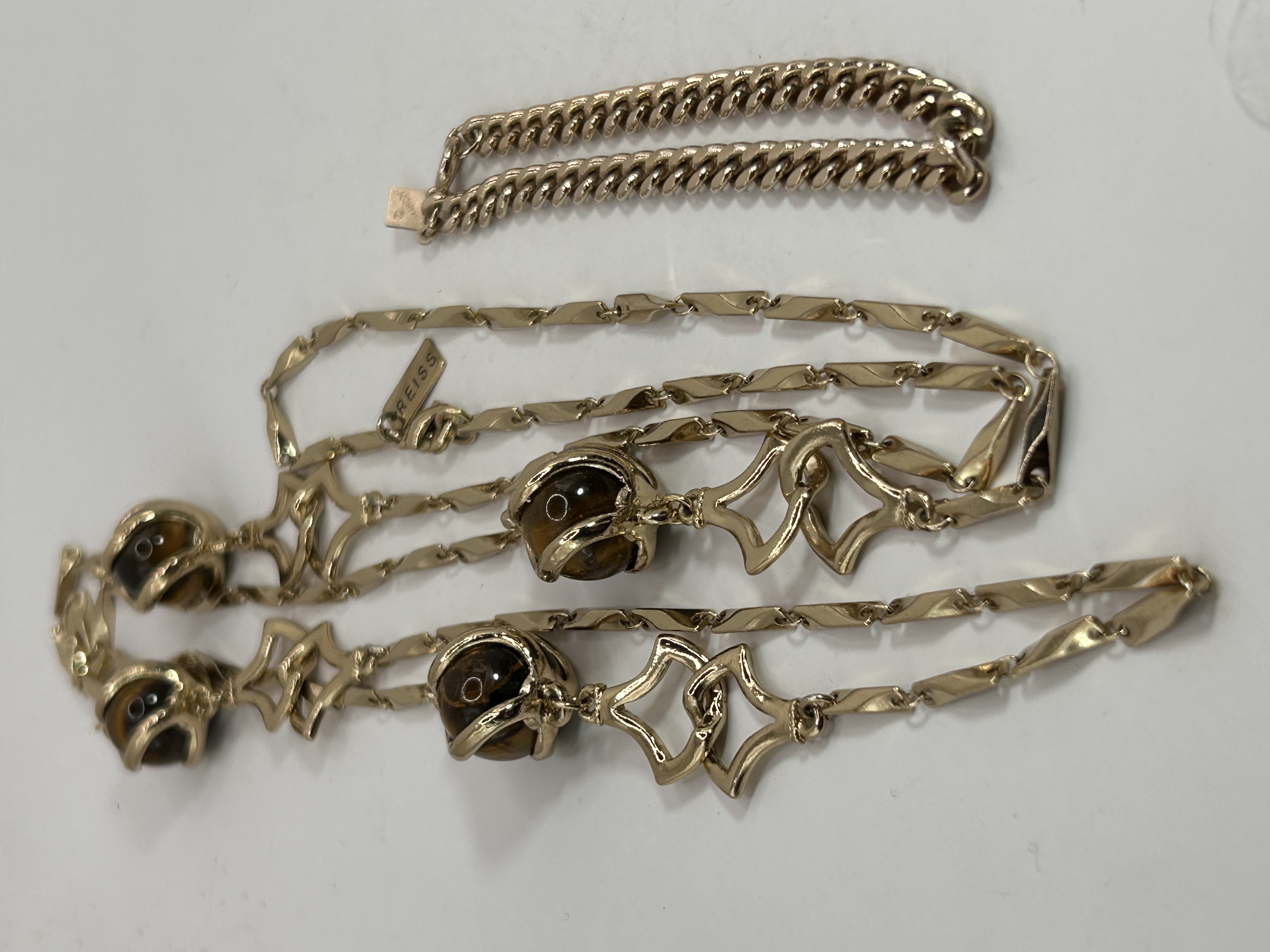 A gold-tone necklace by REISS, featuring an elongated link chain with a textured finish, interspersed with openwork geometric elements and four spherical, polished brown beads exhibiting chatoyancy, strongly resembling Tiger’s Eye. The necklace is secured by a spring ring clasp and bears a rectangular tag clearly marked ‘REISS’. Accompanied by a shorter, classic gold-tone curb link chain, secured by a box clasp with an indistinct marking.