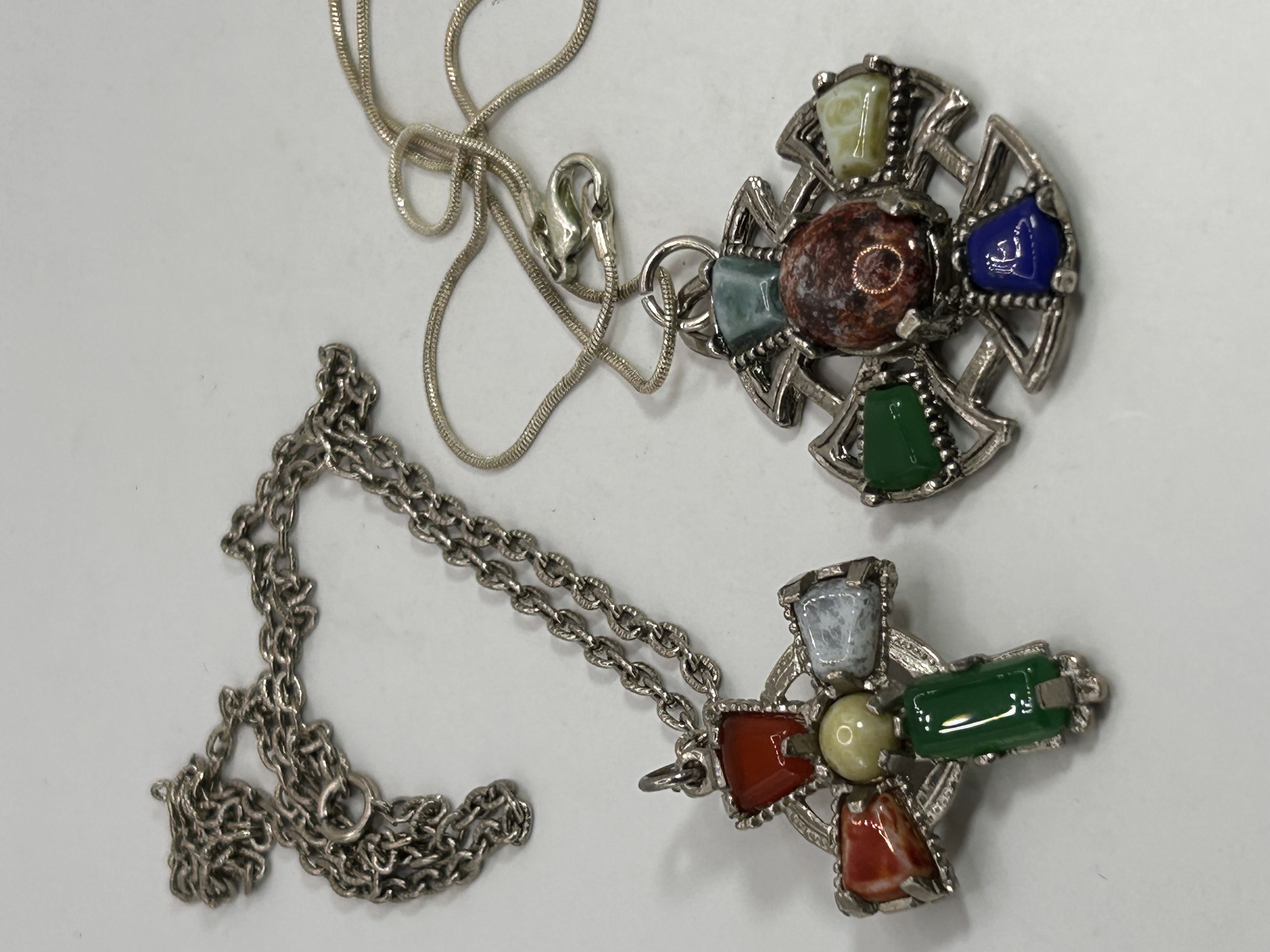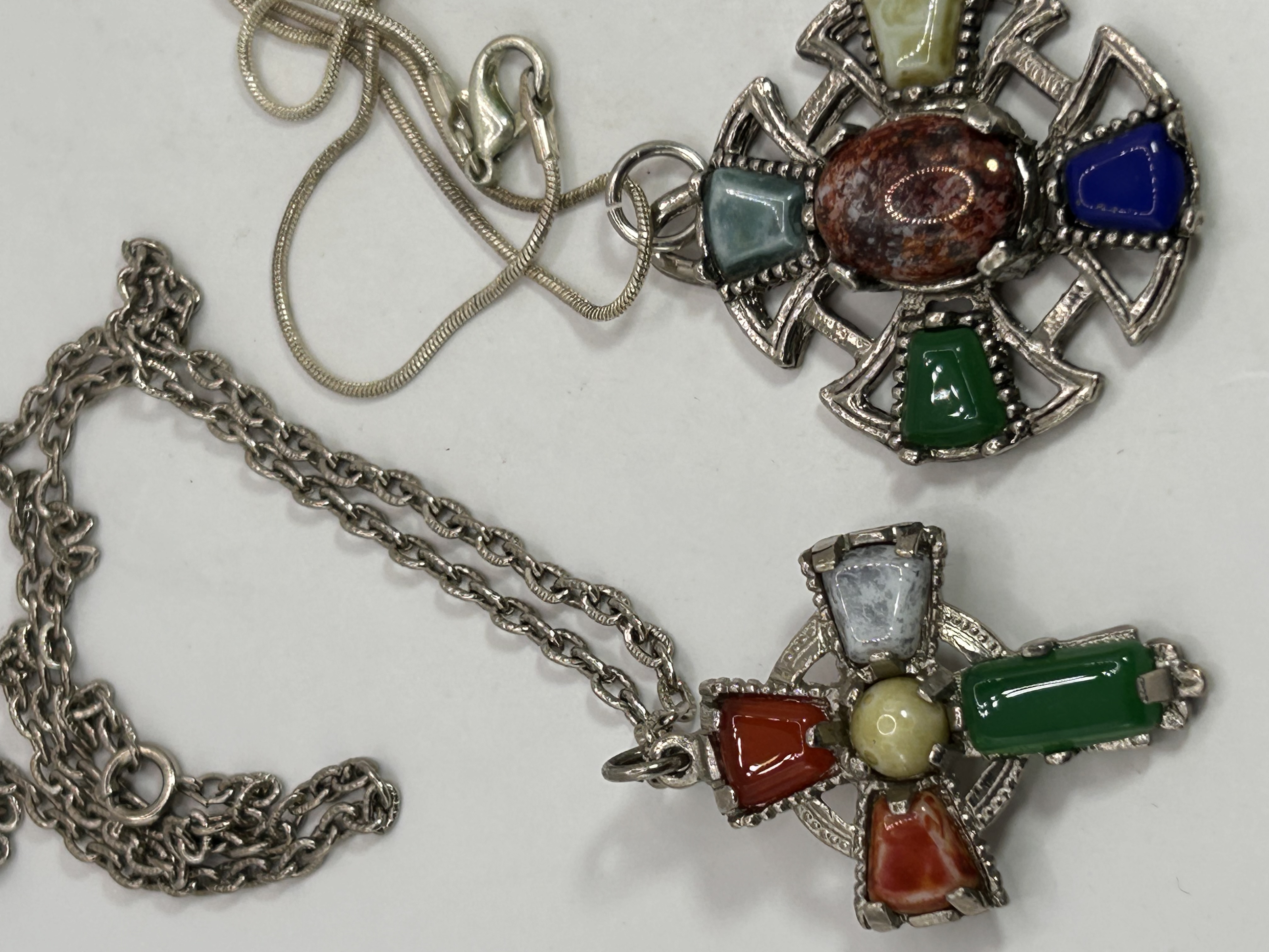 A pair of vintage necklaces, each featuring a cross pendant in the German Maltese Cross style, set with multicolor ‘Bakelite inspired’ cabochon stones. The smaller pendant is a simple cross with five bezel-set, multi-colored cabochon stones in red, green, yellow, and mottled grey, suspended from a silver-toned curb link chain. The larger pendant, designed in a Celtic cross style, showcases a central oval reddish-brown mottled stone surrounded by four rectangular/square cabochons in blue, green, light blue, and yellowish-green, all set within an ornate silver-toned frame, attached to a silver-toned snake chain. Both chains terminate with spring-ring clasps.