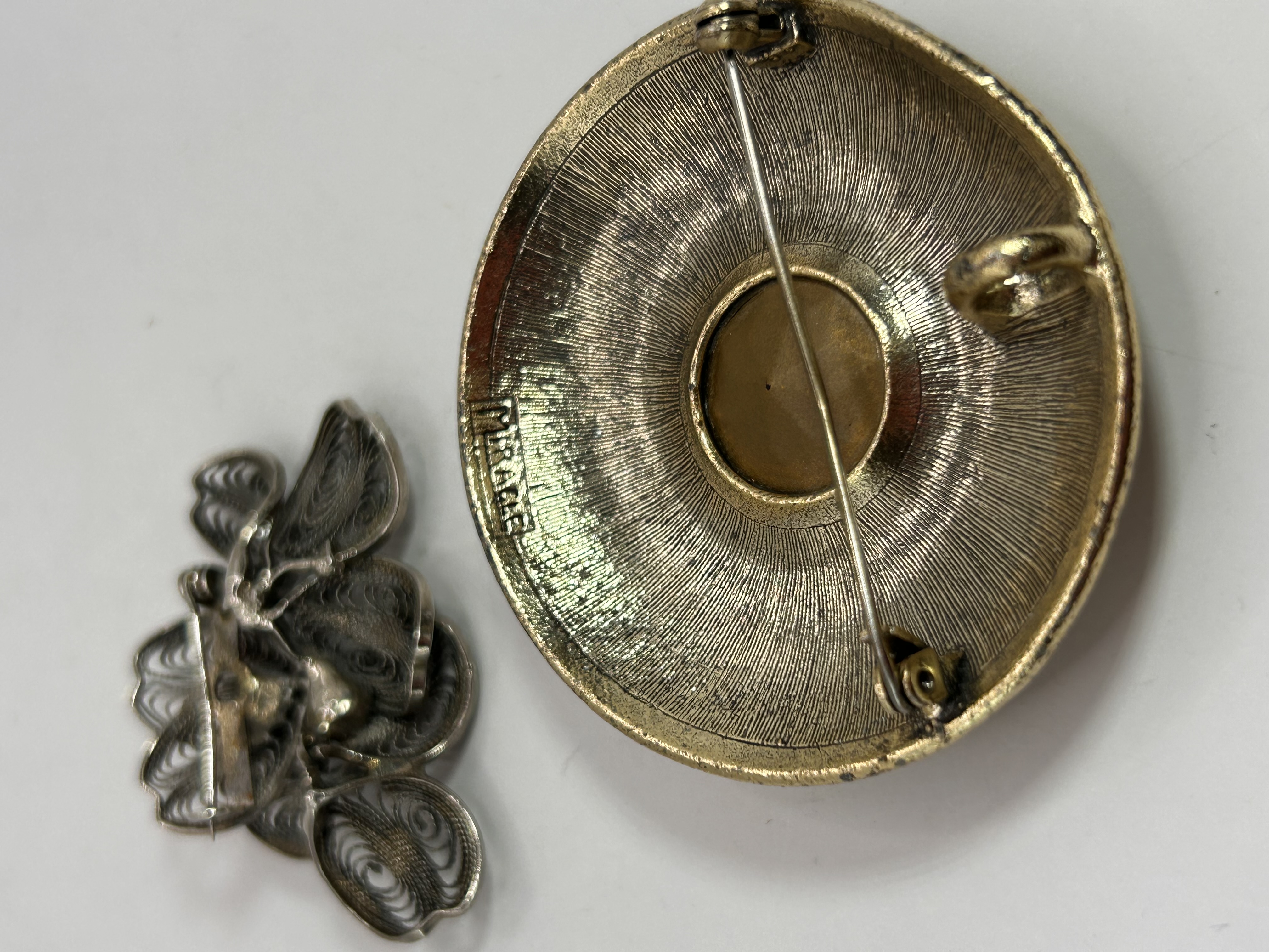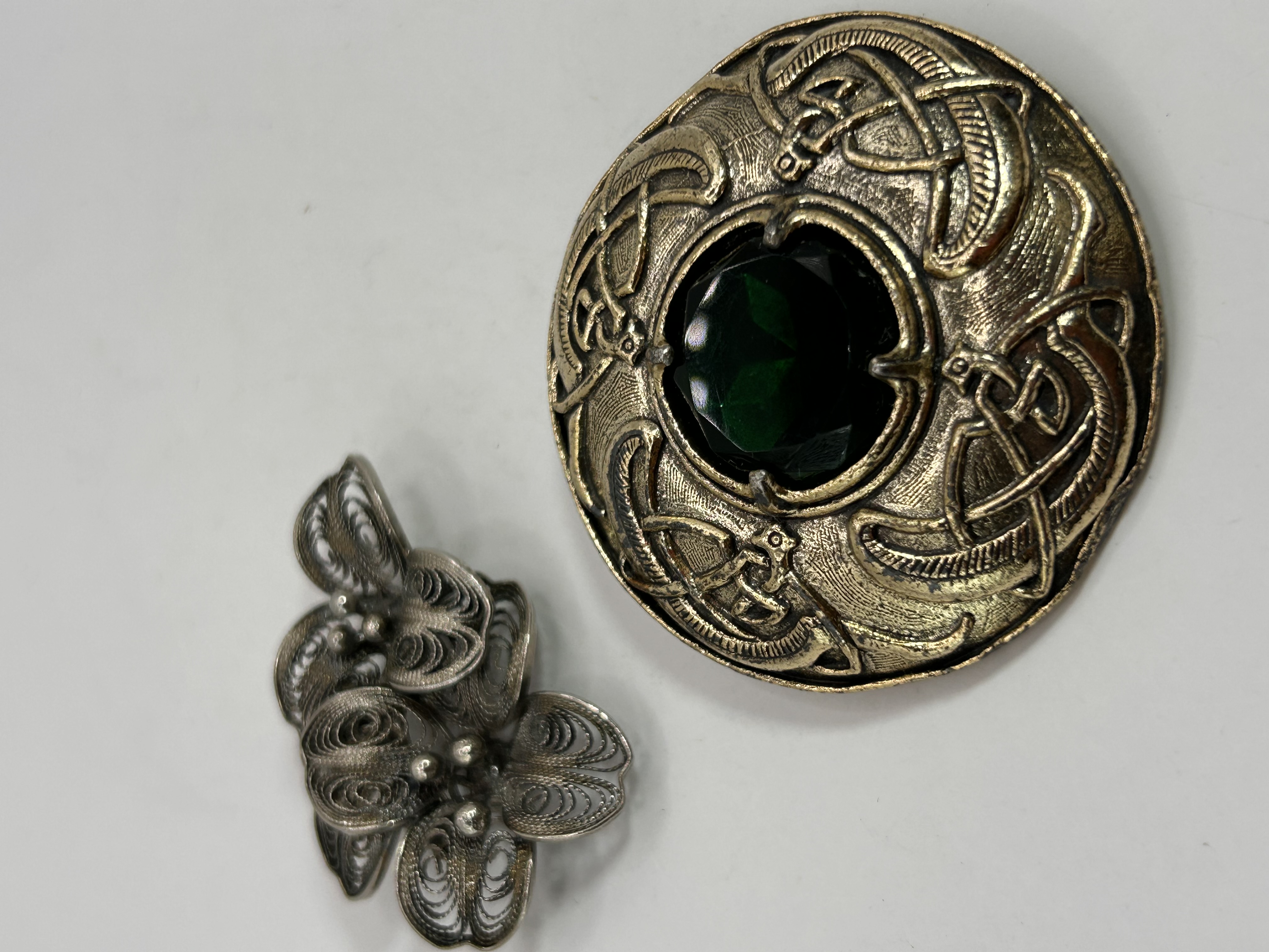 A Scottish Celtic Knot Kilt Fly Plaid Brooch, featuring an embossed Celtic knotwork pattern in gold-toned base metal, surrounding a central oval dark green cabochon stone. The reverse is clearly marked “SCOTTISH” and features a standard pin-back mechanism. Accompanied by a silver-toned metal filigree brooch, intricately crafted into a multi-petal floral design.