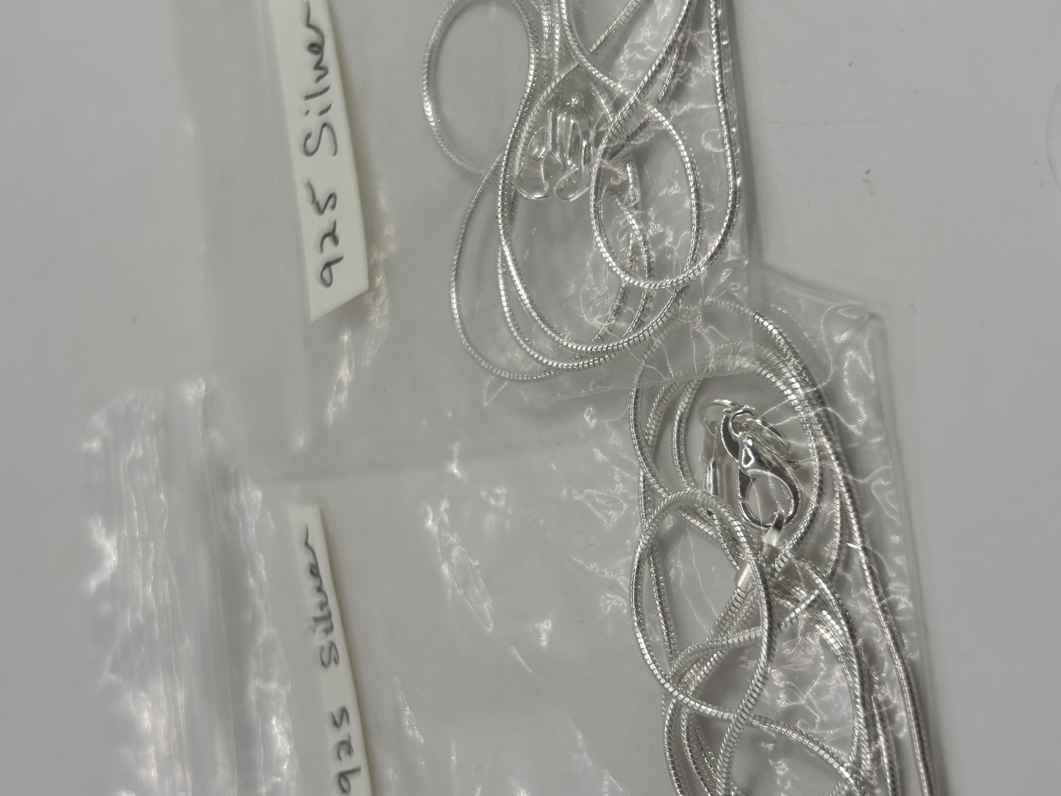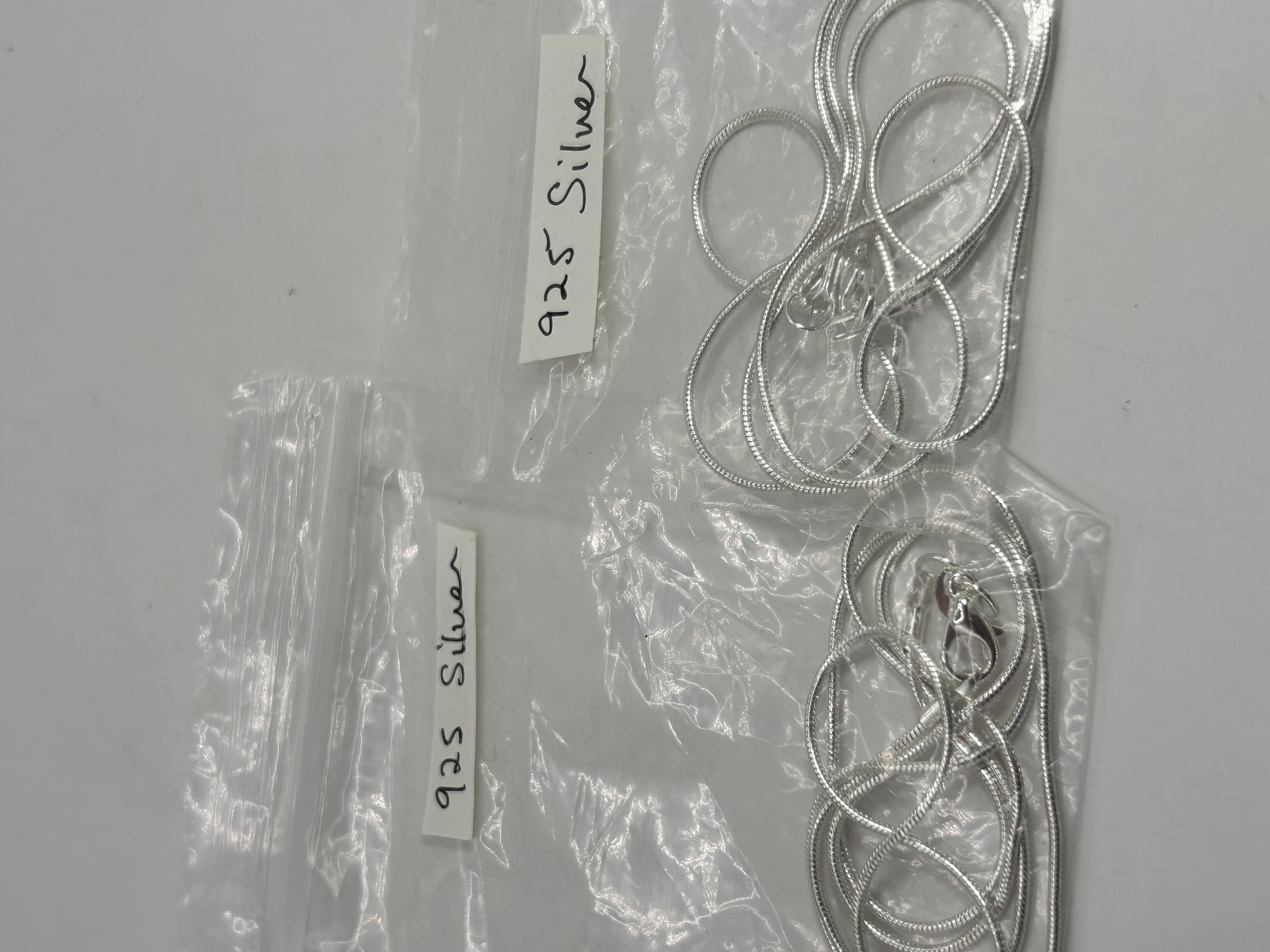 A pair of 925 sterling silver snake chain necklaces. Each chain is individually coiled and packaged within a clear plastic bag. Each bag bears a handwritten white paper label marked “925 Silver.” The chains appear new or unused.