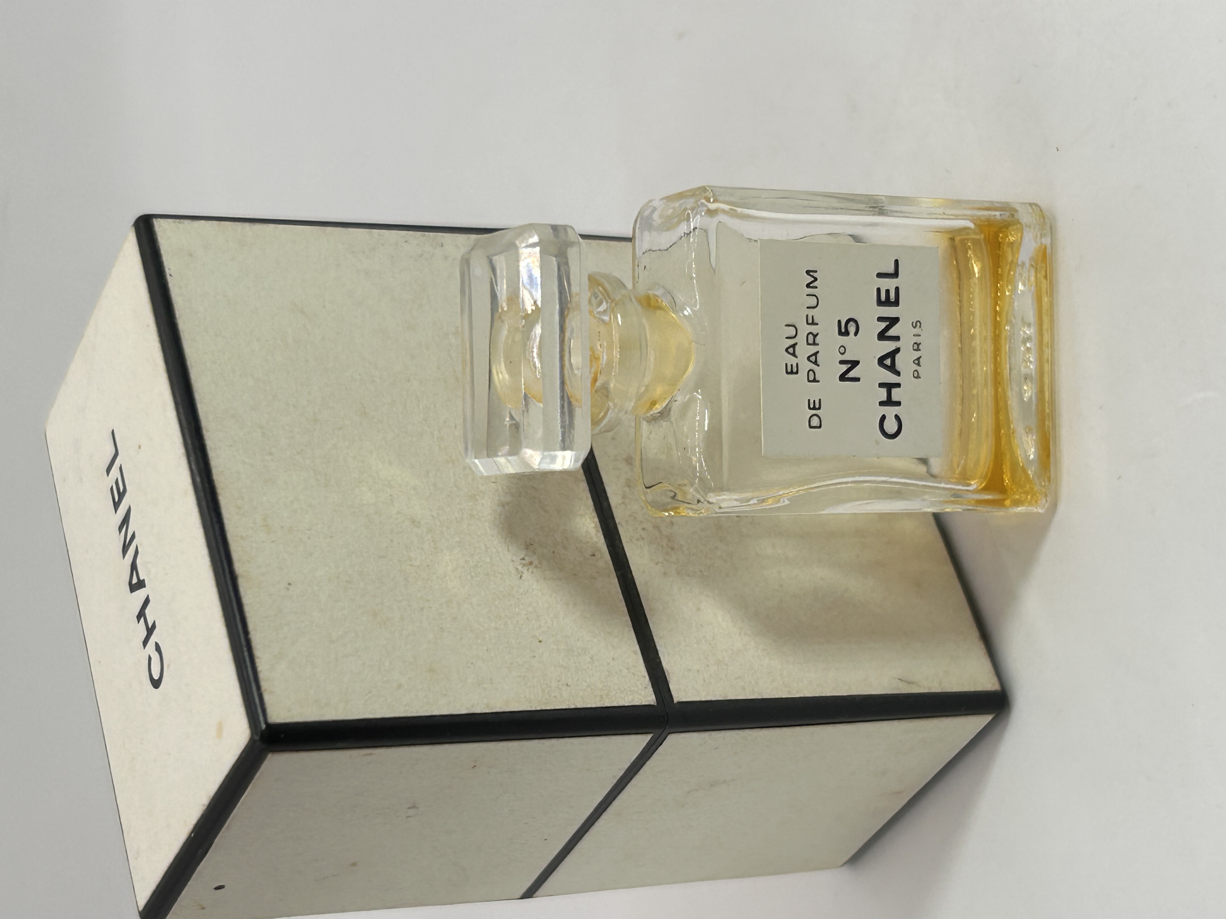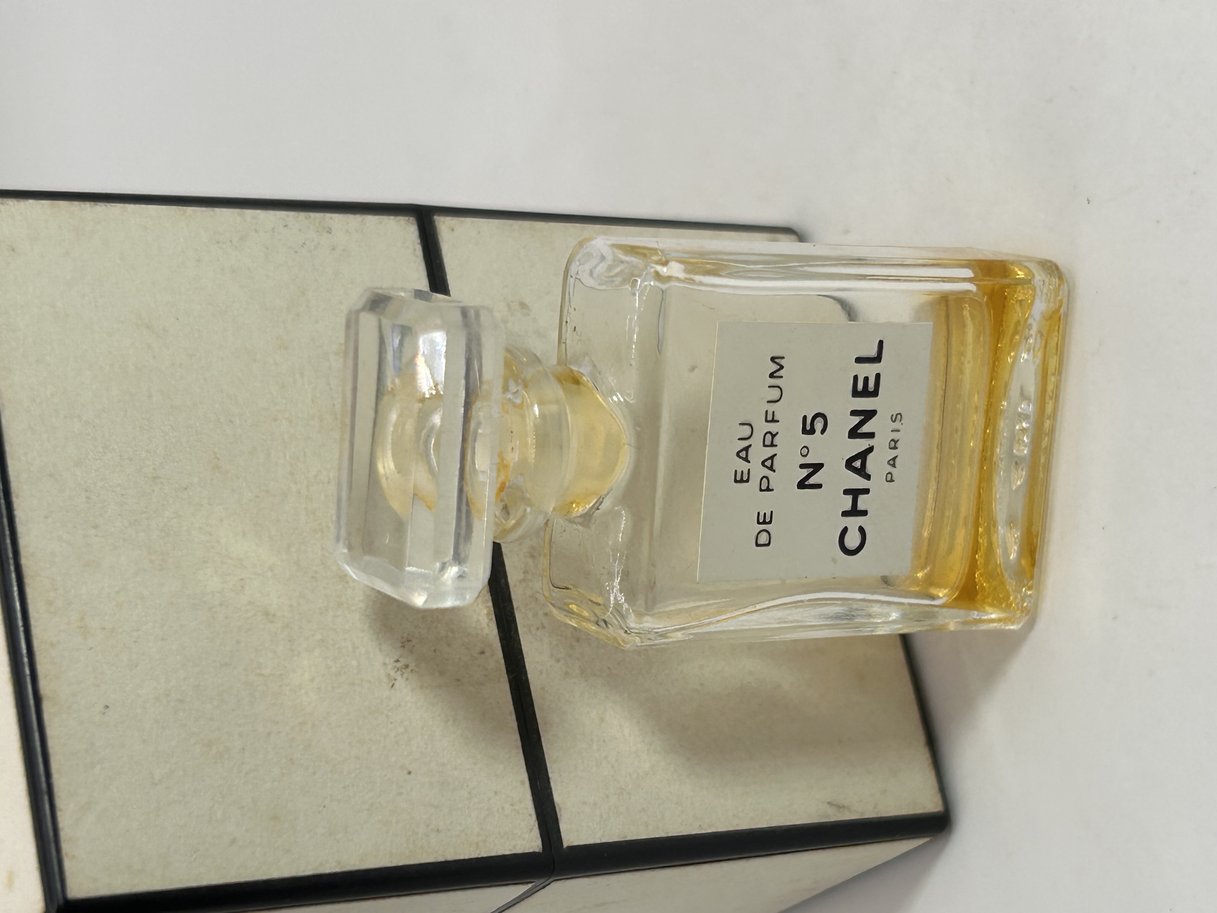 A vintage Miniature Chanel N°5 Eau de Parfum bottle and its original presentation box. The rectangular clear glass bottle features a faceted glass stopper and contains an amber-yellow liquid. A white label on the bottle is printed with “EAU DE PARFUM”, “N°5”, “CHANEL”, and “PARIS”. The accompanying off-white cardboard box, marked “CHANEL” on the lid, exhibits black border trim.