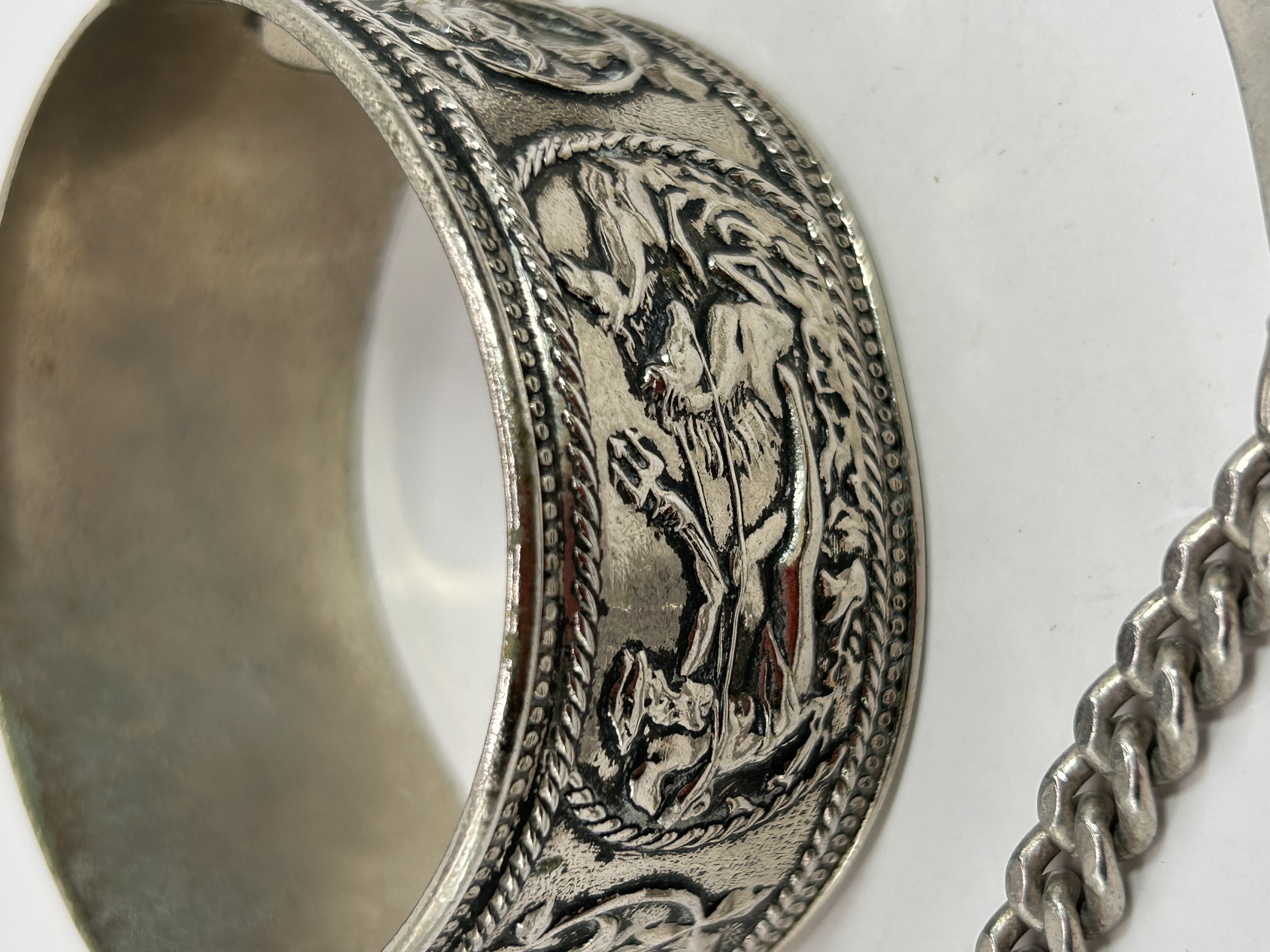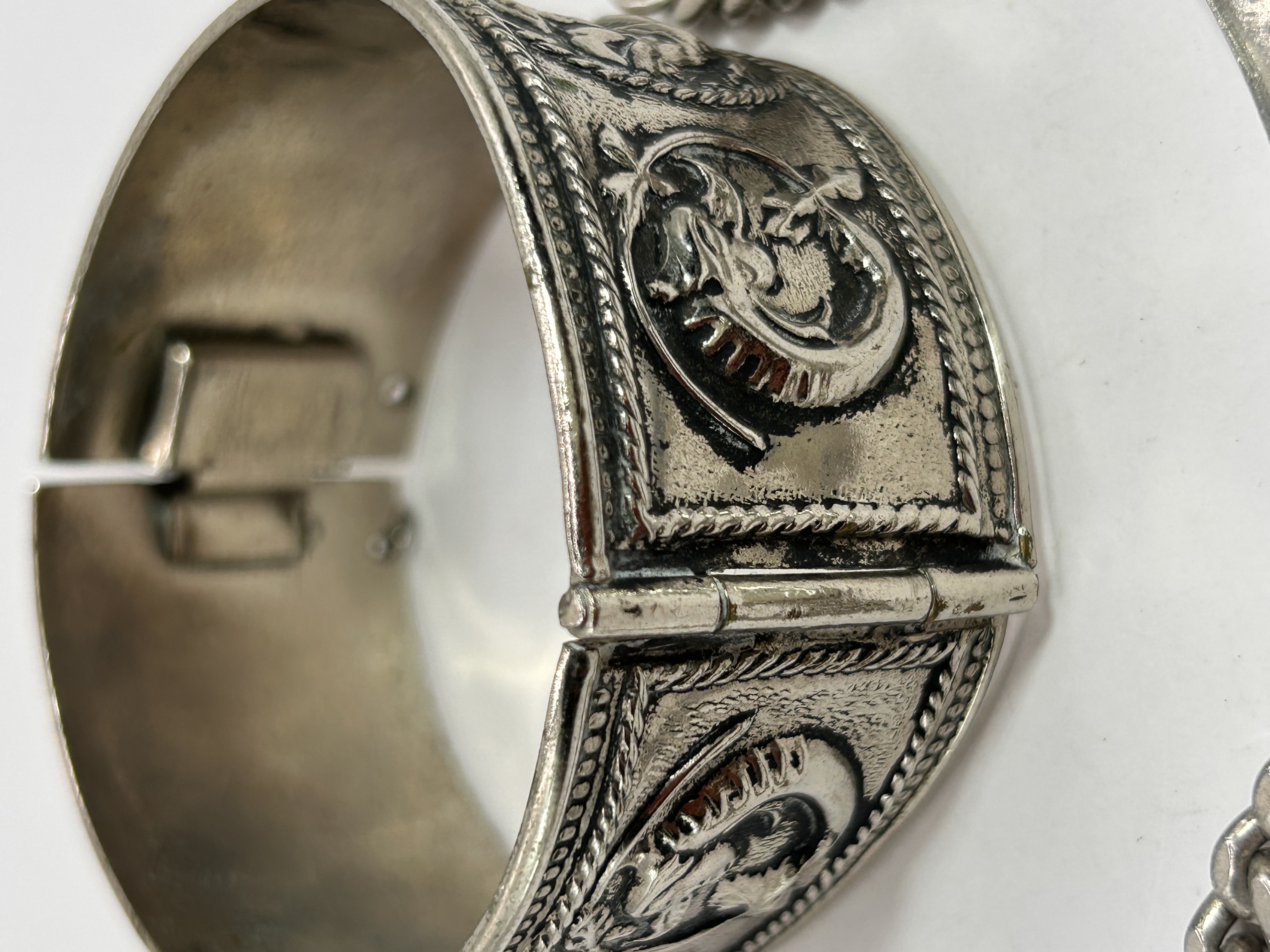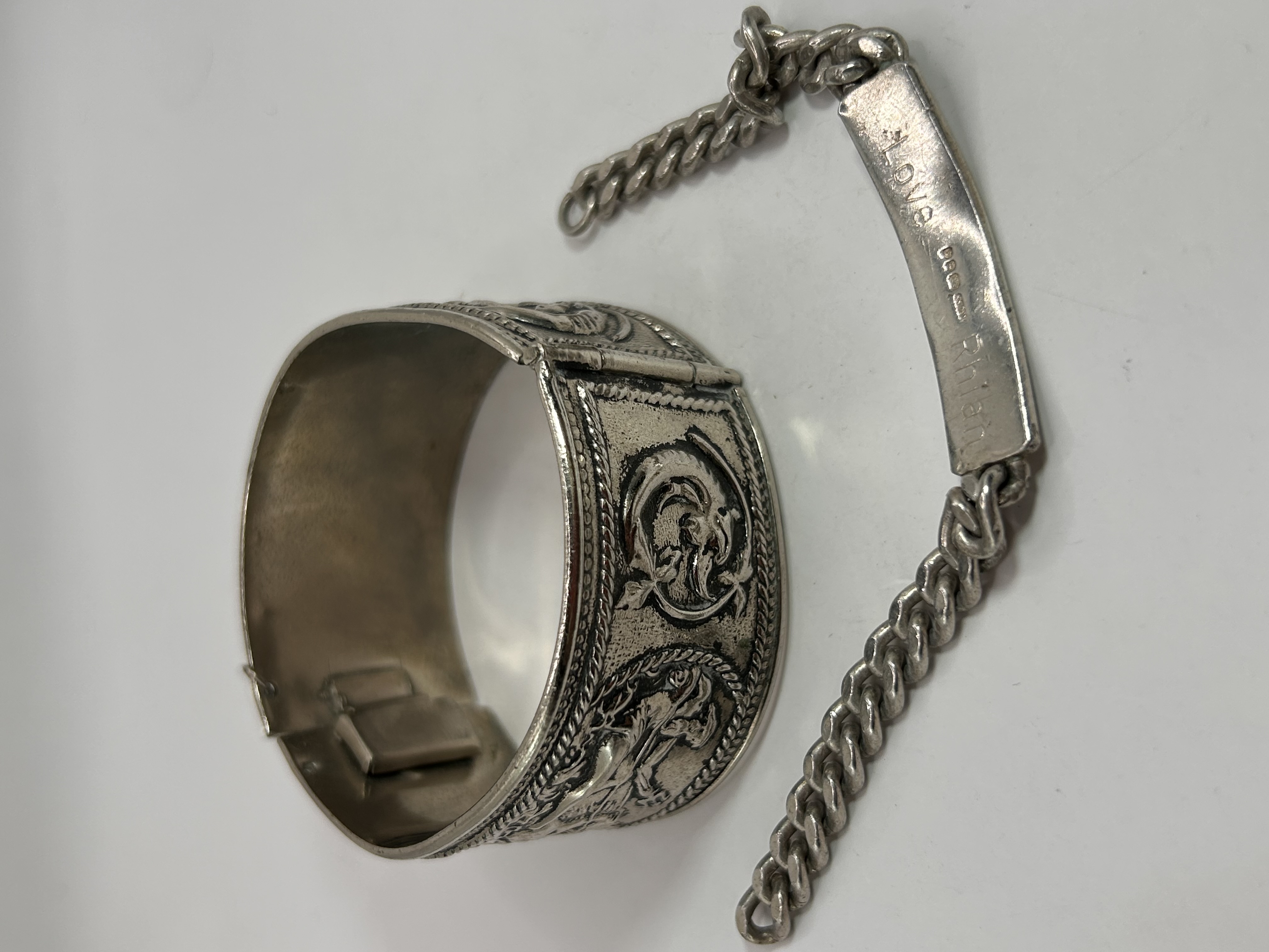 A vintage hinged cuff bracelet attributed to Topazio, crafted from silver. This wide, hinged cuff bangle features an oxidized finish, displaying a continuous band of ornate repoussé or cast decoration, including alternating framed oval motifs depicting classical or mythological figures, such as a person on horseback, alongside abstract foliate or scroll motifs. The decoration is bordered by a textured edge. It secures with a visible box clasp. Accompanying this is a curb-link chain bracelet featuring a rectangular ID plate inscribed with the English text, ‘Love be Patient’.