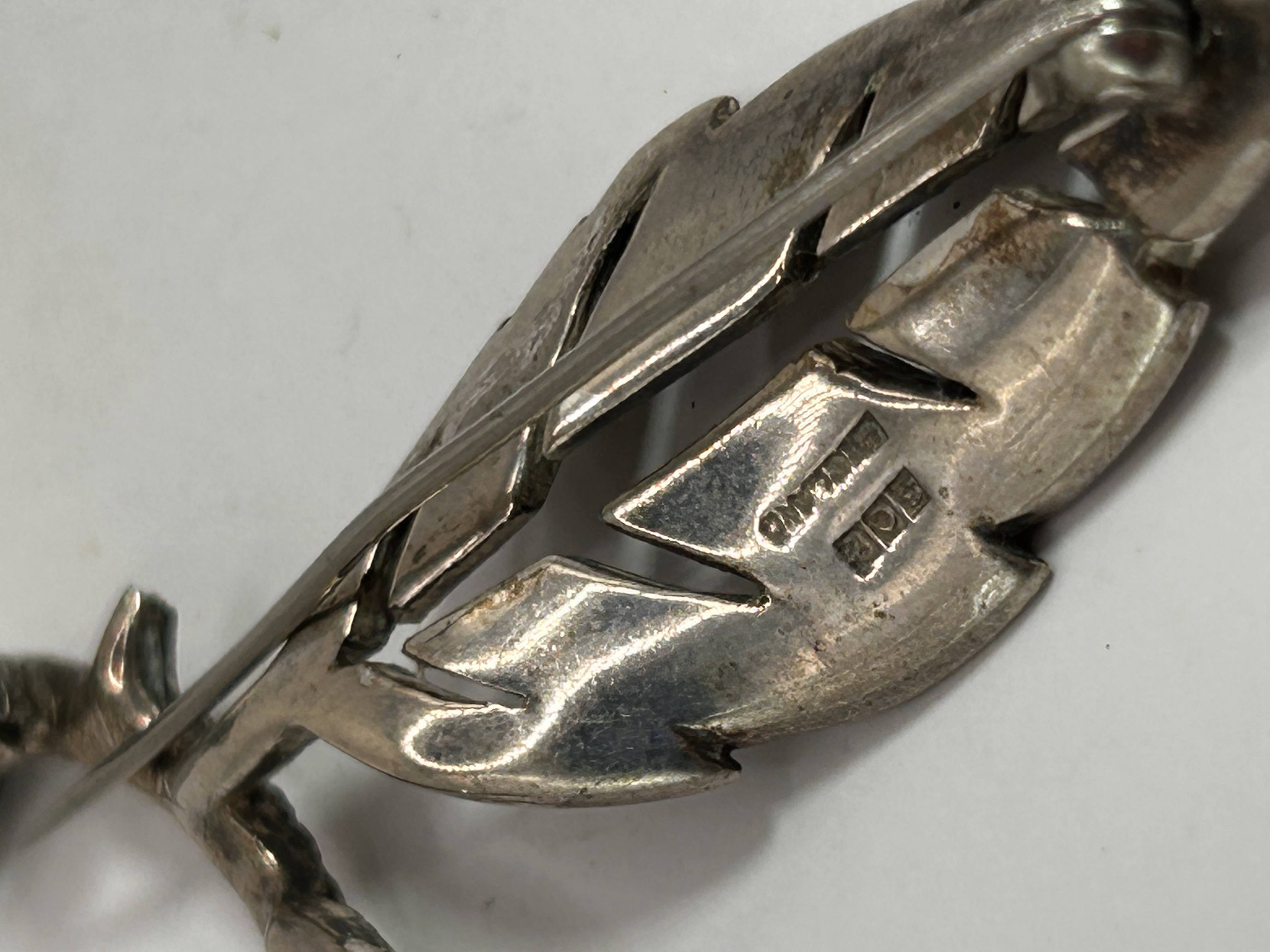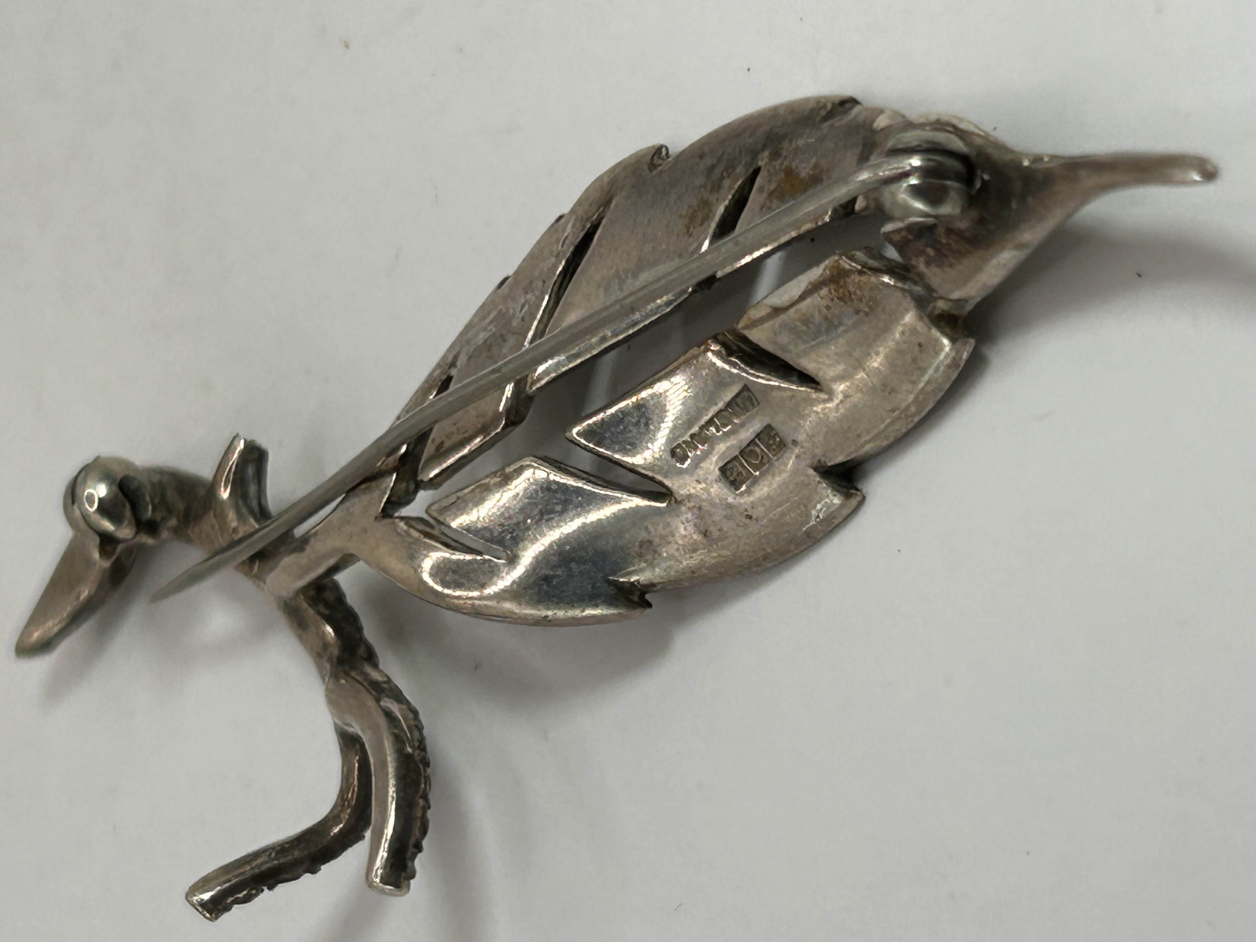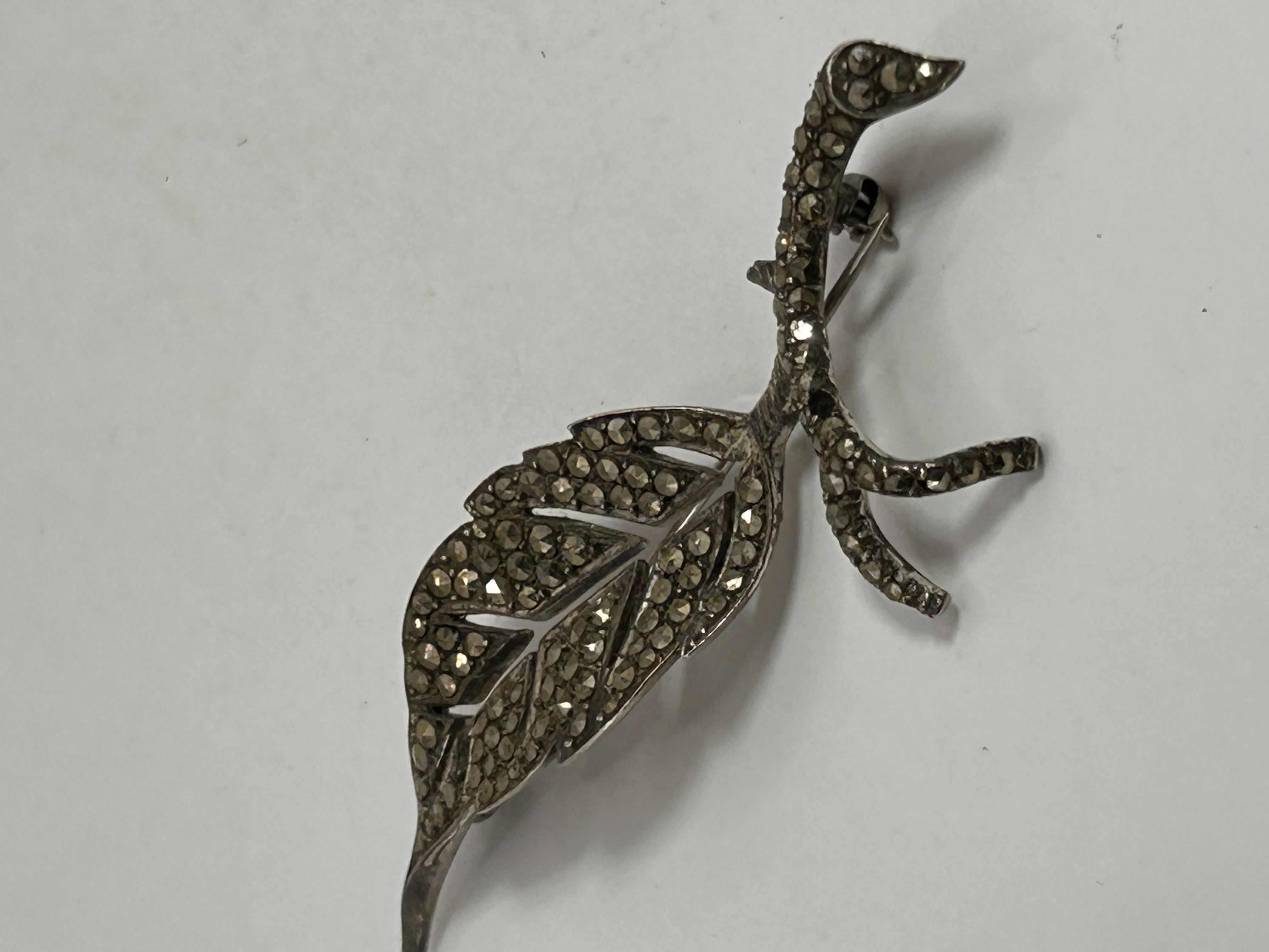 A Vintage Art Deco Sterling Silver Marcasite Feather Brooch. This sterling silver brooch features a stylized feather and a segment of a branch, entirely adorned with numerous small, faceted marcasite stones. The design is nature-inspired, characteristic of decorative jewelry from the period. The reverse of the brooch reveals a functional pin-back mechanism and is clearly stamped “STERLING” along with additional, partially legible hallmarks or maker’s marks below it.