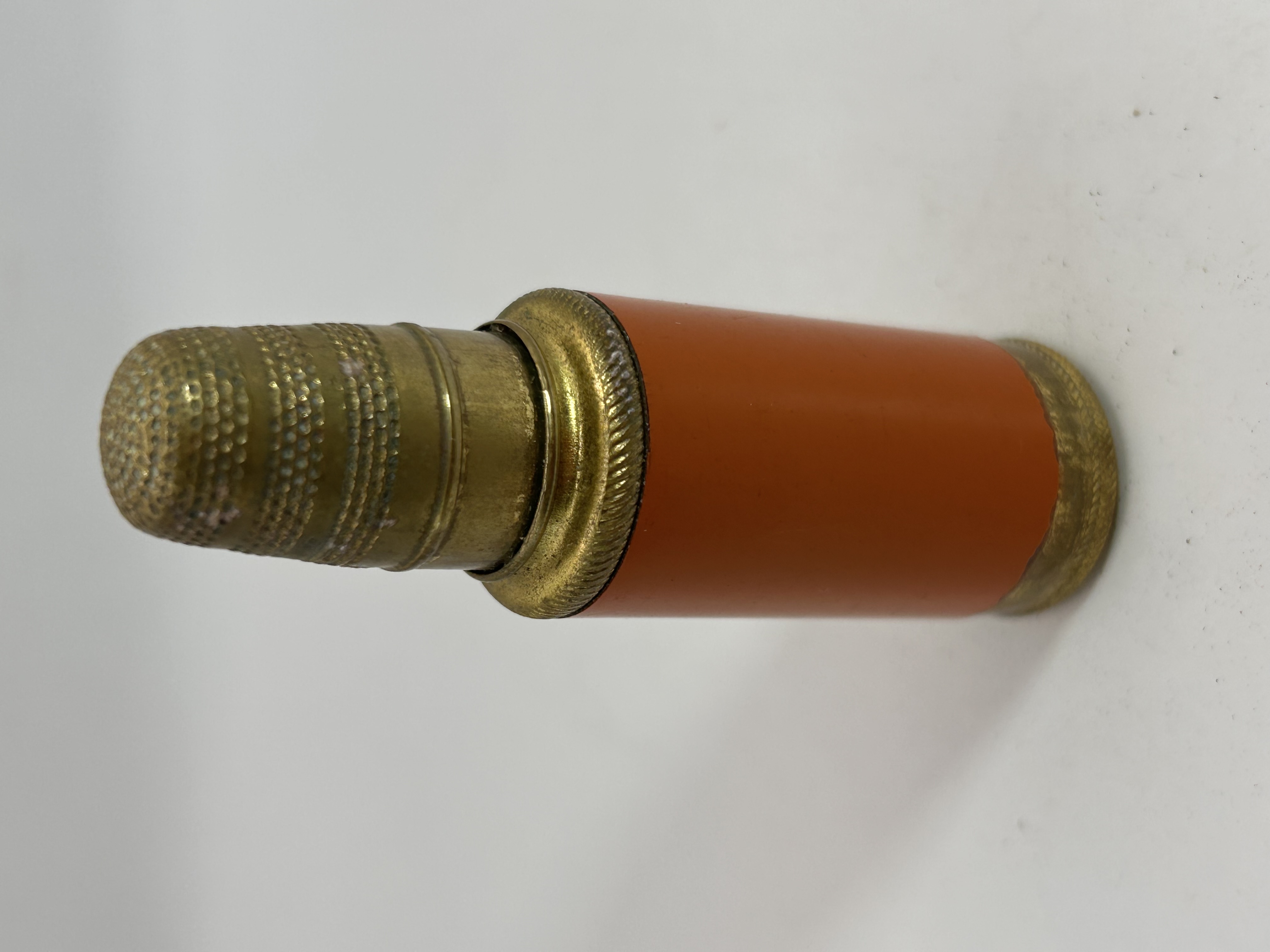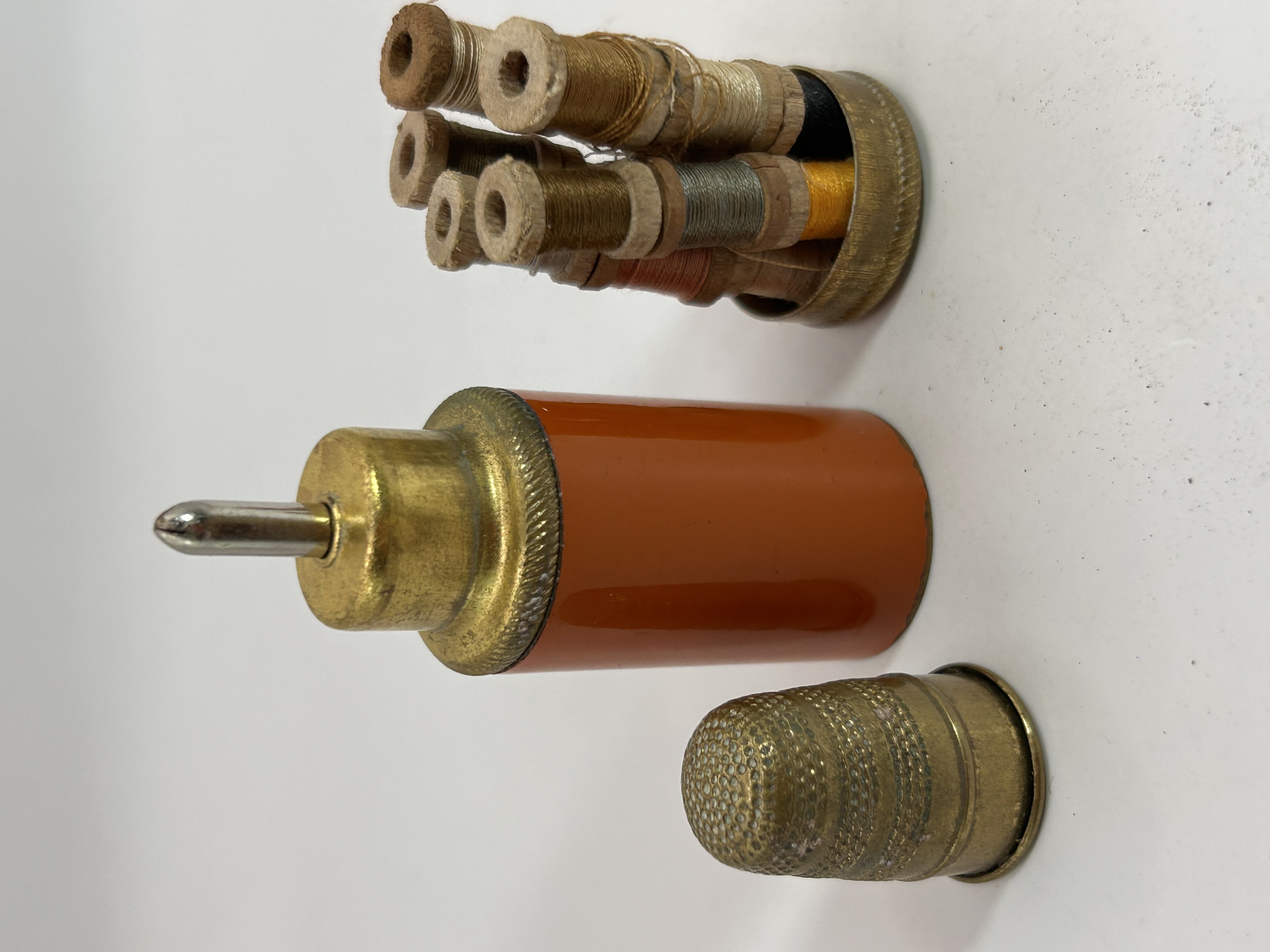 A vintage bullet-shaped sewing kit, comprising a cylindrical brass-toned metal body with an orange enameled or painted finish, which functions as a needle holder with a metal pin protruding from its top. Accompanying it is a separate brass-toned thimble, likely intended as a cap for the main body, and a small, round brass-toned tray containing multiple miniature spools of assorted colored threads. The brass components display a warm patina. No visible text or manufacturer markings are present.