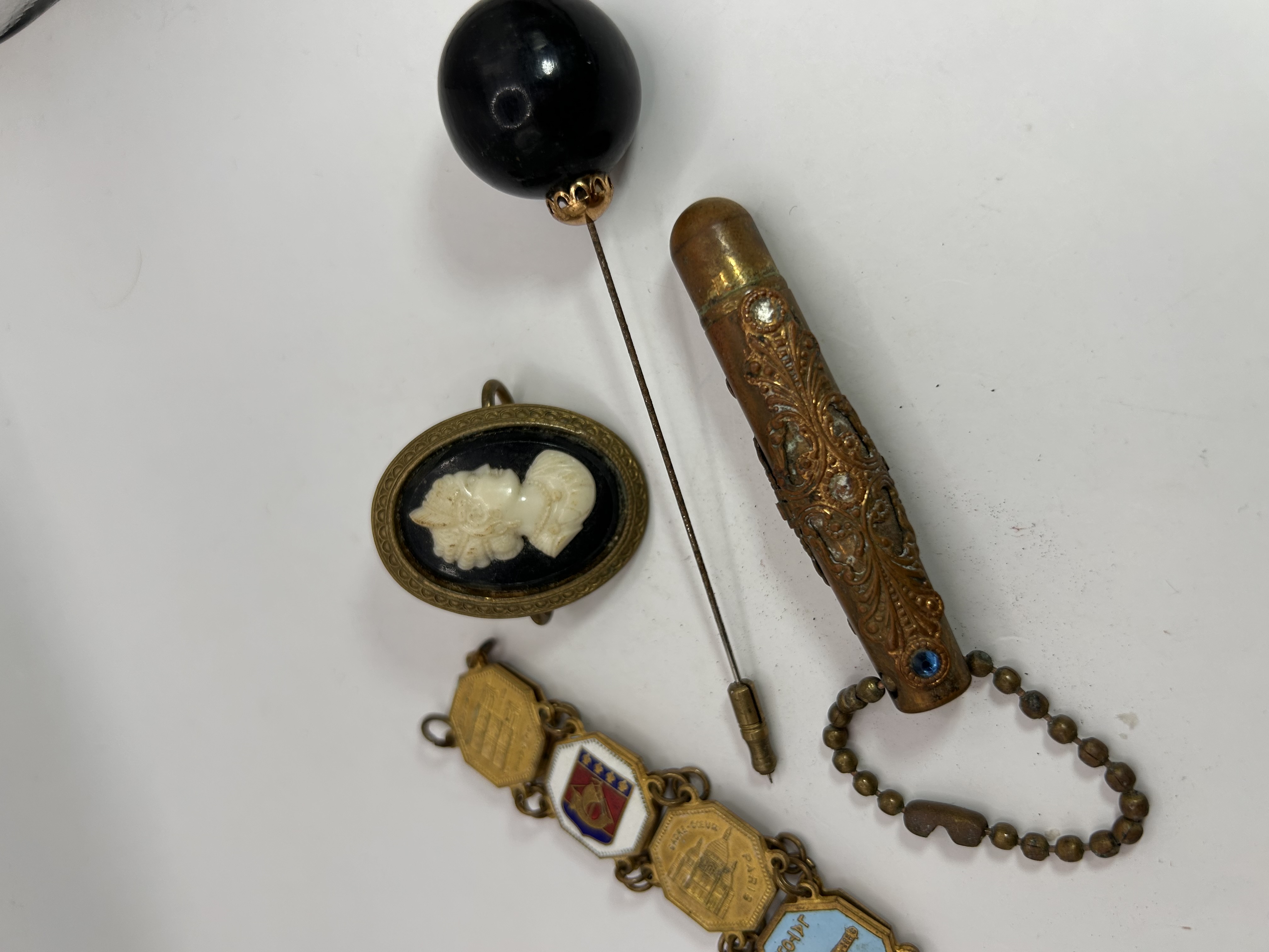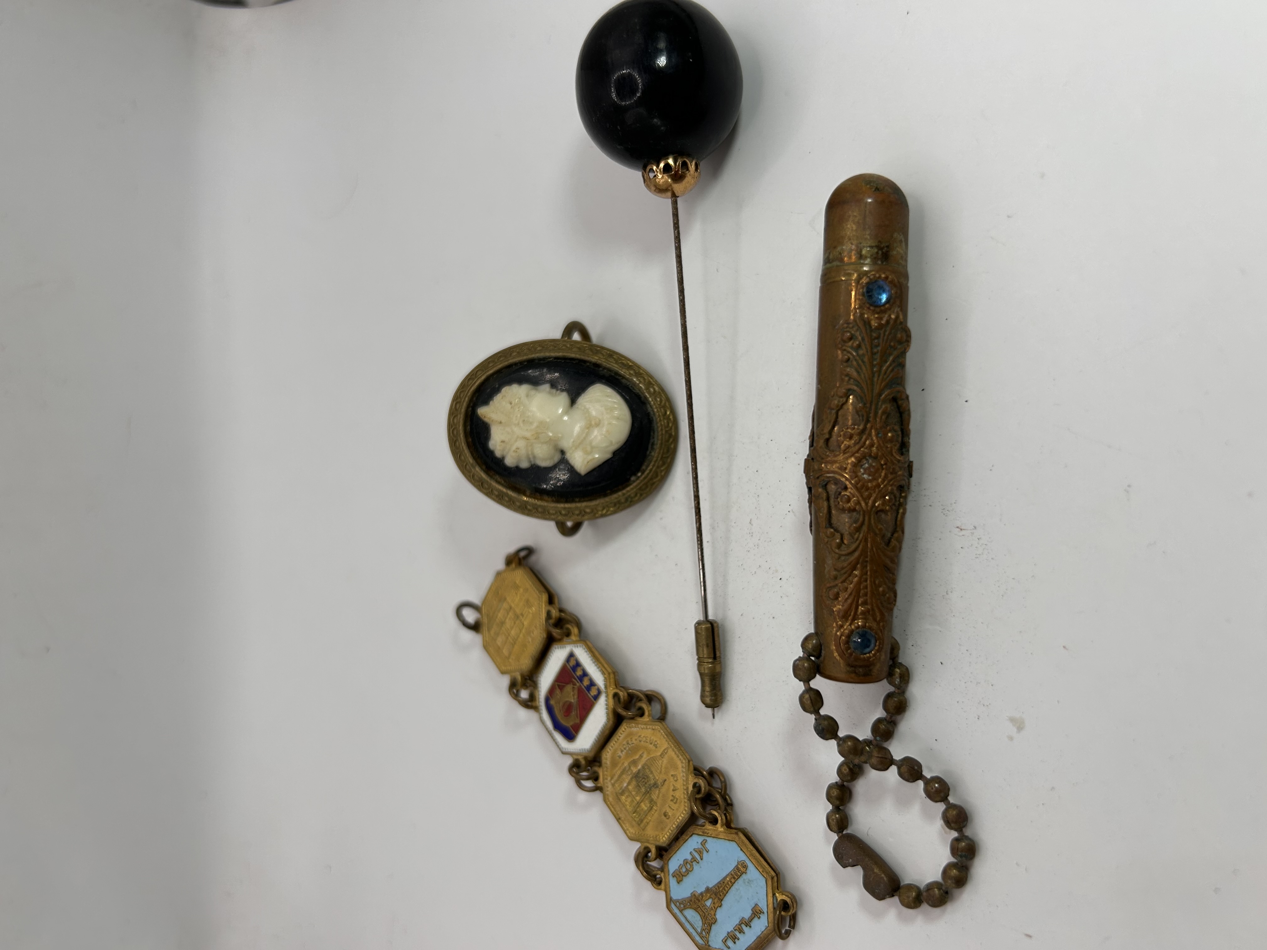 Comprising a vintage brass Paris France souvenir enamel link bracelet, featuring multiple enamel charms depicting various landmarks and crests, notably including the Eiffel Tower and the legible text “PARIS”. Also included is an oval-shaped ring set with a white carved cameo of a female profile against a black ground, framed by a gold-tone bezel; a long hat pin topped with a large, spherical black head and a smaller gold-tone collar; and an ornate cylindrical metal case, likely brass or copper, exhibiting a patinated finish and intricate embossed floral designs, further embellished with two small blue cabochon accents, all attached to a metal ball chain.