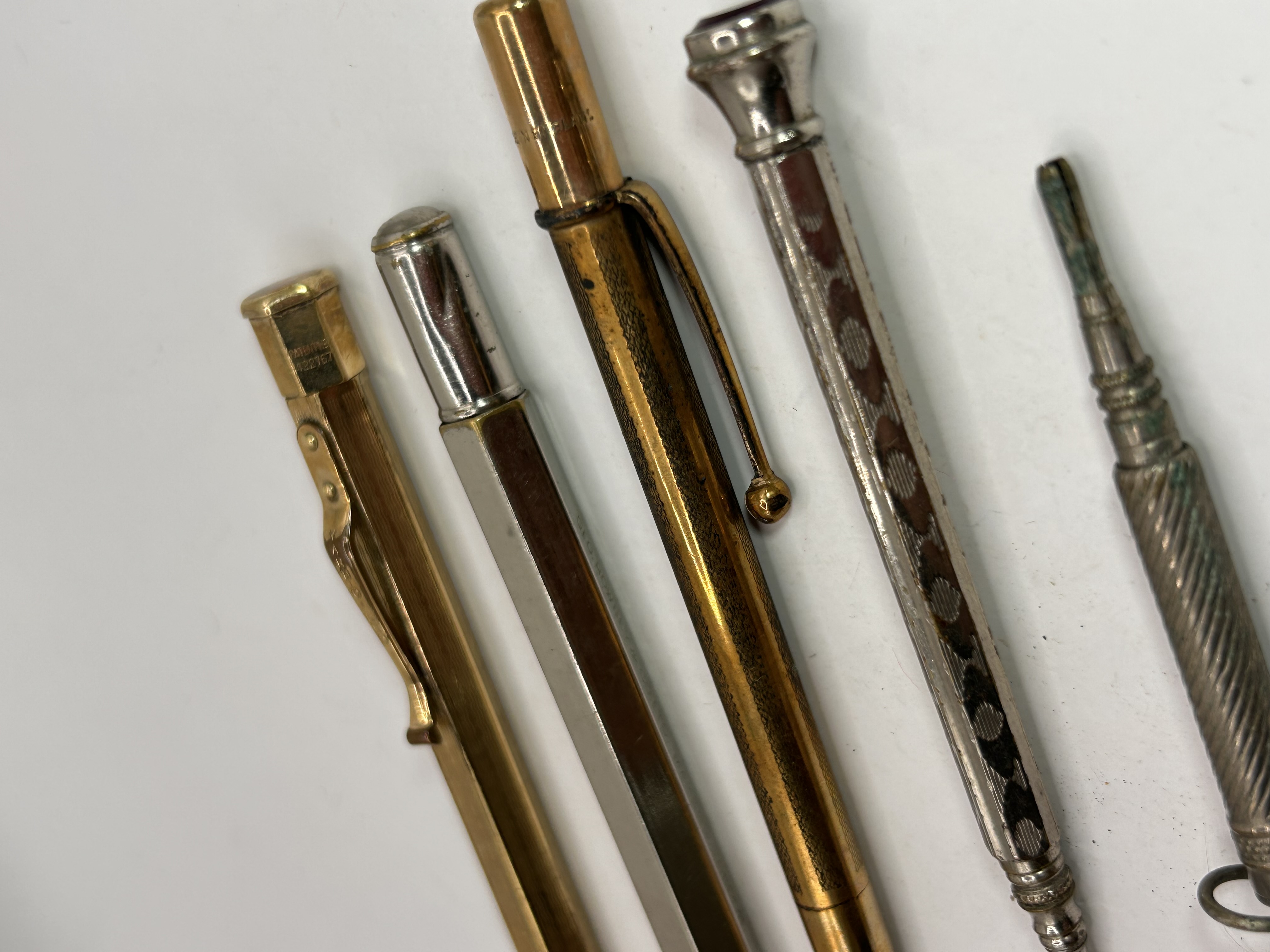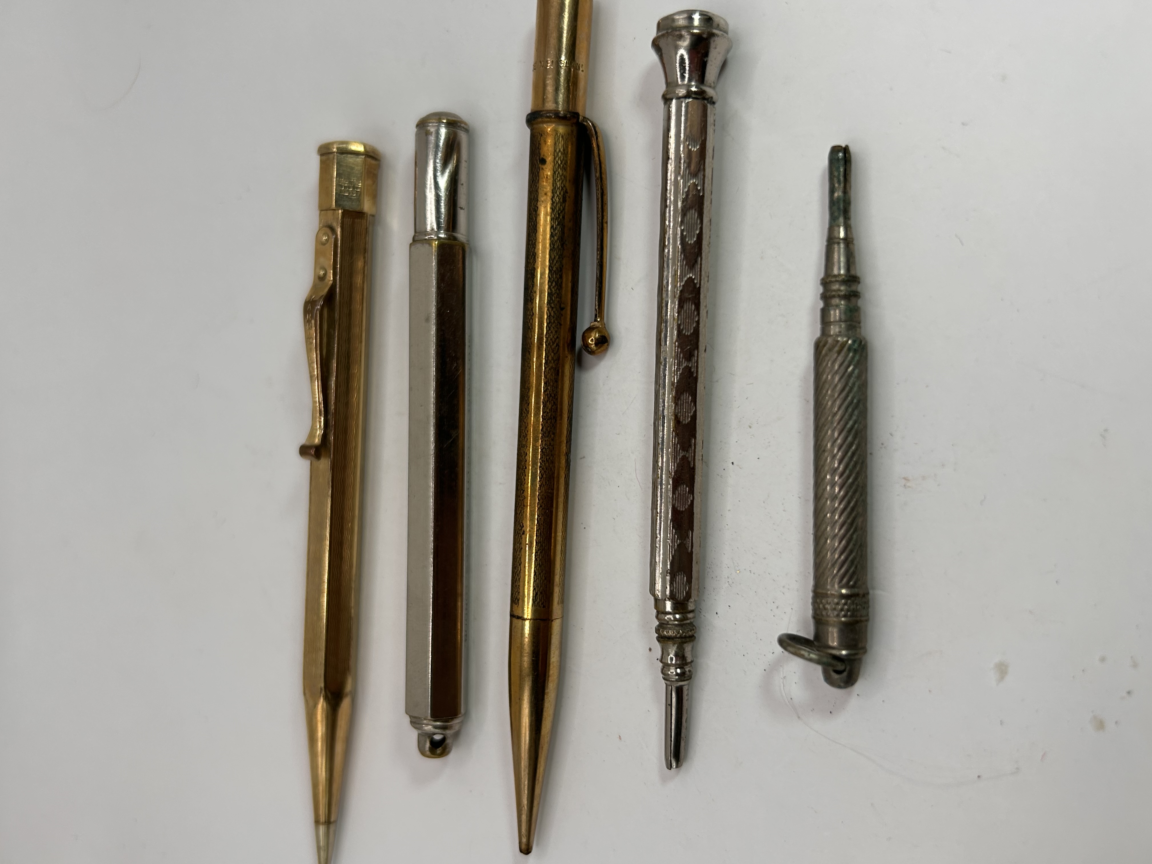 A group of five vintage writing instruments and a small implement. The collection comprises two hexagonal-barreled mechanical pencils: one yellow metal example marked “CROSS” and “1/20 10K”, and one plain silver-toned model. Also included are two cylindrical mechanical pencils: a yellow metal example with engraved scrollwork and a pocket clip, and a highly decorative silver-toned example with intricate floral/geometric engraving and a fluted finial. The fifth item is a small, slender, ribbed silver-toned tool with a ring finial. Materials are primarily various yellow and silver-toned metals, likely brass, gold-filled, silver, or plated alloys. The items suggest an early to mid-20th-century period for the more ornate pieces.