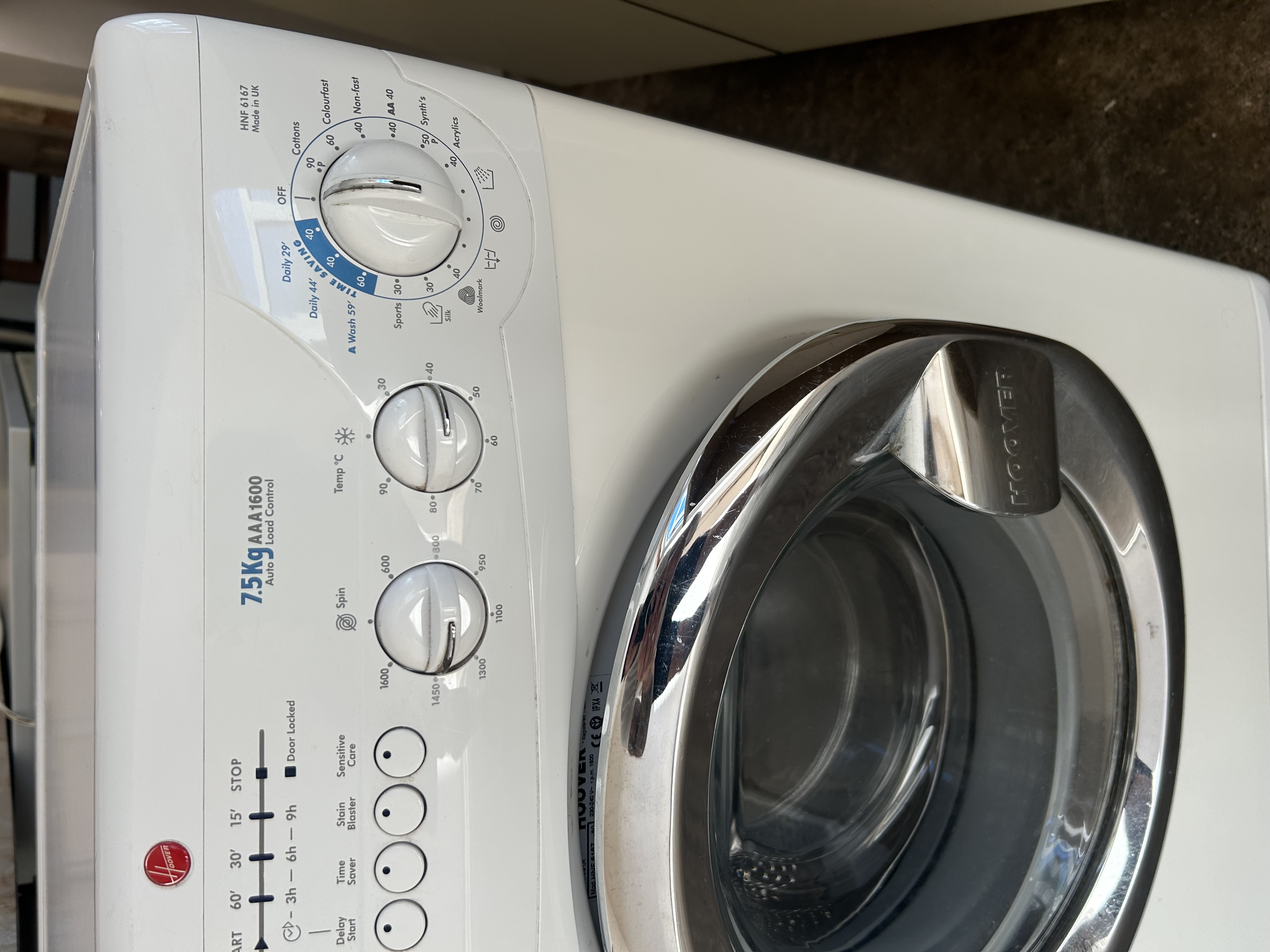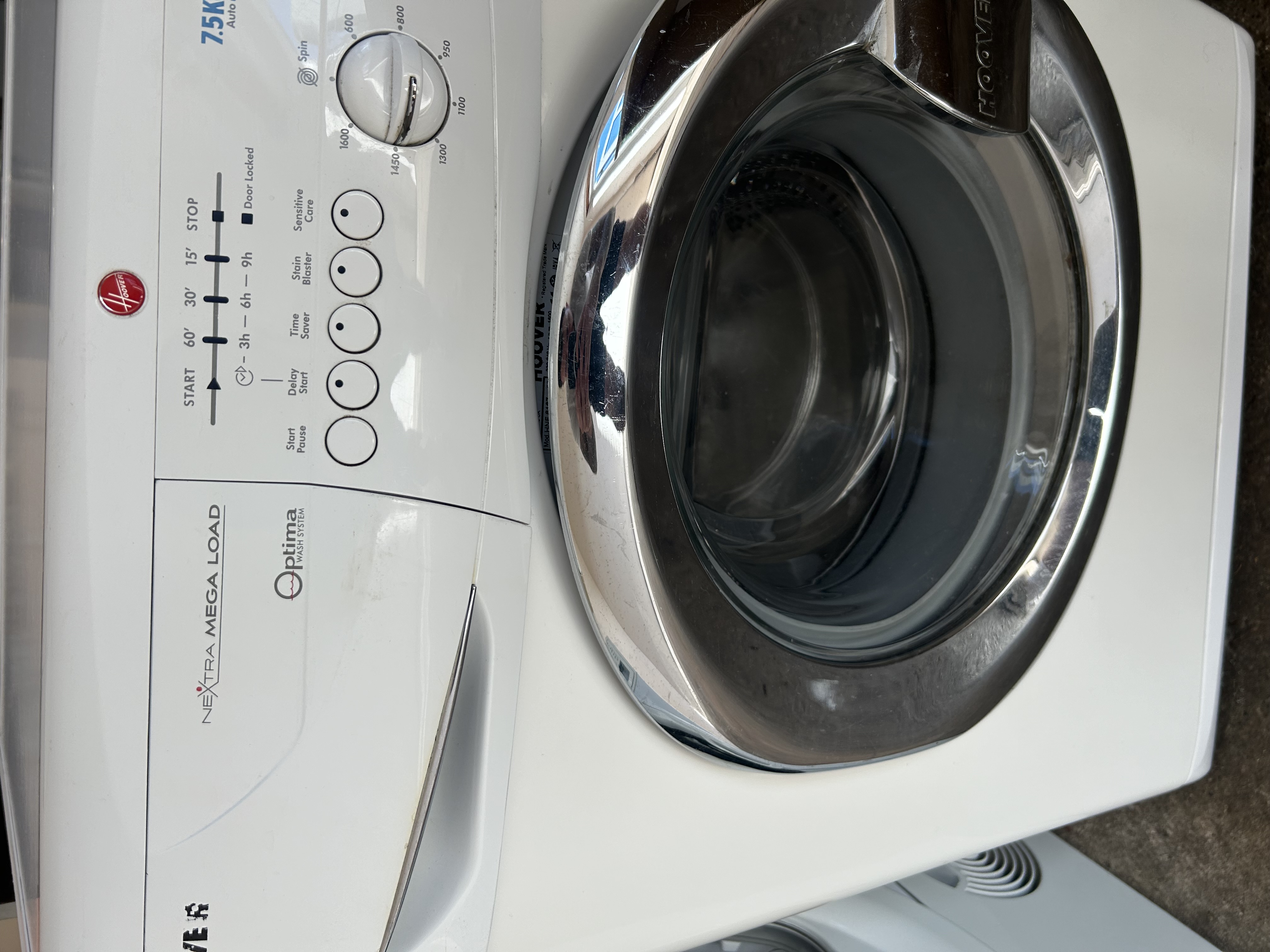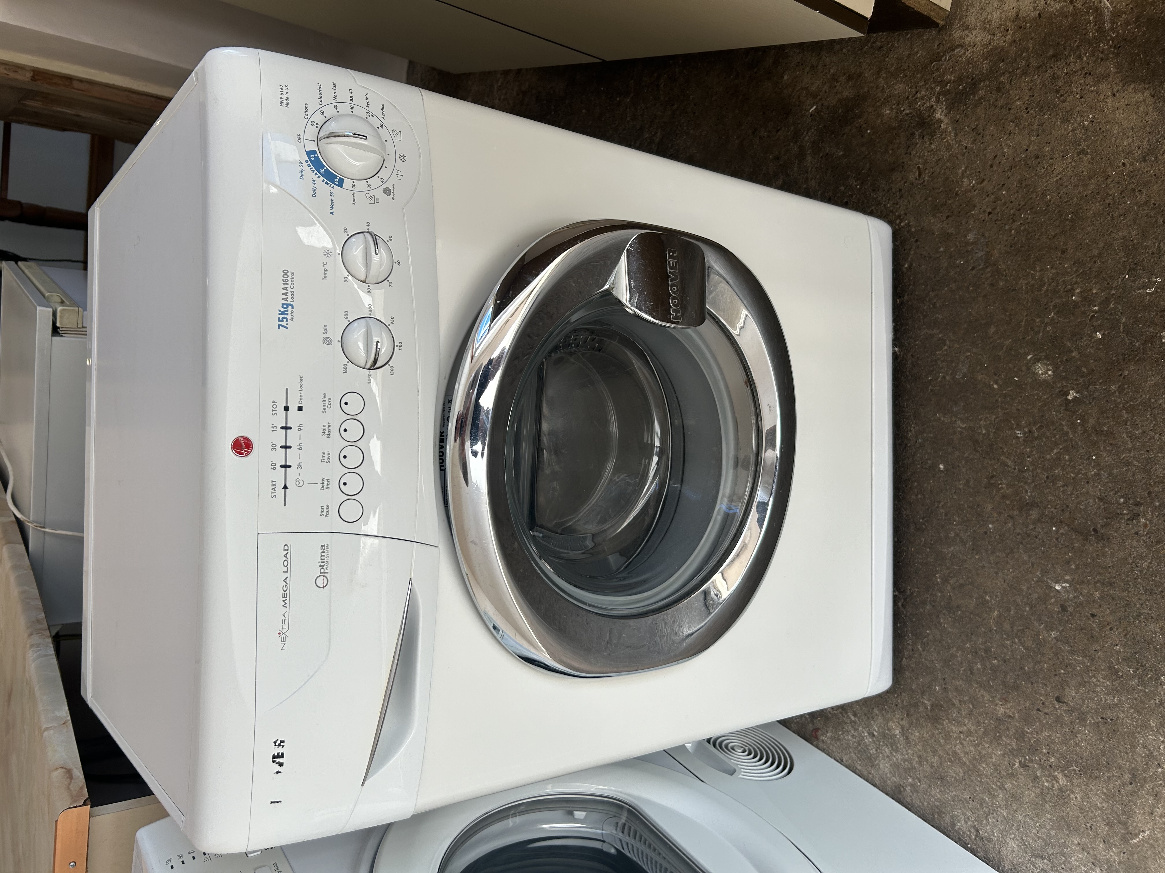 A white, modern, front-loading domestic washing machine by Hoover. The control panel features a red Hoover logo and includes push-button functions such as “START,” “STOP,” “Delay Start,” “Time Saver,” “Stain Blaster,” and “Sensitive Care.” It also has rotary dials for spin speed, offering options up to 1600 rpm, and temperature, up to 90°C, alongside a larger program selector dial. Visible text on the machine identifies it as “NEXTRA MEGA LOAD,” featuring an “Optima WASH SYSTEM,” and specifies it as a “7.5KG Auto Load Control AAA1600” model “HNF 6167.” The machine is noted as “Made in UK.” Constructed from white painted metal or enamel, it features a prominent, reflective chrome-look metallic trim around the circular front porthole door, which has “HOOVER” embossed on its handle.