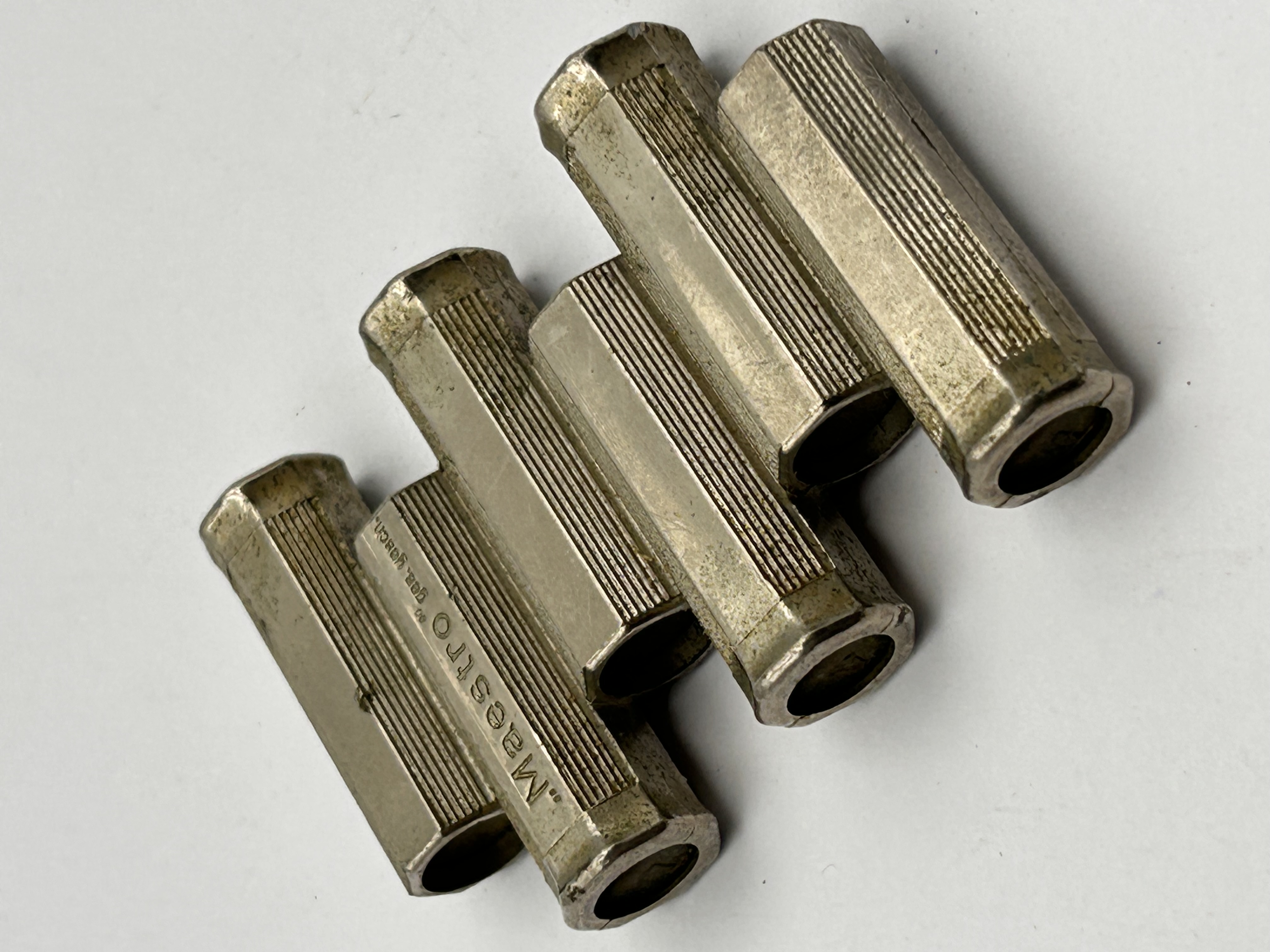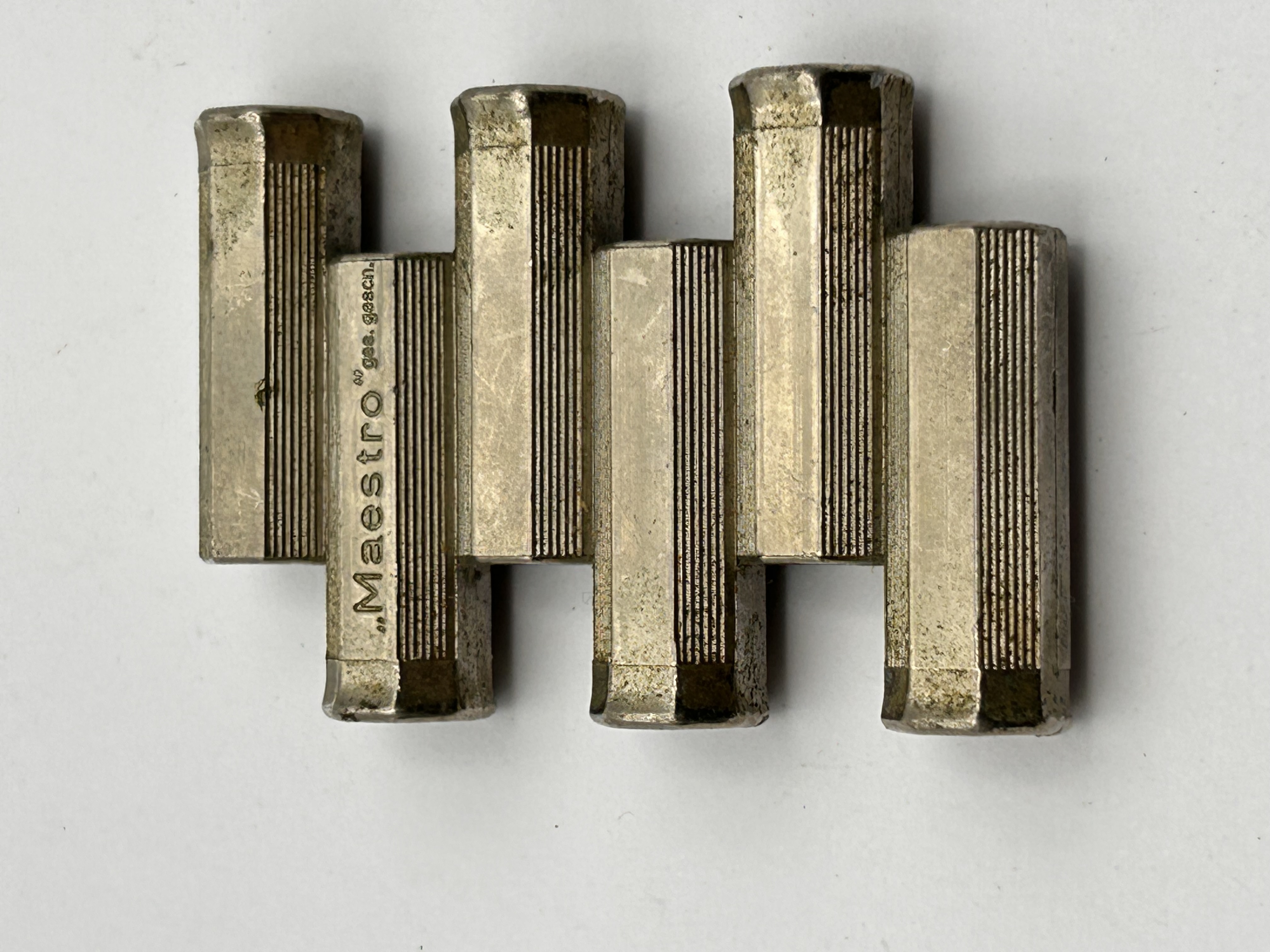 A set of Six vintage German Maestro ges. gesch. pitch pipe reeds. Each hexagonal-bar-shaped component, likely a key or reed for a larger tuning device, features a central bore and a finely ribbed or fluted pattern along its body, terminating in a faceted cap at each end. One piece is visibly marked ‘Maestro’ and ‘ges. gesch.’ (legally protected/patented). The material is a silver-toned metal.