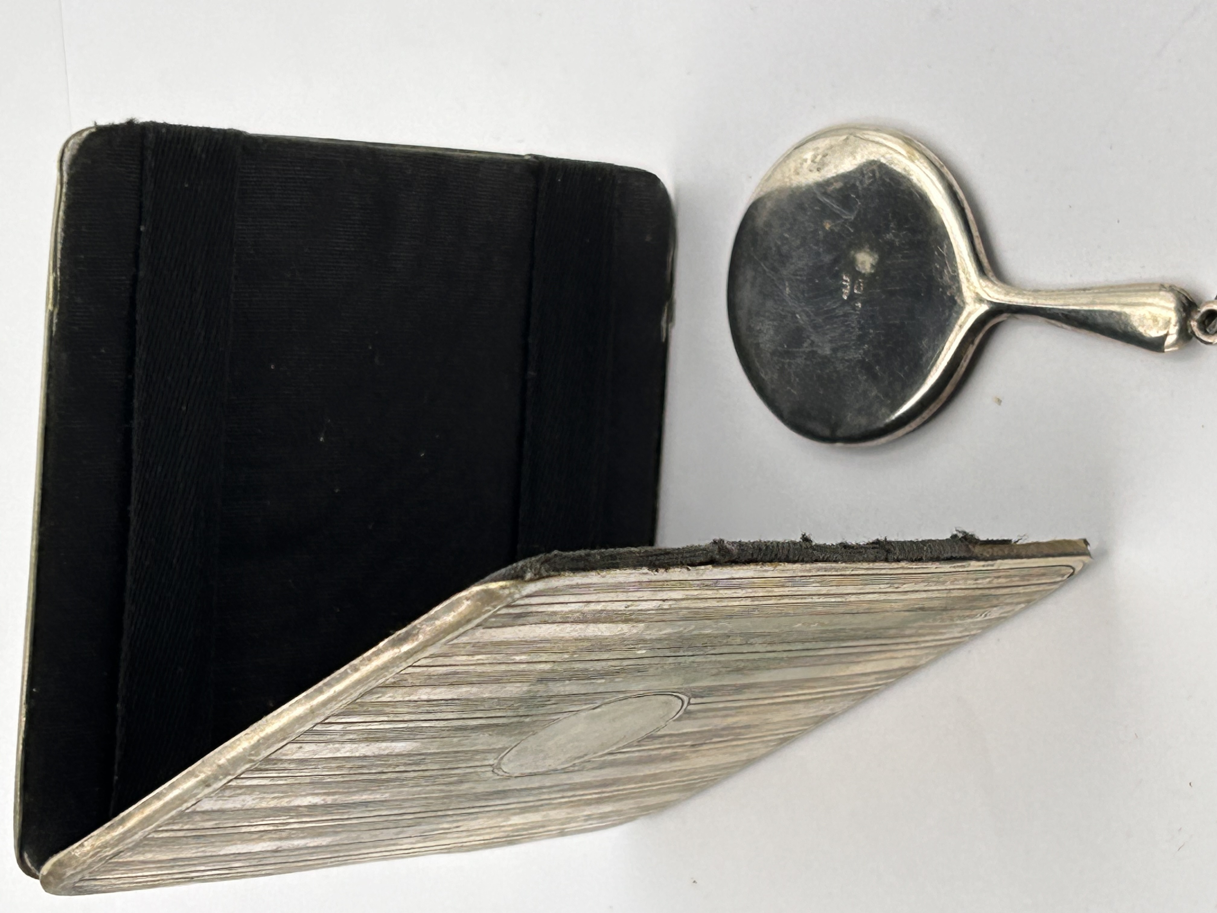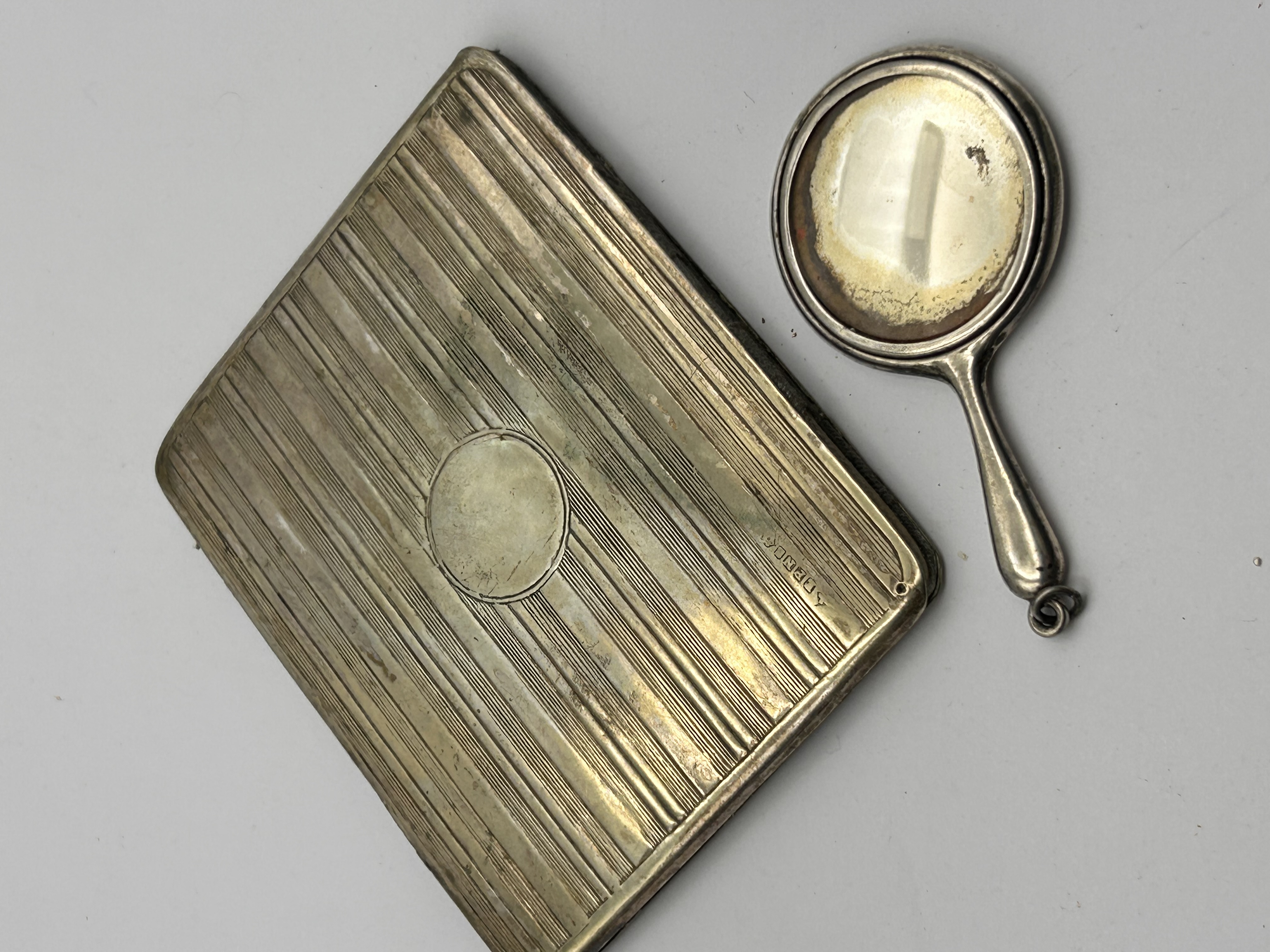 This lot comprises a rectangular hinged EPNS Wallet and a circular handheld mirror. The compact case features fine vertical linear engraving with a central oval cartouche, characteristic of the Art Deco style. Its interior is lined with dark fabric and fitted with elastic straps. A visible stamp on the case reads ‘ARGENT,’ which translates from French to ‘silver.’ The accompanying circular handheld mirror has a simple tear-drop handle.