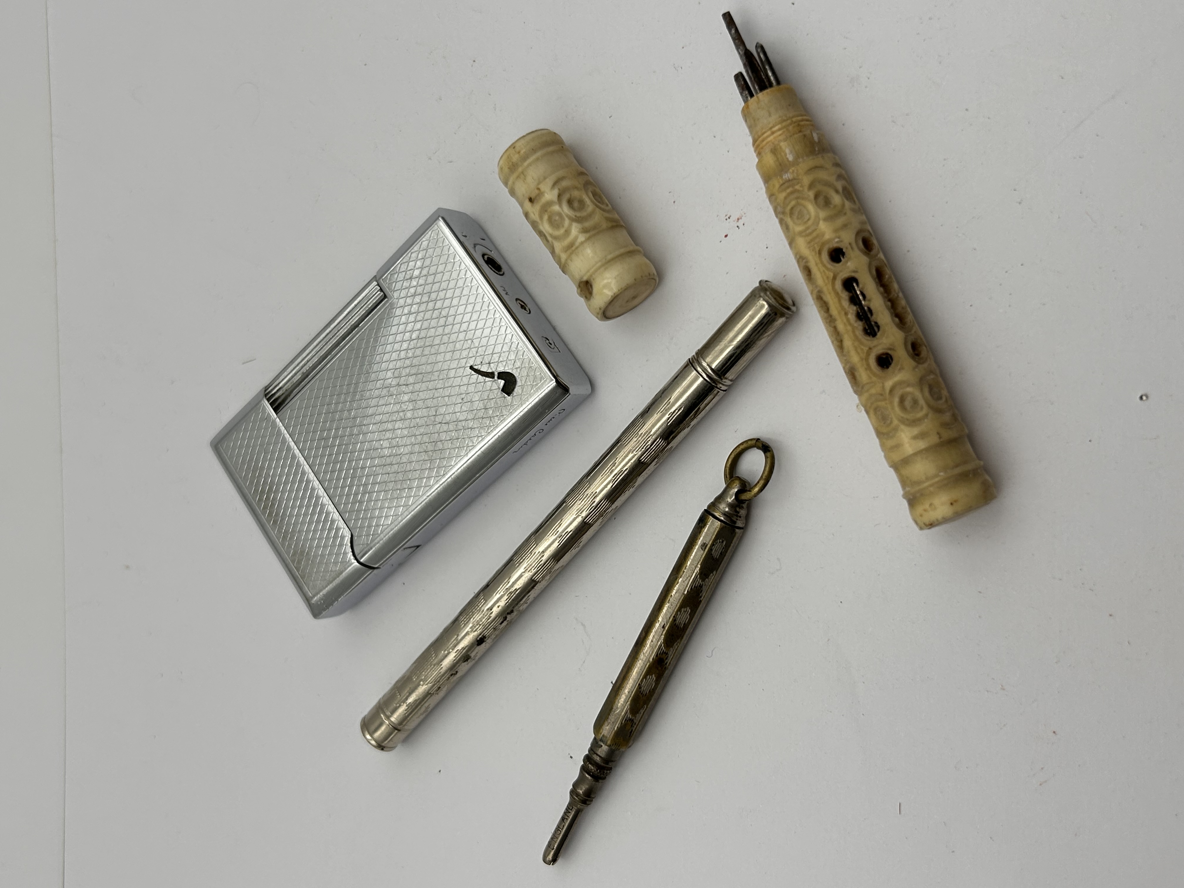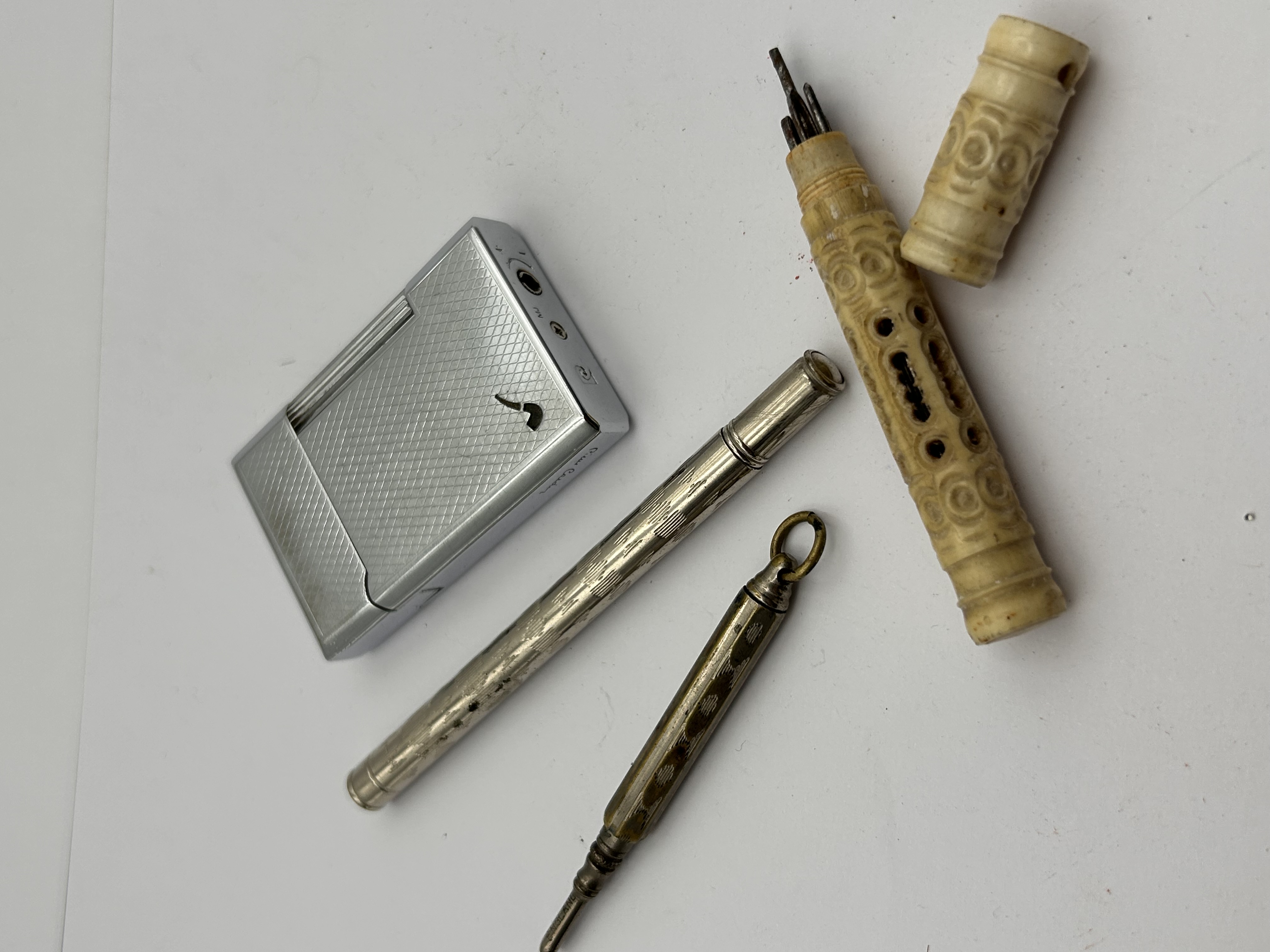 A collection of four vintage and antique personal accessories. The group comprises a rectangular, silver-toned metal gas lighter featuring a geometric engraved pattern, a prominent pipe logo, and partially visible text indicating ‘Pierre Cardin’. Also included is a slender, cylindrical silver-toned metal mechanical pencil or dip pen holder with engraved decoration. The collection further includes a small, brass-toned tool, possibly a stylus or awl, fitted with a suspension loop. Completing the assemblage are two intricately carved yellowish cylindrical cases, likely bone or ivory, one of which contains several pointed implements and is accompanied by a detached cap.