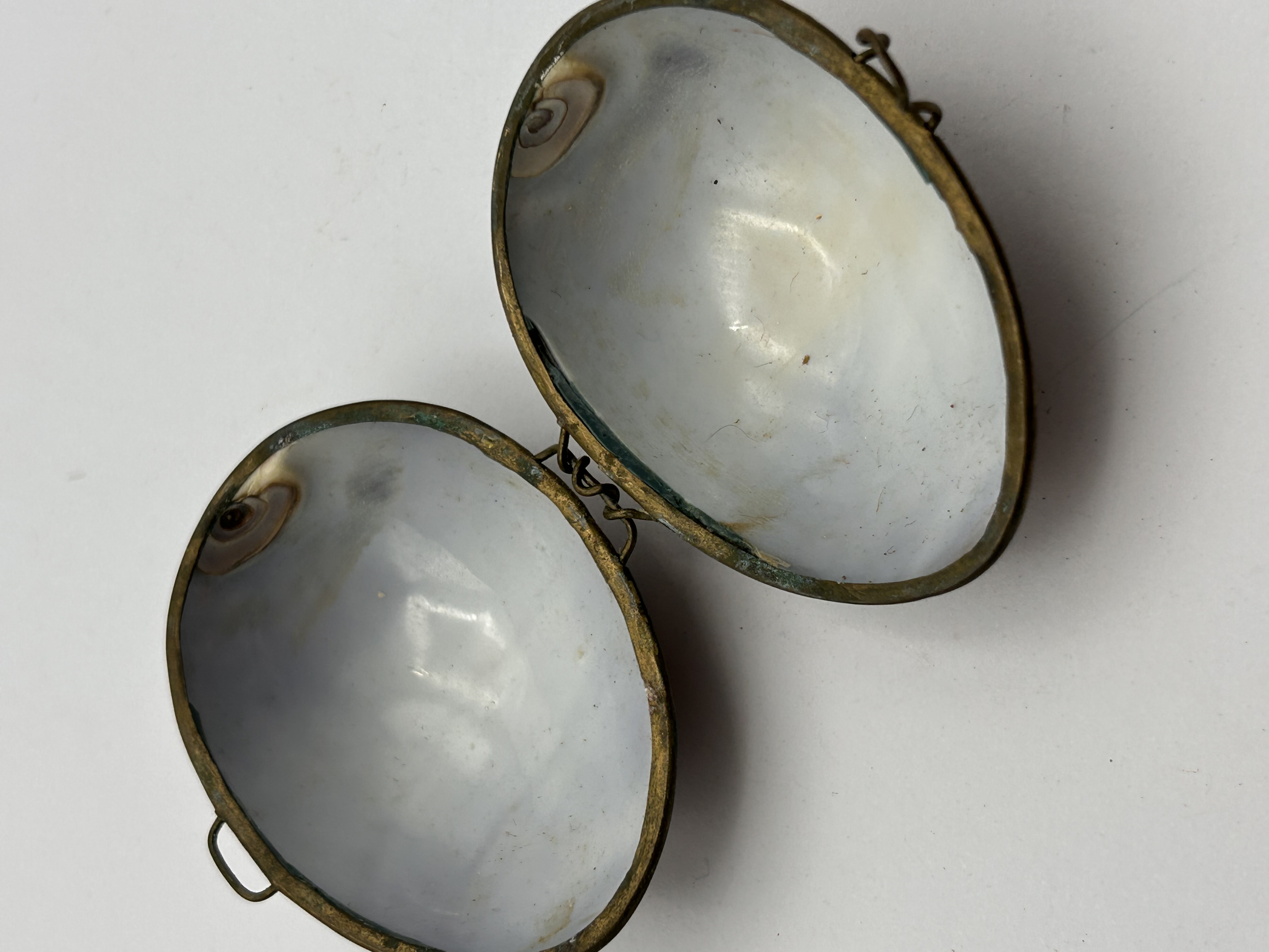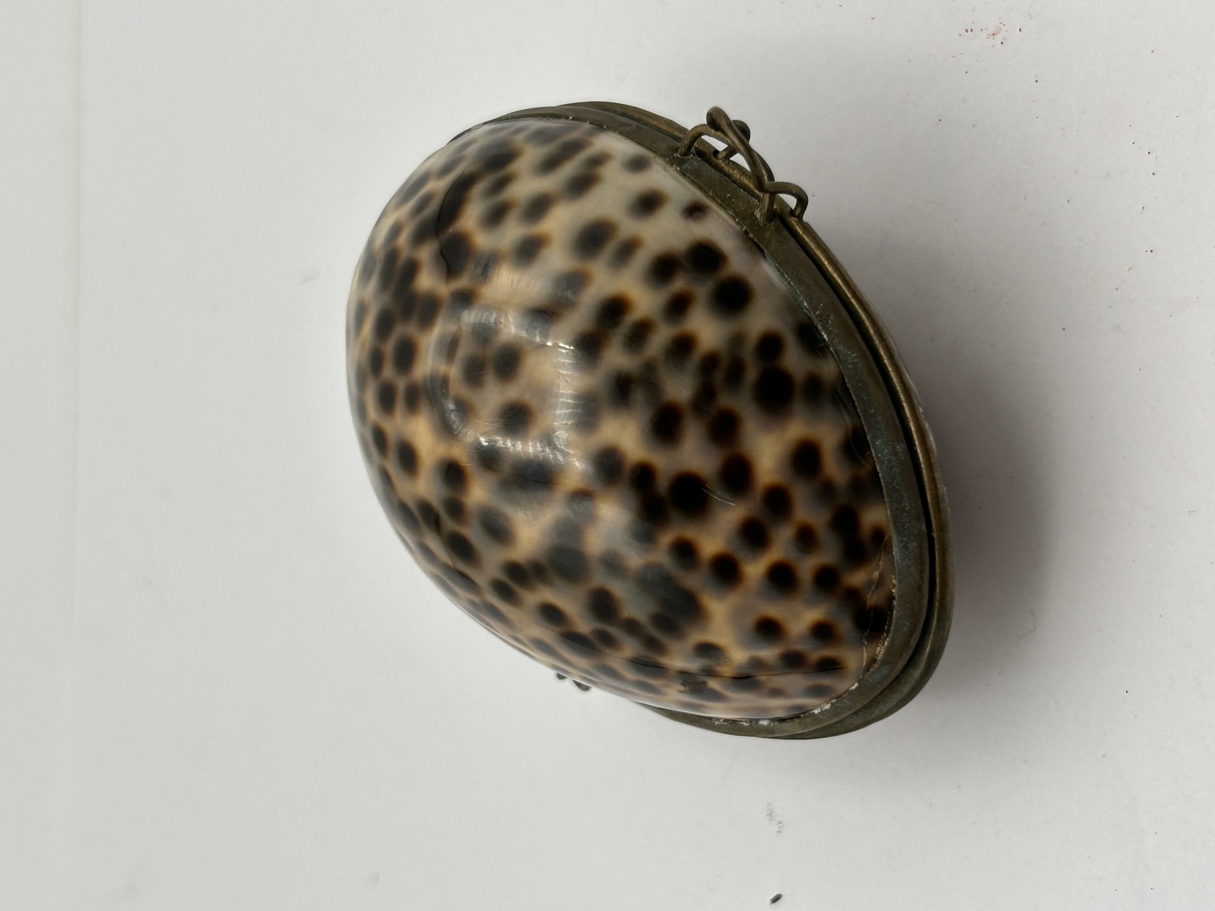 A vintage Tiger Cowrie shell hinged trinket box. This small, ovoid-shaped box is constructed from a natural cowrie shell, exhibiting a glossy, cream-to-tan exterior with distinctive dark brown/black spots. The shell is fitted with a brass or bronze-toned metal frame that forms the hinge and closure points. The interior of the shell is naturally iridescent and pearly white. The metal fittings include a simple hinge and small loops on either side, suggesting it may have once had a clasp or chain. No visible text or manufacturer’s markings are present.