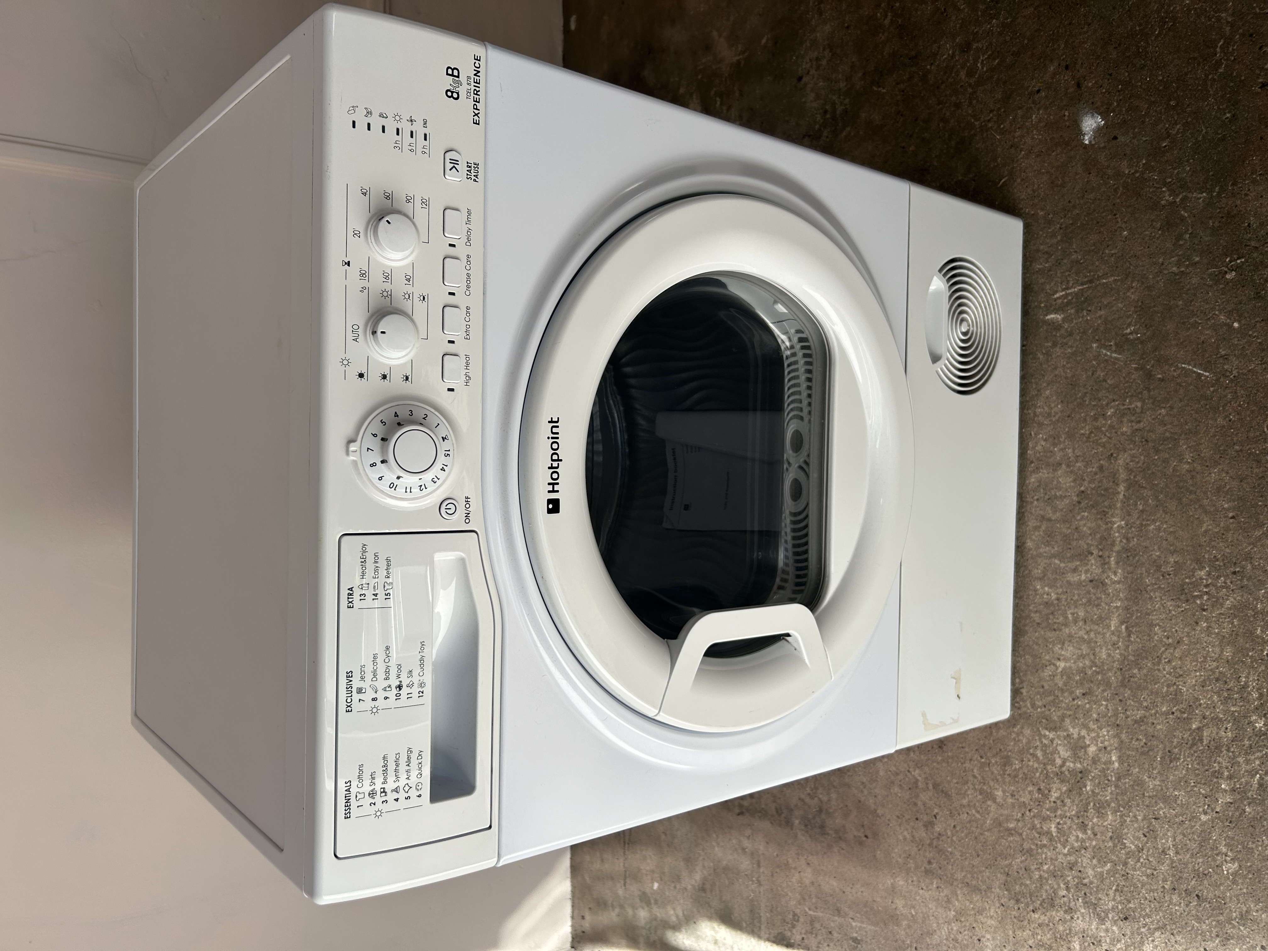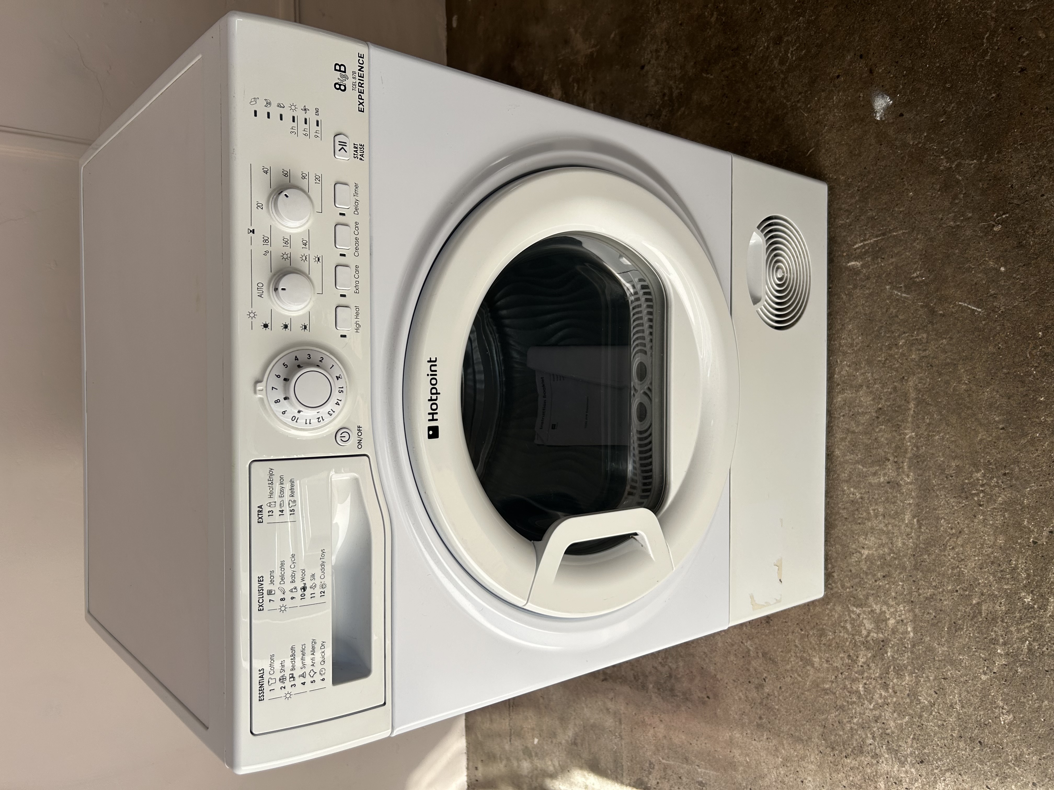 A Hotpoint 8kg Heat Pump Condenser Tumble Dryer. This modern white front-loading electric appliance features a rotary program selection dial (numbered 1-14) with categories including ‘ESSENTIALS,’ ‘EXCLUSIVES,’ and ‘EXTRA,’ offering programs such as ‘Cottons,’ ‘Synthetics,’ ‘Jeans,’ ‘Baby Cycle,’ and ‘Refresh.’ Additional controls include ‘ON/OFF,’ ‘High Heat,’ ‘Extra Care,’ ‘Crease Care,’ and ‘Delay Timer’ buttons, alongside ‘AUTO’ and timed drying options (e.g., ‘180”, ‘140”). The ‘8 & 8 EXPERIENCE’ branding is visible on the right side of the control panel. An instruction manual is present inside the transparent door.