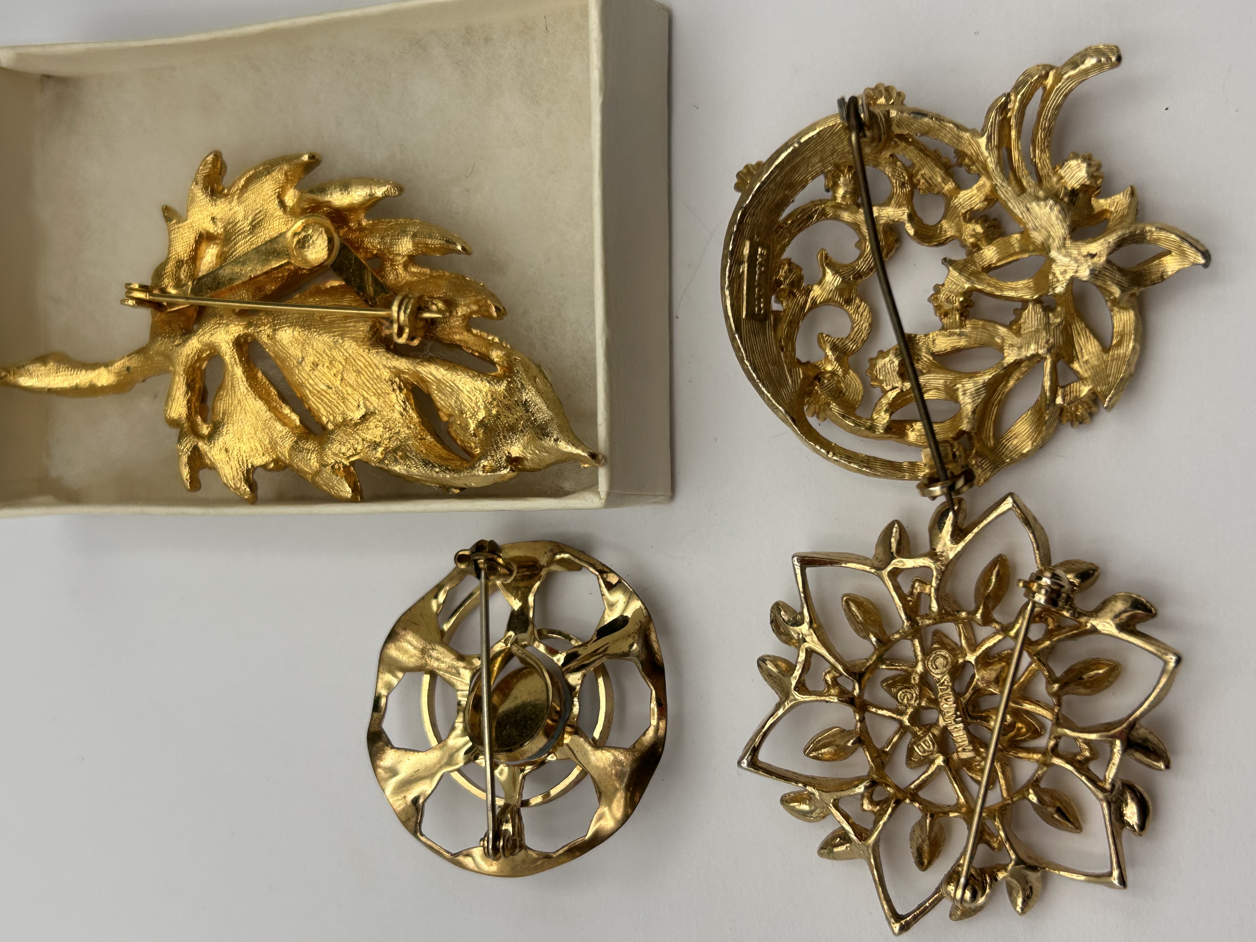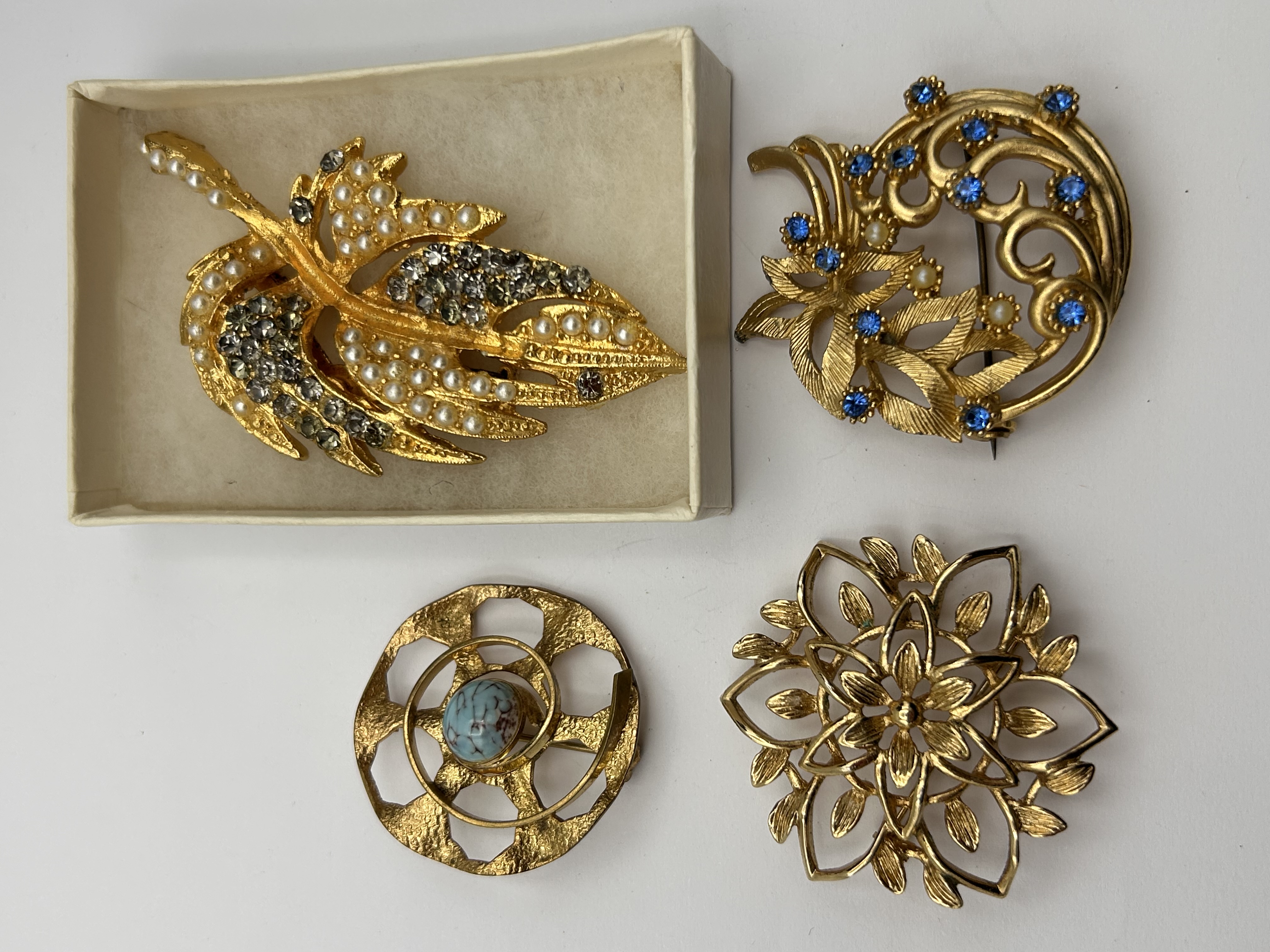 A group of four vintage gold-toned metal brooches, likely costume jewelry. The collection includes a large foliate brooch, possibly representing a leaf or branch, embellished with numerous small faux pearls and clear rhinestones. To its left, a circular openwork brooch features a central faux turquoise cabochon. The bottom left brooch presents a stylized floral or starburst design in openwork, with “MONET” clearly visible as a maker’s mark on its reverse. Finally, the bottom right brooch displays an intricate foliate and scrollwork design accented with small blue rhinestones.
