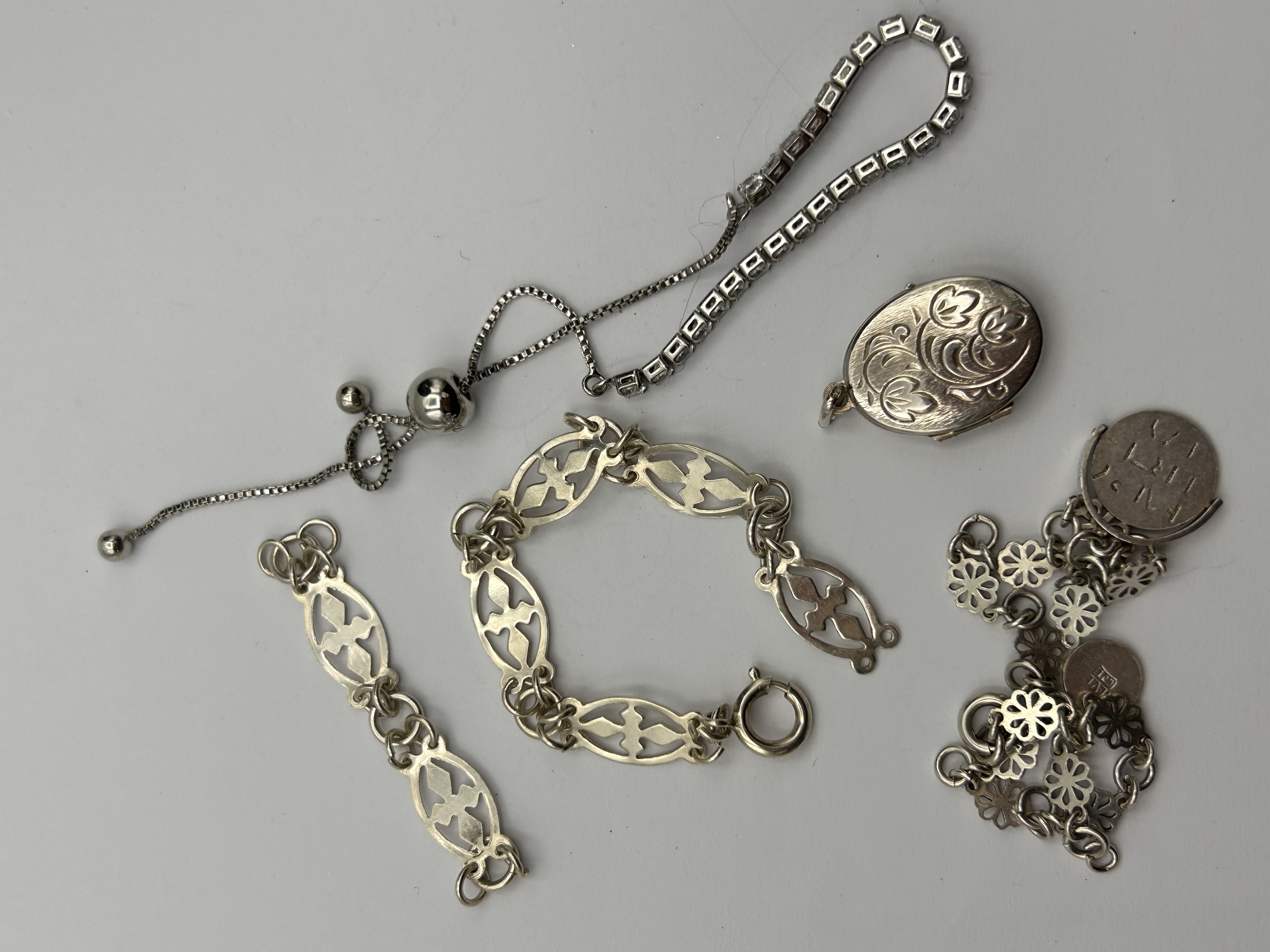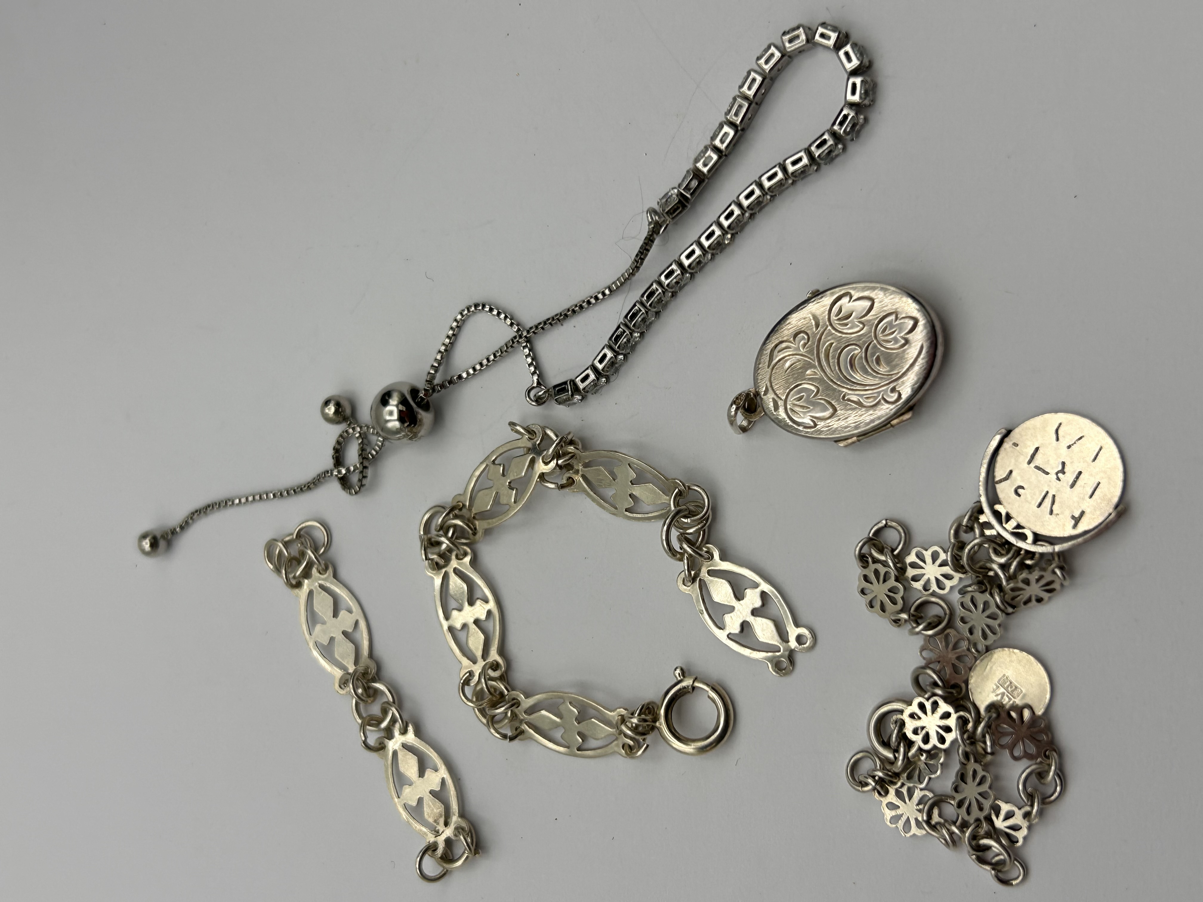A collection of five silver-toned jewelry pieces. Comprising two openwork bracelets with elongated oval links featuring stylized foliate designs, one secured with a spring ring clasp; a contemporary bolo-style bracelet with a box chain and adjustable spherical slider; a flexible tennis-style bracelet set with numerous small, rectangular faceted stones; and a charm bracelet adorned with small floral links, a hexagonal charm inscribed “TO BE LOVED,” and a larger round charm engraved with the Hebrew phrase “מזל טוב” (Mazel Tov). Also present is a small, oval locket or pendant showcasing intricate floral engraving. A “925” hallmark, indicating sterling silver, is visible on one of the charms.