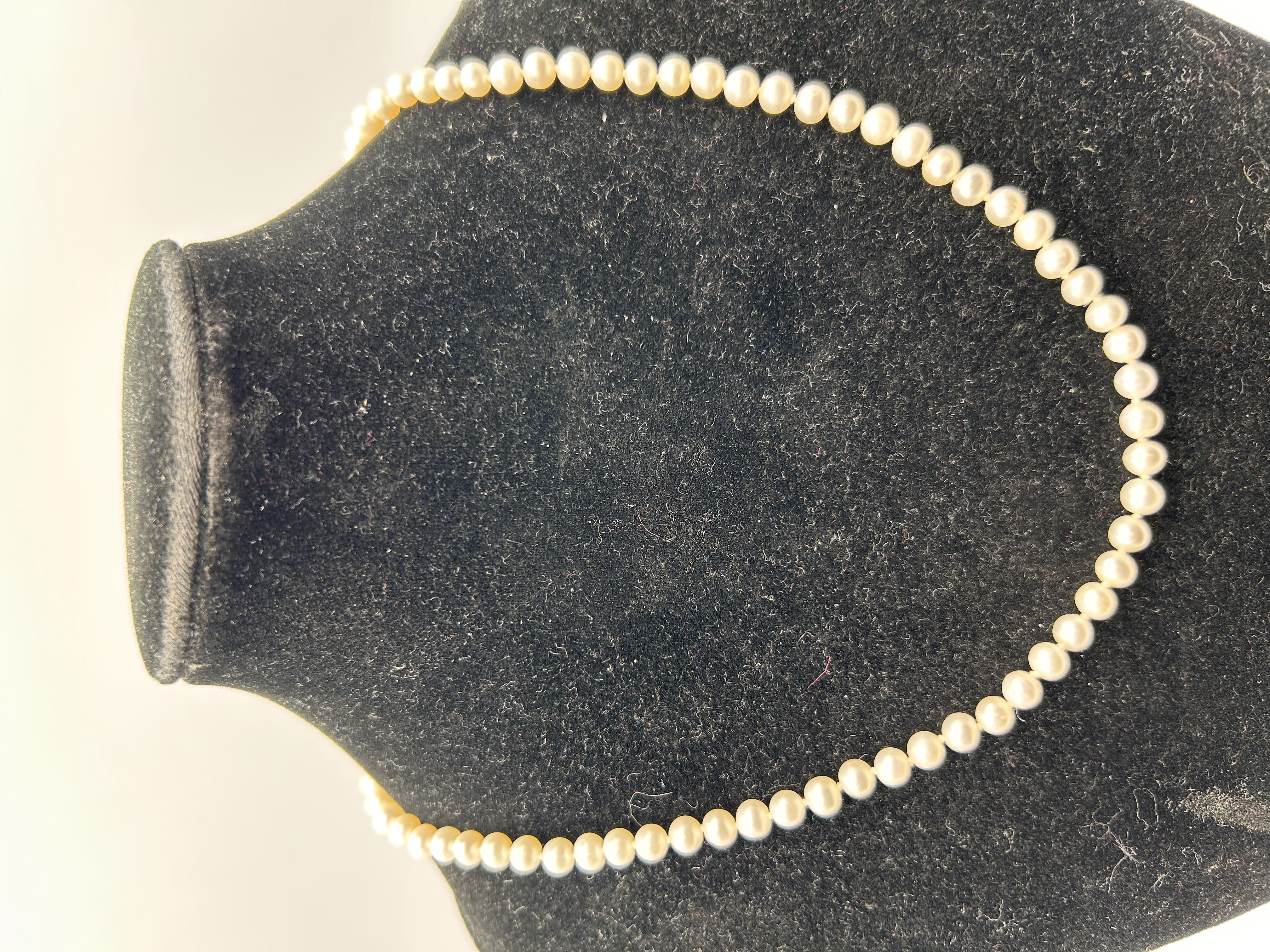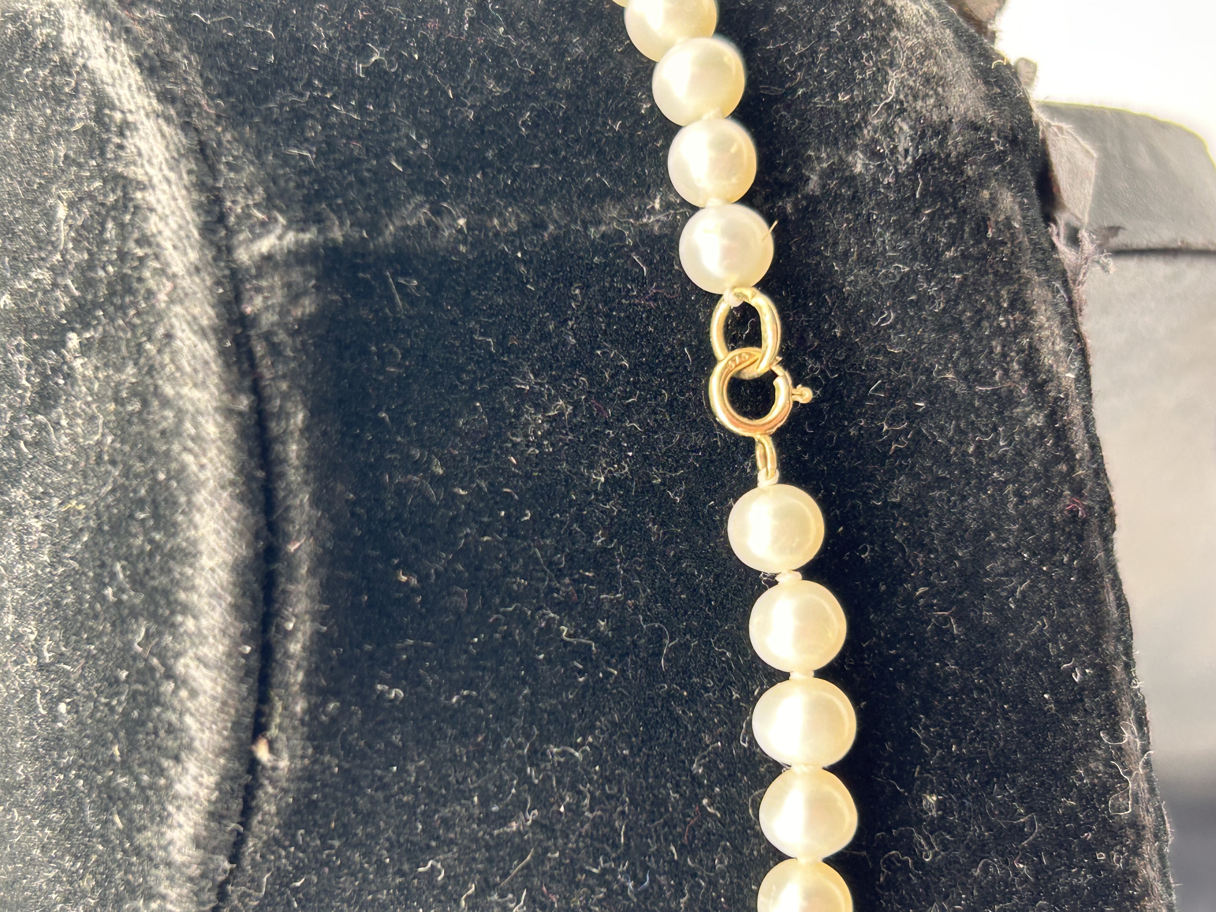 A single-strand faux pearl necklace, composed of uniform, cream-to-white spherical pearls, individually knotted, displaying good luster. The necklace is fastened with a gold-tone spring ring clasp, which features a small, illegible stamping.