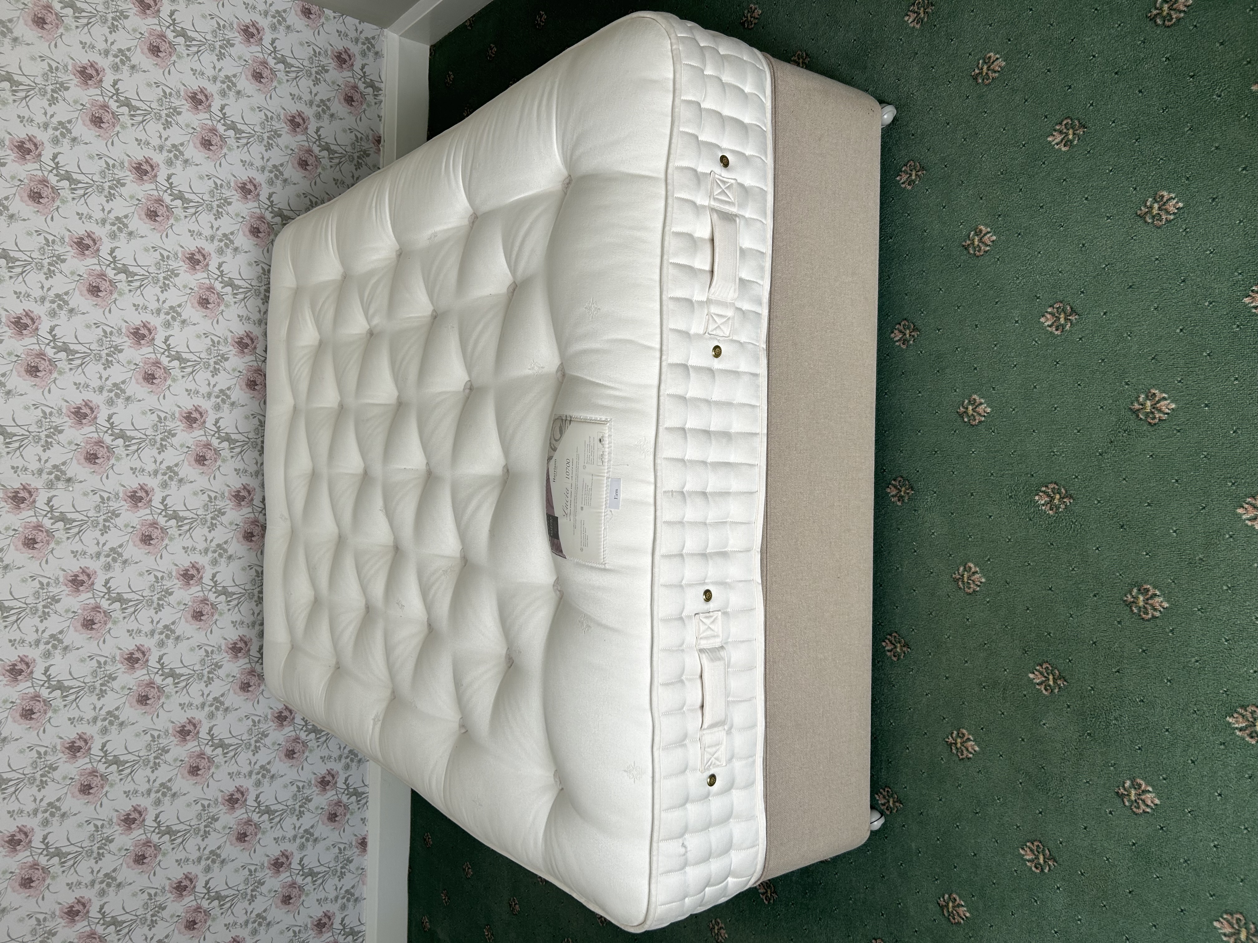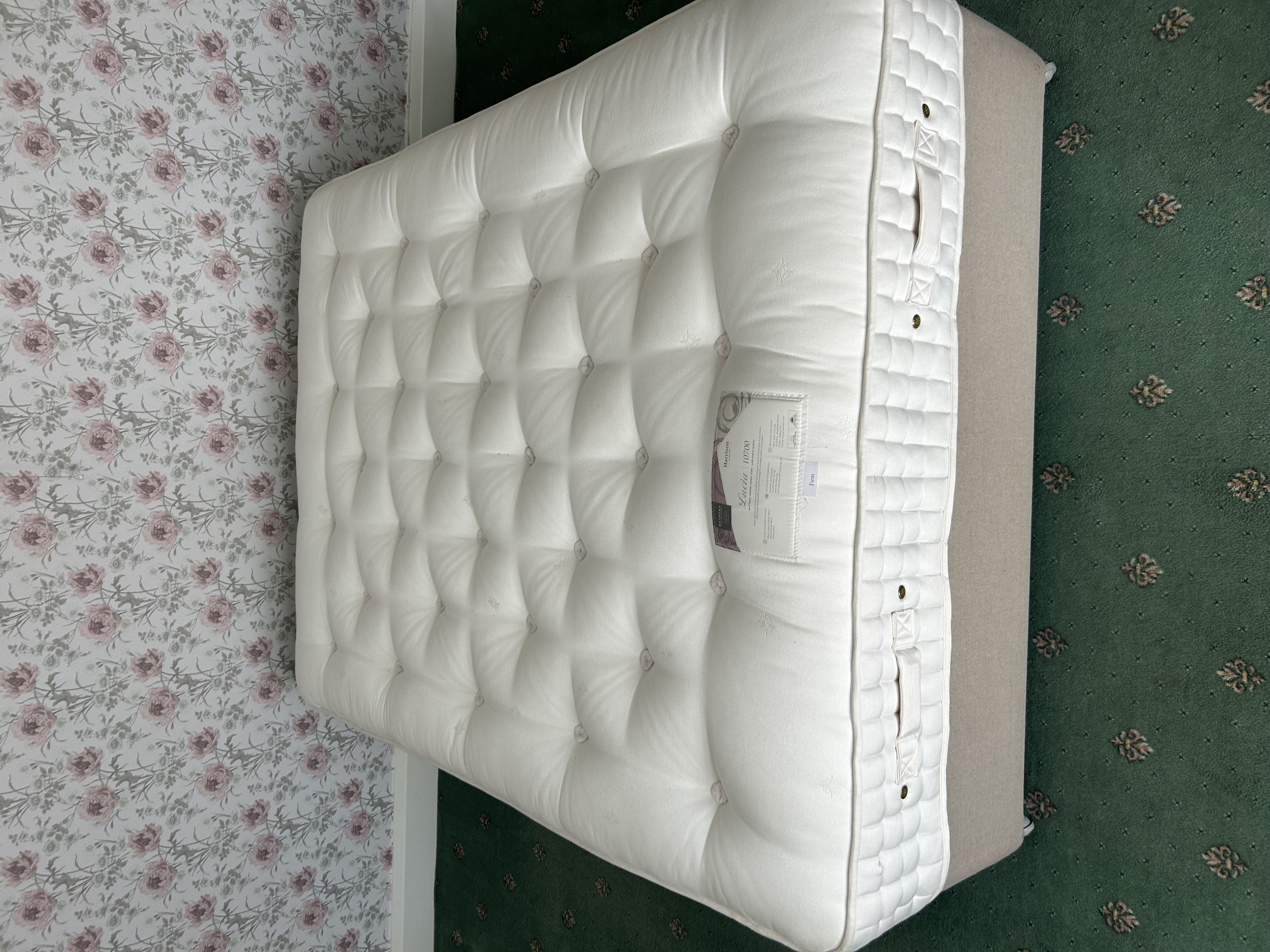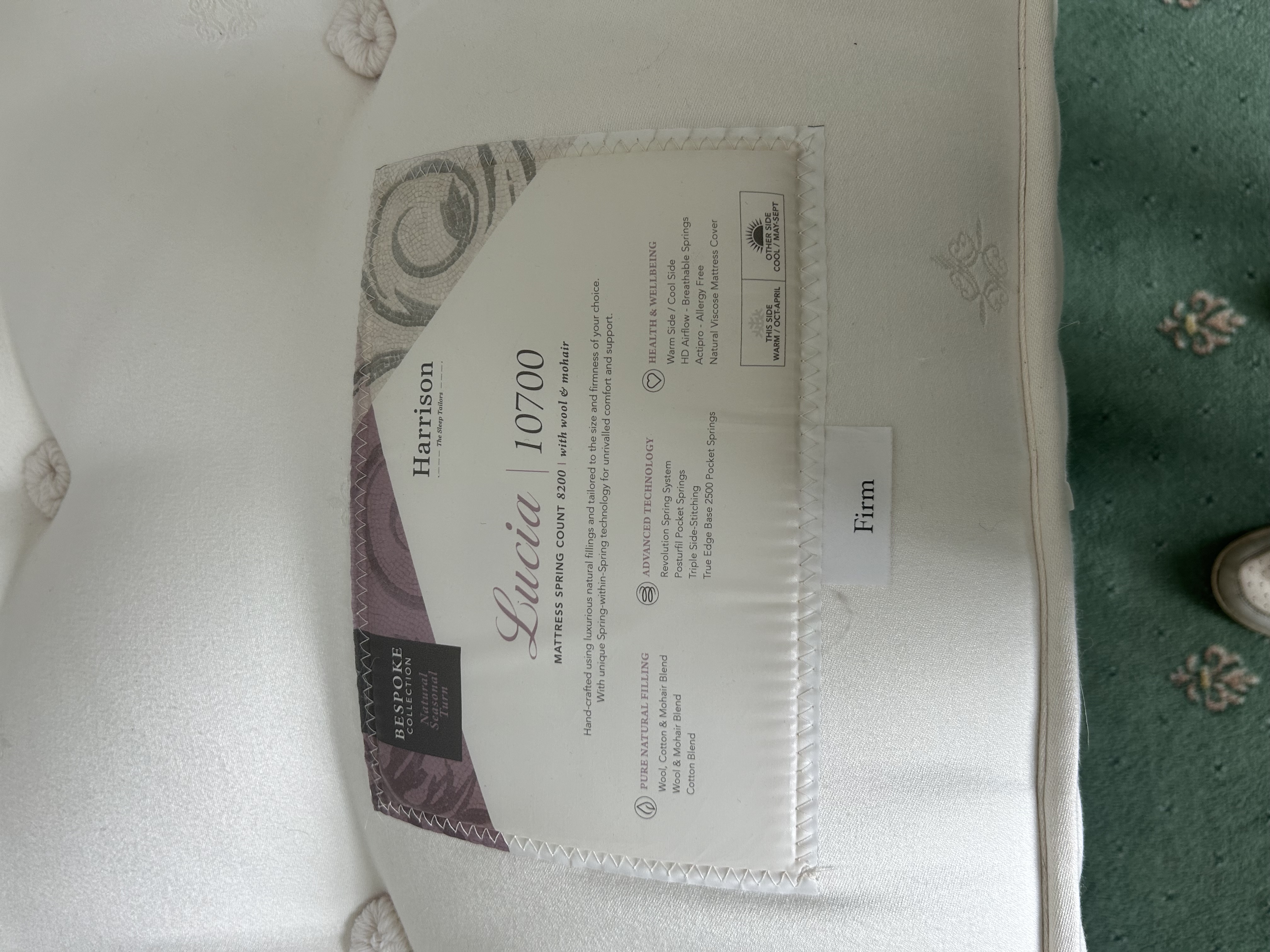 A Harrison Lucia 10700 King Size Mattress and Divan Base. From the ‘Bespoke Collection,’ the mattress features a spring count of 8200 with wool & mohair. It contains pure natural fillings including Mohair & Wool and Cotton blends. Advanced technology includes a Revolution Spring System and Triple Side-Stitching. Designed for health and wellbeing, it offers a designated warm/cool side and allergy-free properties. The firmness is indicated as ‘Firm.’ The mattress is deep-buttoned and upholstered in a white, tufted fabric, complete with visible side handles and metal eyelets. The complementary divan base is covered in a plain, light beige woven fabric.