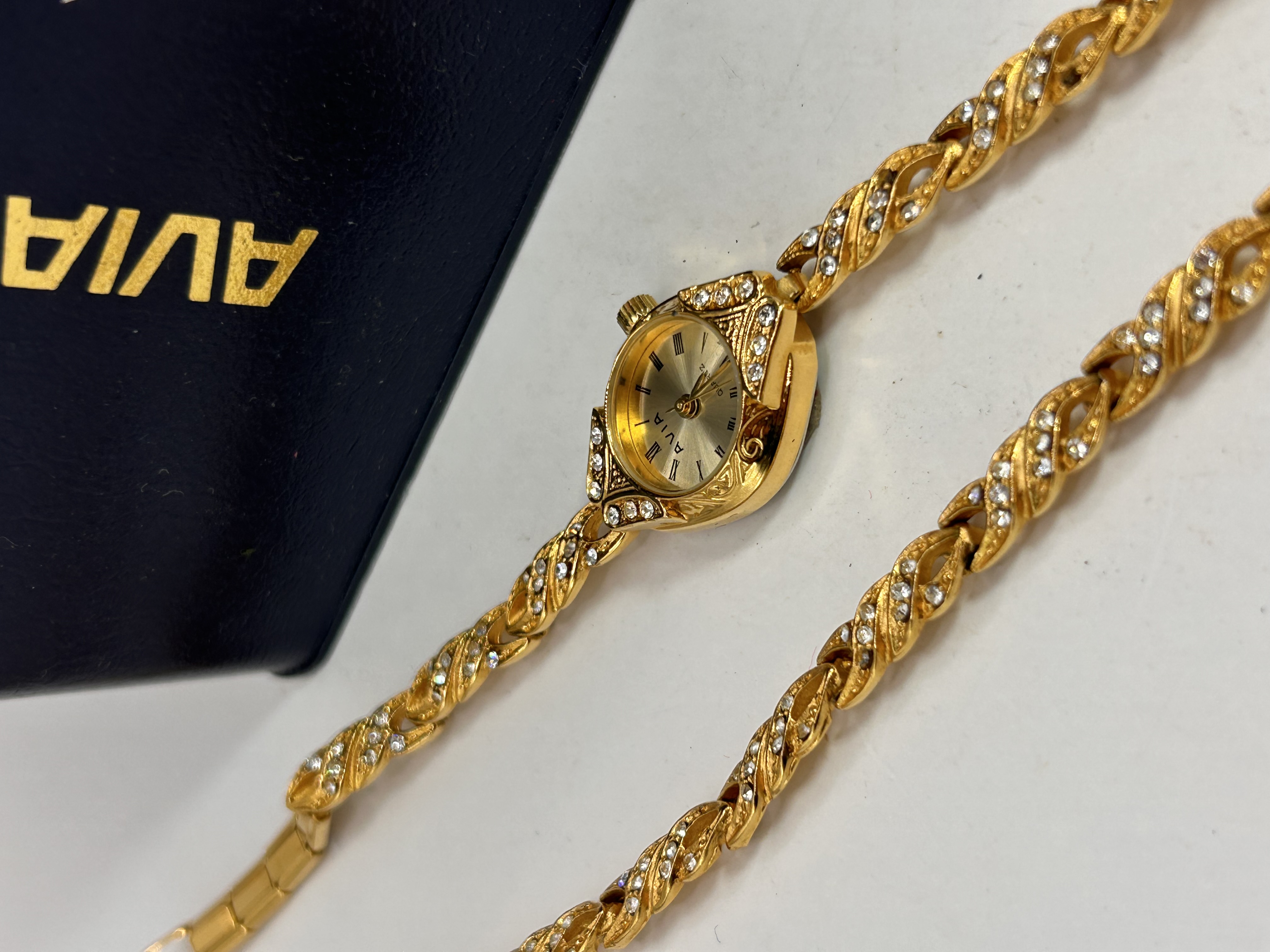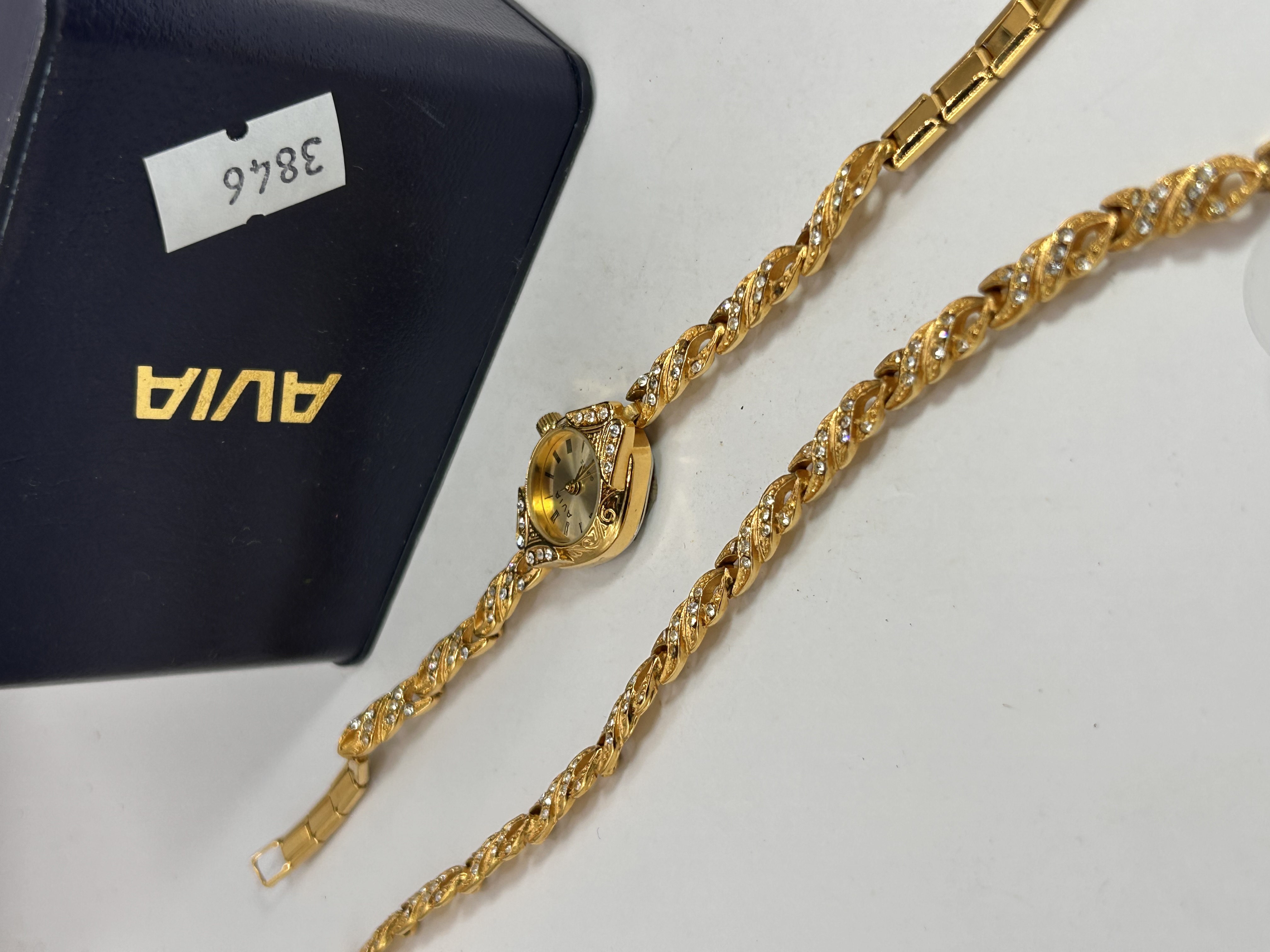 An Avia gold-toned quartz ladies’ wristwatch, featuring an oval-shaped dial marked ‘AVIA,’ ‘QUARTZ,’ and ‘SWISS MOV’T.’ The watch incorporates an integrated braided-link bracelet, with both the bezel and the bracelet extensively set with numerous small, clear, faceted stones. It is accompanied by its original dark blue branded presentation box, which displays ‘AVIA’ in gold lettering on the lid and a white sticker with the number ‘3846.’