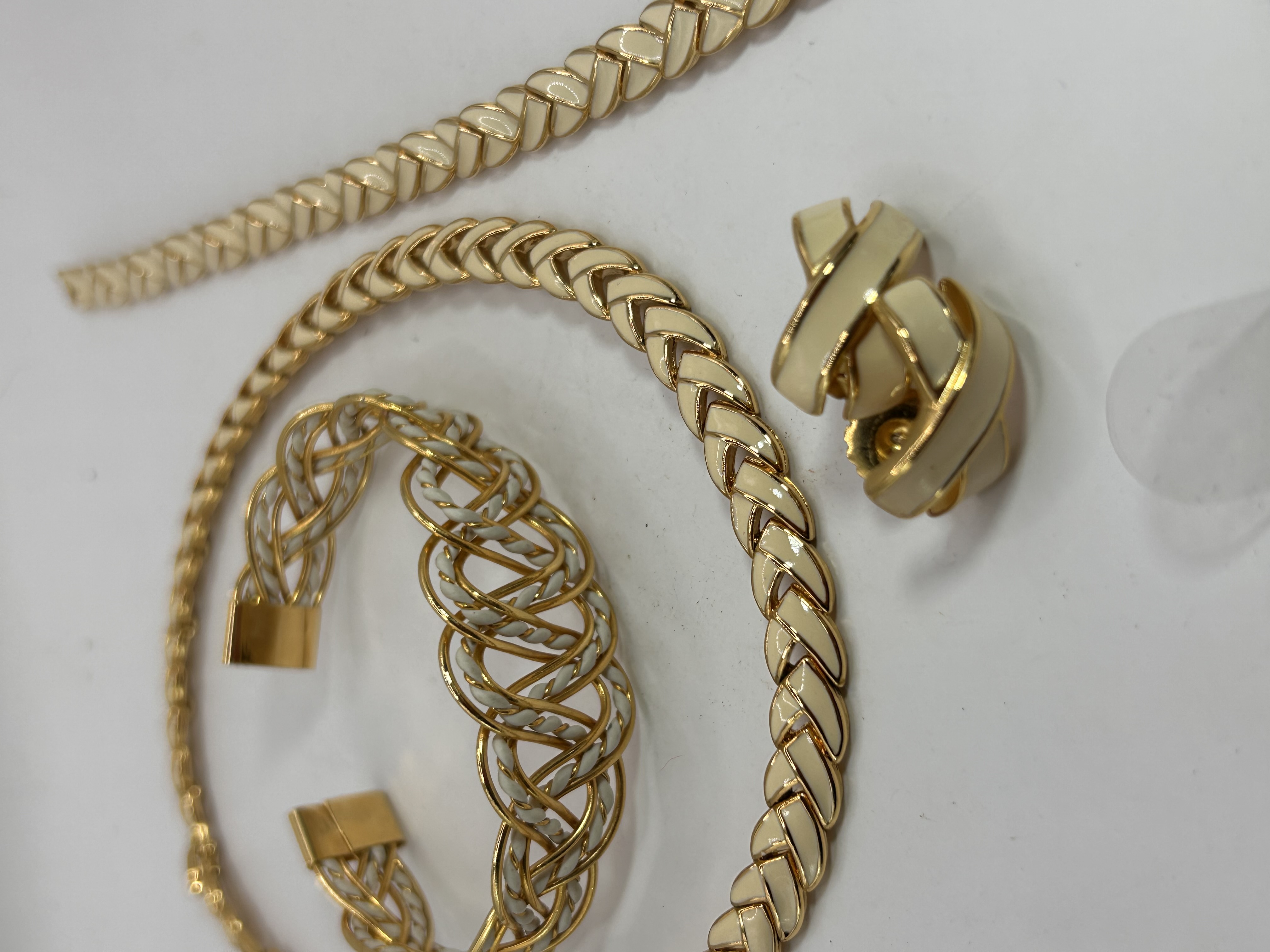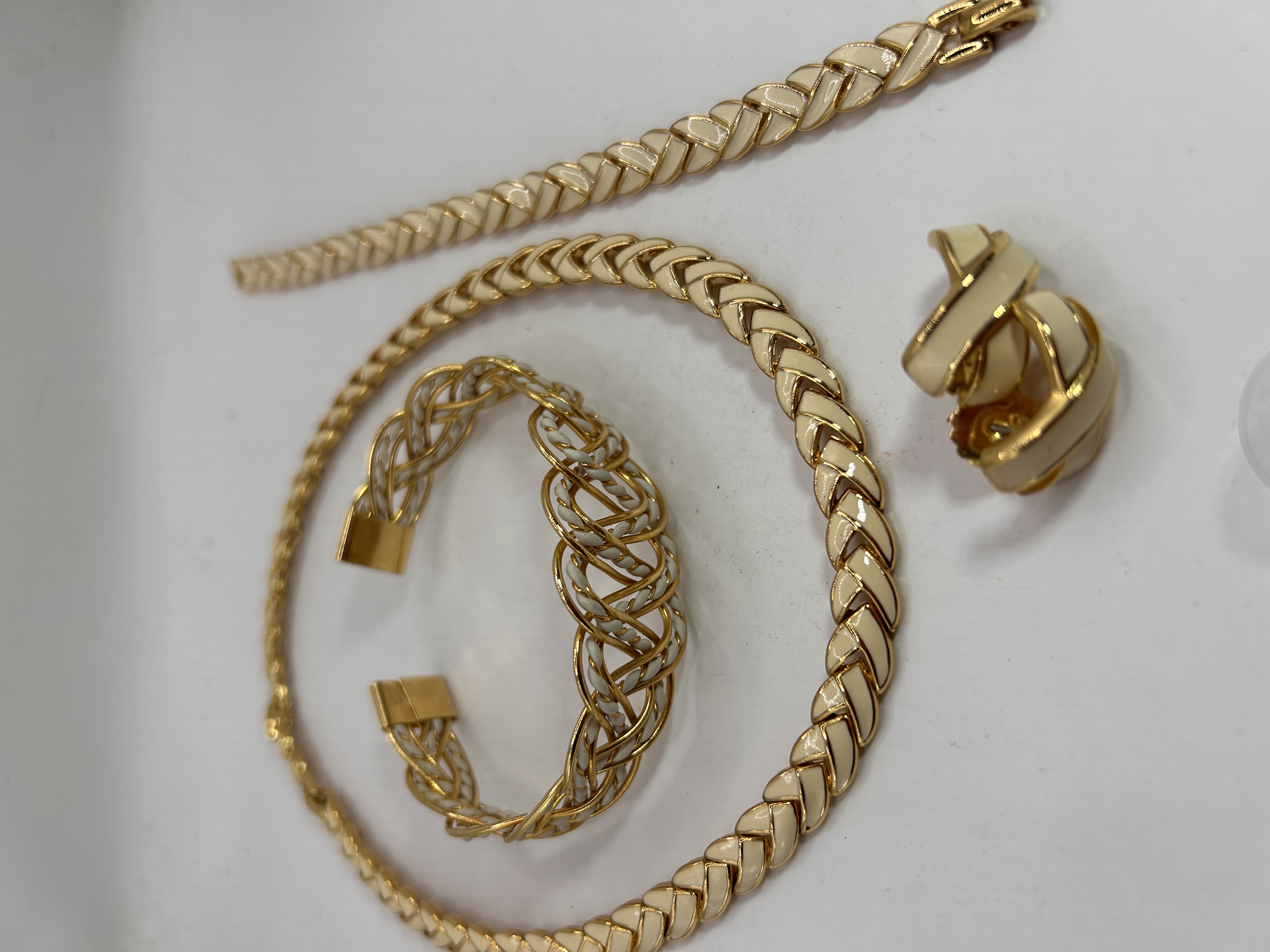 A four-piece jewelry set, comprising a necklace, a wide cuff bracelet, a narrower flat bracelet, and a pair of earrings. Each item is constructed from gold-tone metal, accented with cream or off-white enamel. The necklace and narrower bracelet feature a flat, braided-link design, while the cuff bracelet displays a more intricate, openwork weave. The earrings are a matching crossover ‘X’ design.