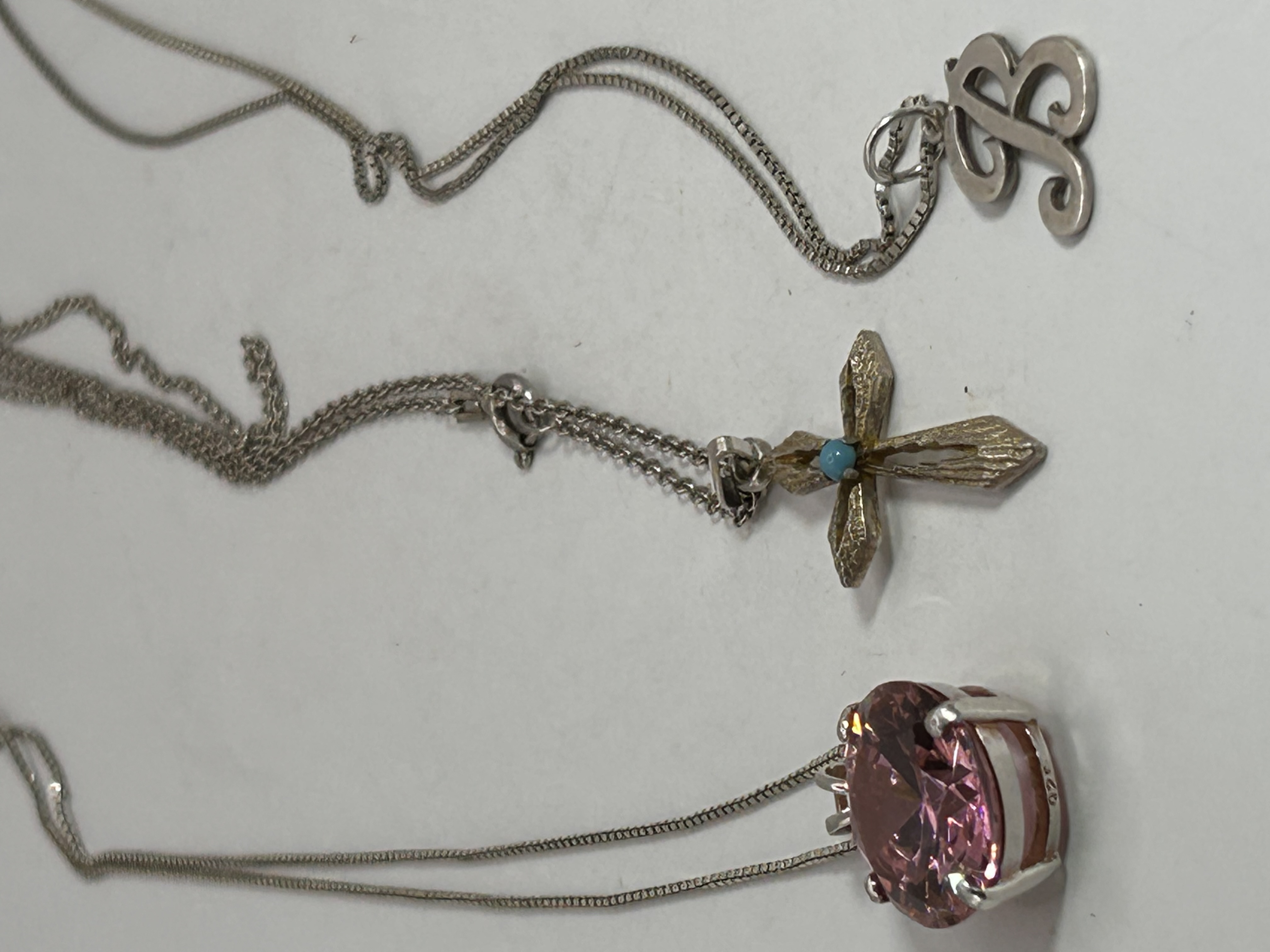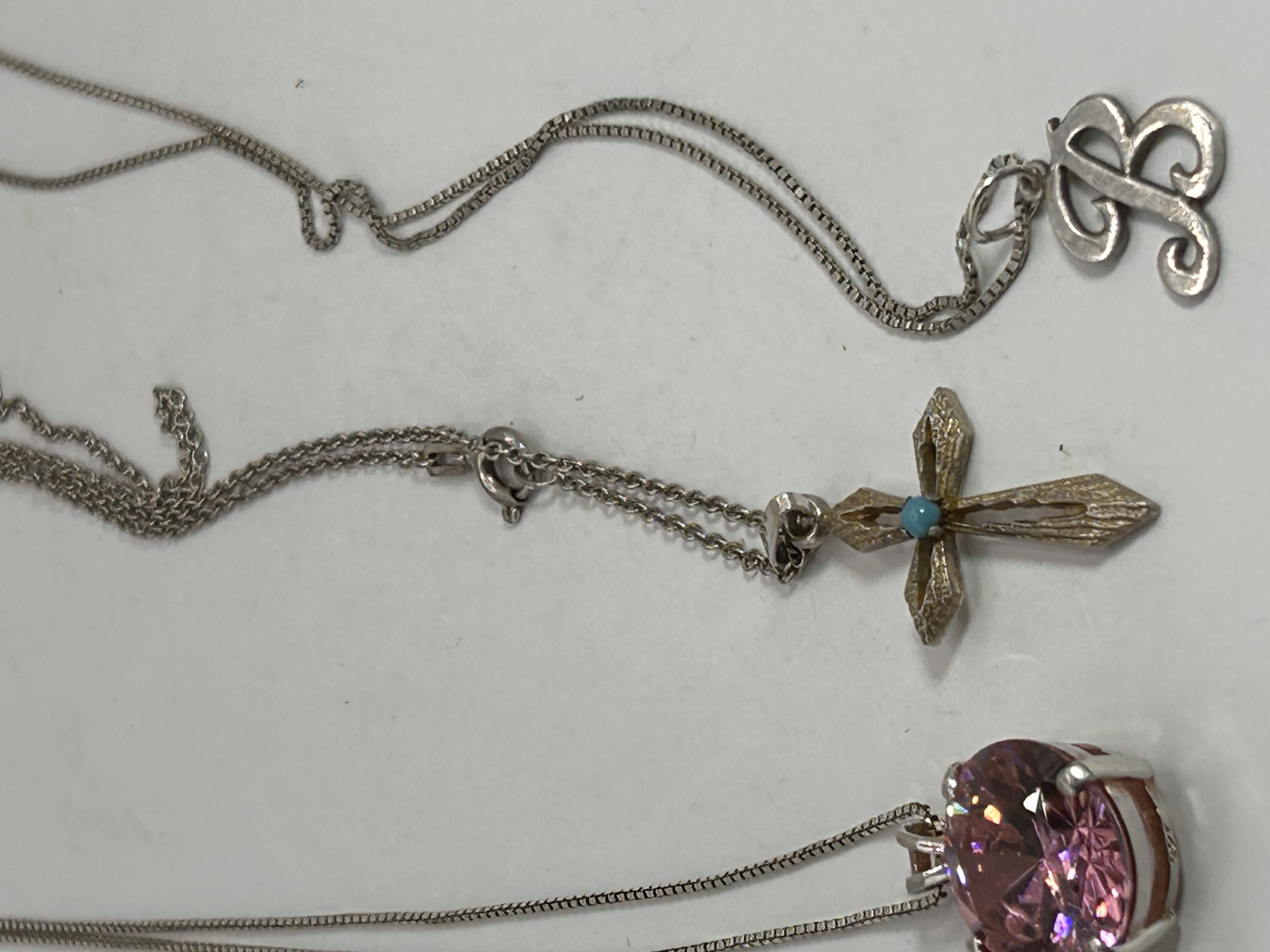 This lot comprises three necklaces. The central necklace features a Bell Trading Company sterling silver cross pendant, which presents with a gold-tone finish and a textured surface, set with a small, round, light blue turquoise stone at its center. It is suspended from a silver-tone chain. The leftmost necklace consists of a silver-tone chain with a large, oval, faceted pink or purple simulated gemstone pendant set in a four-prong mount, clearly marked ‘925’ on its base. The rightmost necklace showcases a silver-tone chain with a polished script initial ‘B’ pendant.