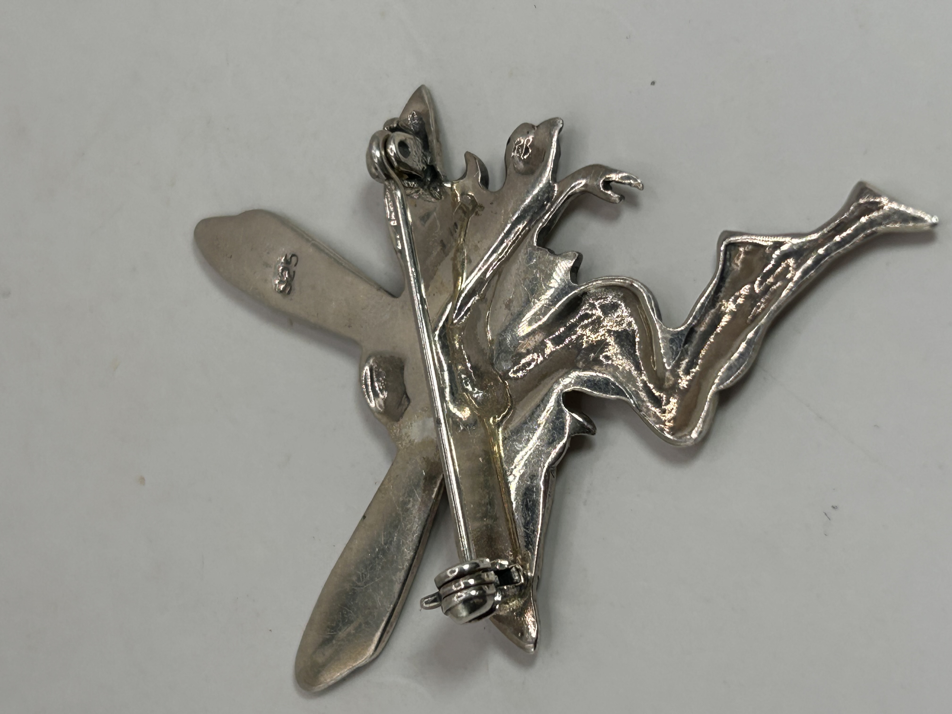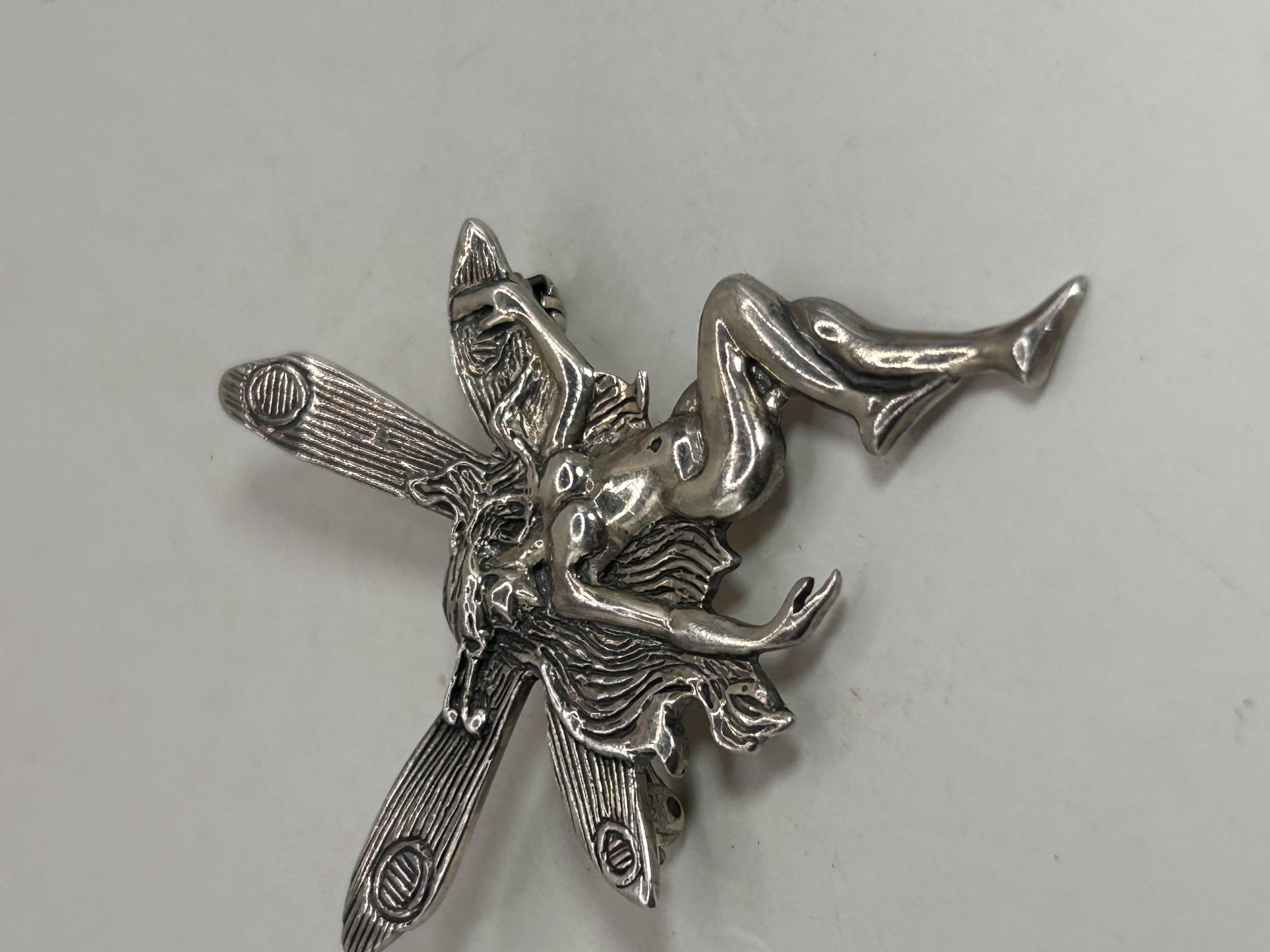 A figural brooch, crafted from sterling silver, depicting a stylized winged female figure, suggestive of a fairy or sylph, rendered with flowing lines reminiscent of an Art Nouveau aesthetic. The reverse side features a functional pin-back closure with a safety clasp and is marked “925”, indicating its material composition.