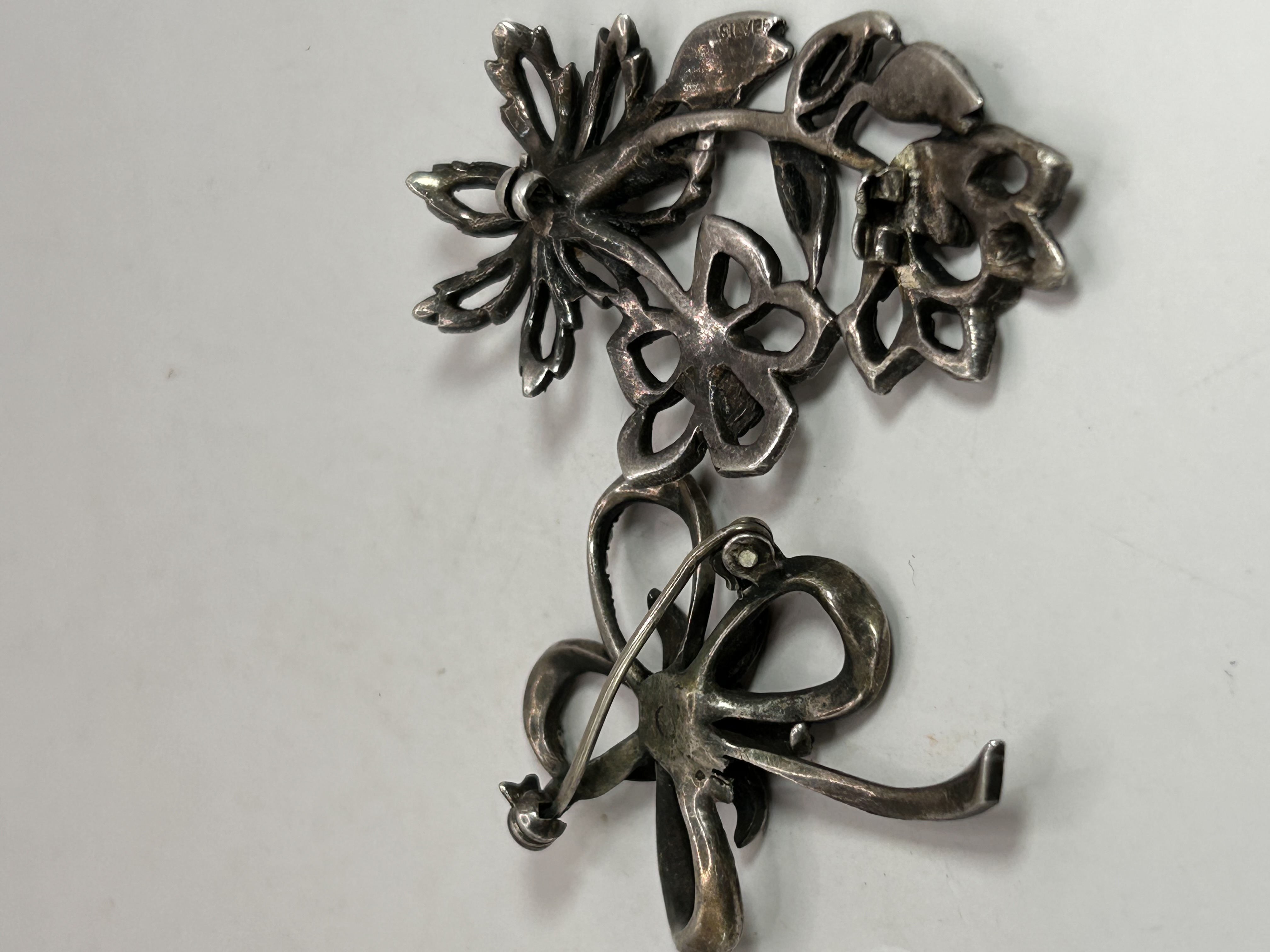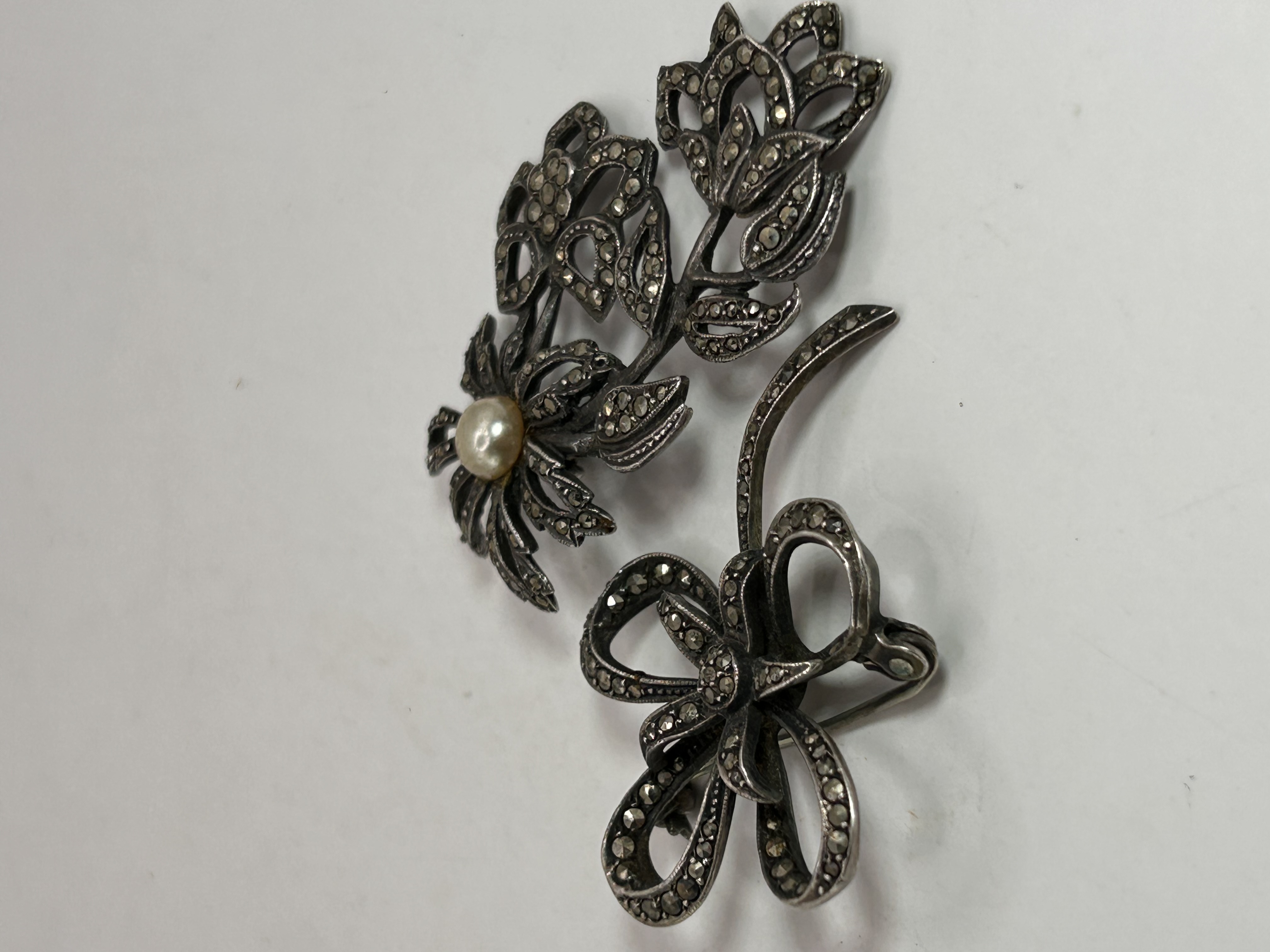 A pair of vintage sterling silver and marcasite brooches, dating to the early to mid-20th century. Comprising one designed as a bow and the other as a floral spray. Both pieces are adorned with numerous small, faceted marcasite stones; the floral brooch additionally features a central cream-colored pearl. A faint ‘STERLING’ mark is visible on the reverse of the floral brooch. Their overall style, with naturalistic motifs, is consistent with the Art Deco period or earlier.