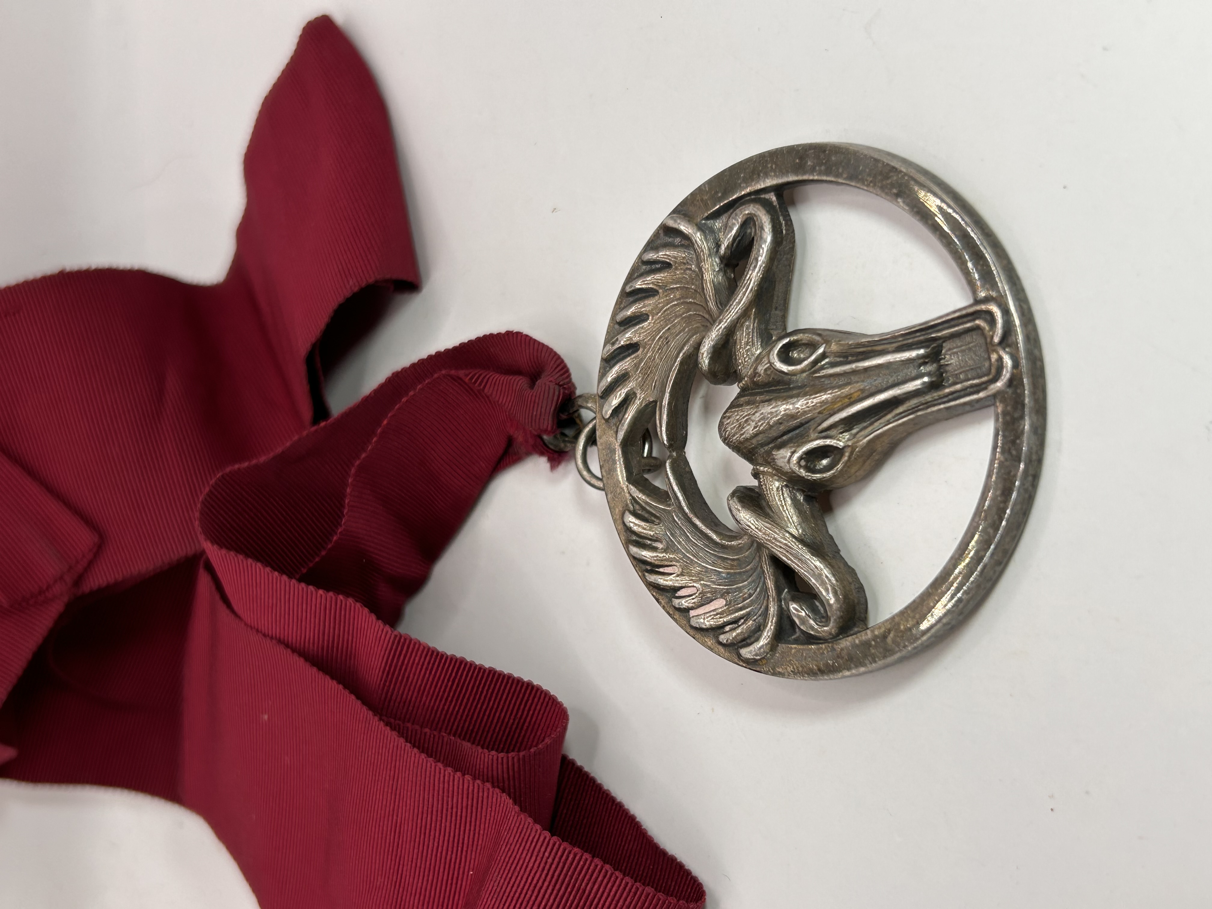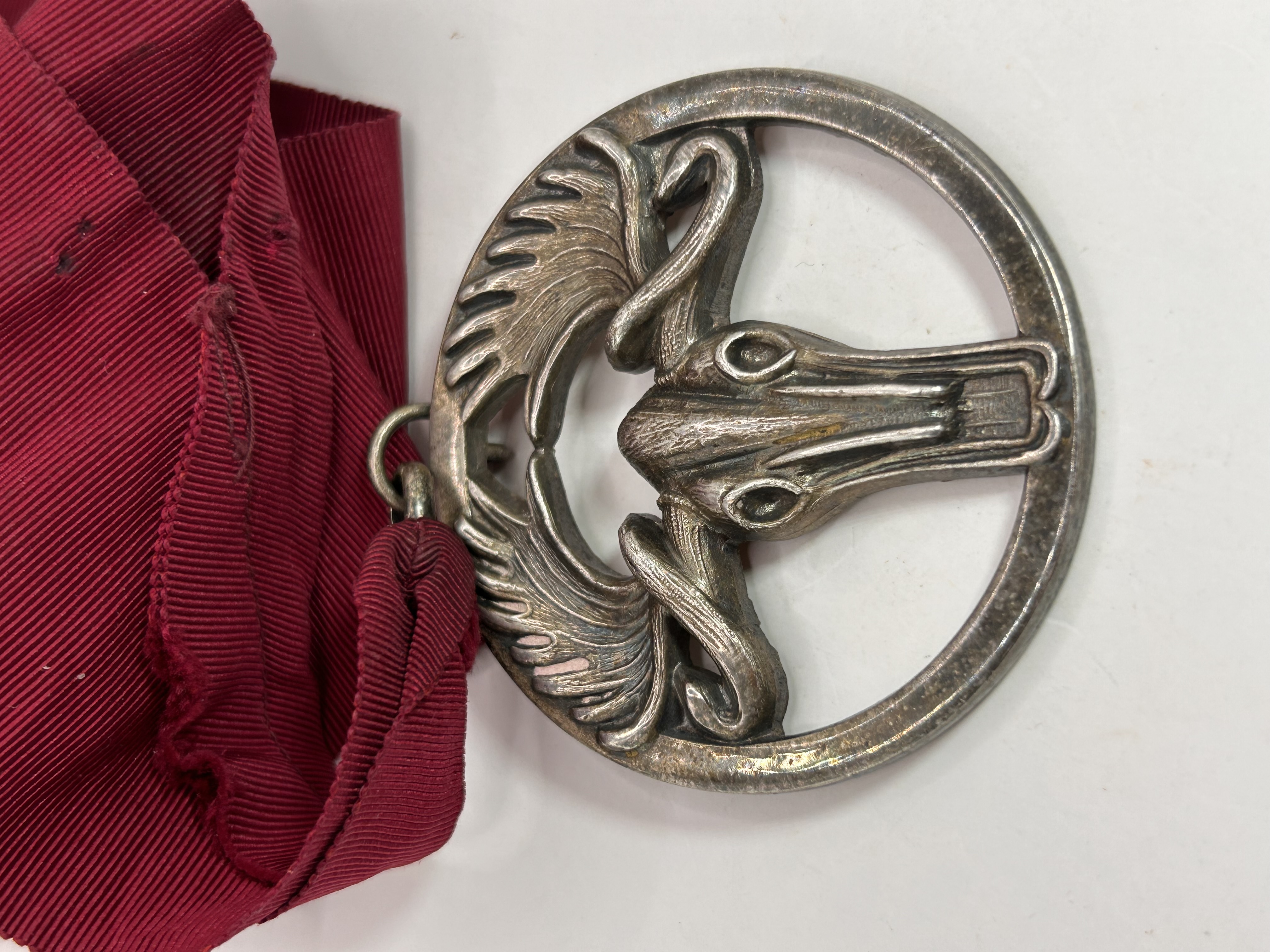 A vintage Masonic regalia pendant, identified through web intelligence as typically associated with a ‘Masonic Sash with Massive Pendant’. This circular medal or medallion is crafted from a silver-toned metal, featuring a stylized openwork design of an animal skull with broad, possibly leafy antlers or horns, all enclosed within a plain circular border. It is suspended from a wide, deep red fabric ribbon via a simple ring. No specific text or maker’s marks are visible.