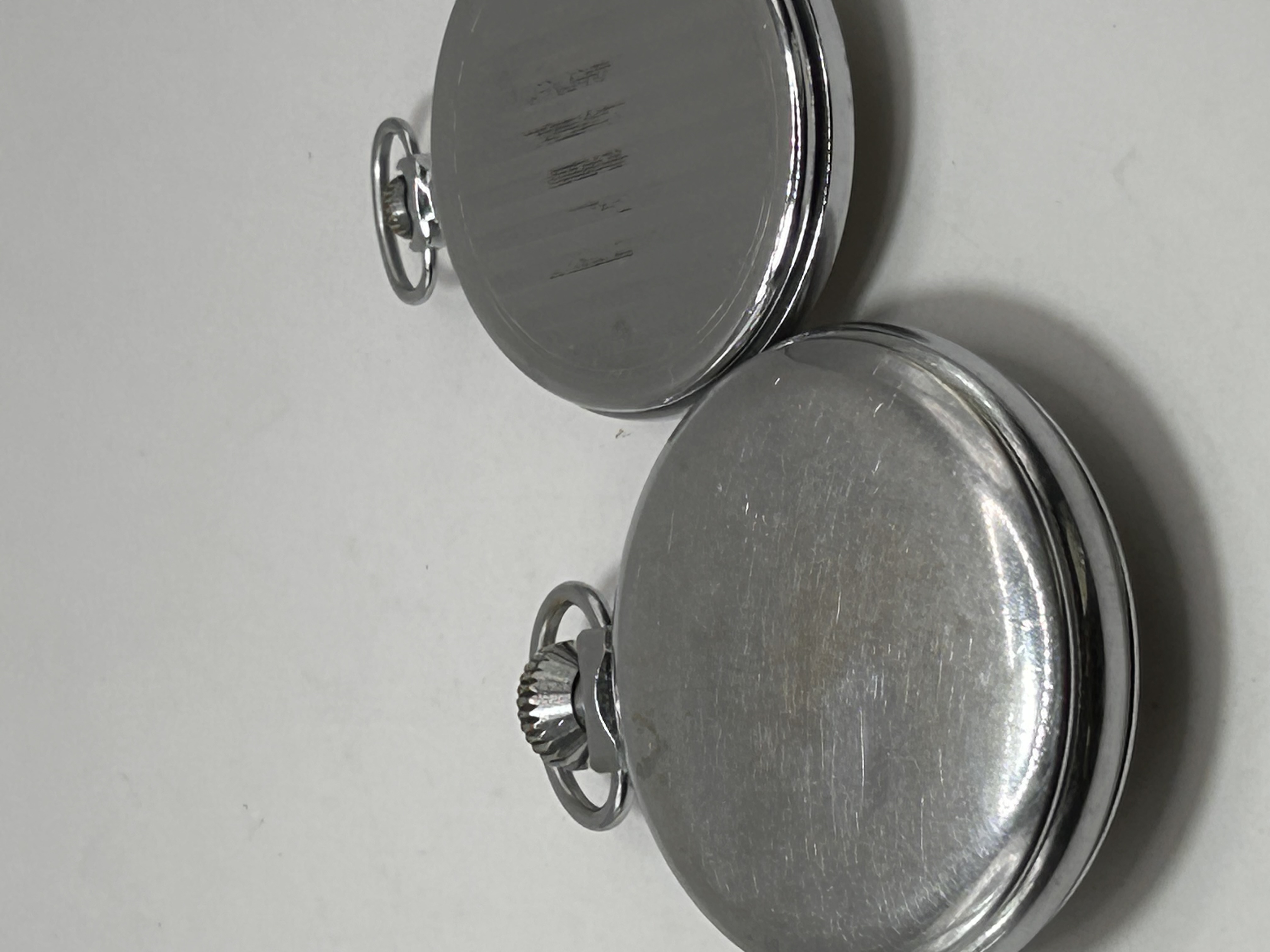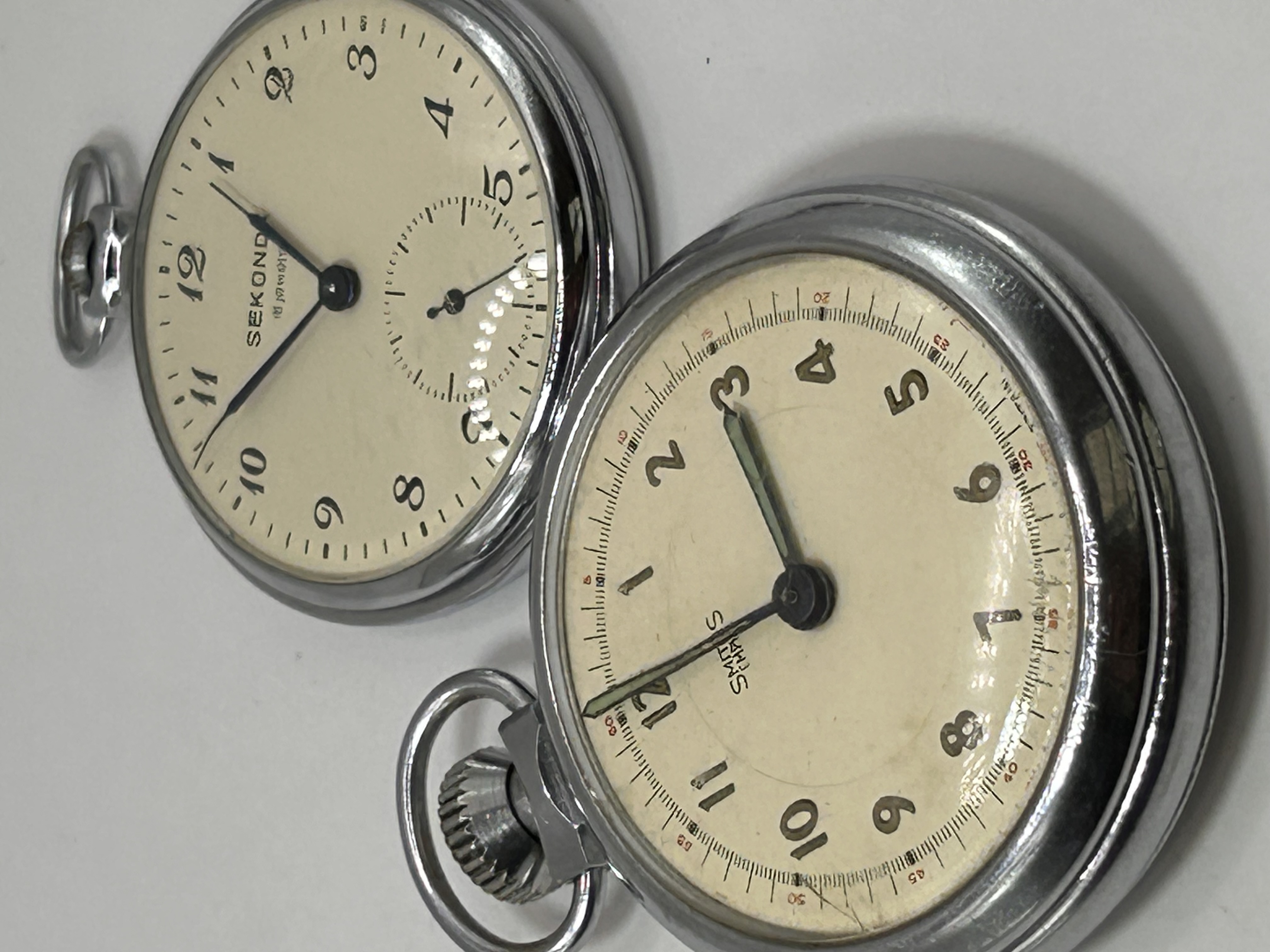 A pair of vintage pocket watches, each with a silver-tone metal case and a cream-colored dial. The first watch features a dial marked “SMITHS EMPIRE” with “MADE IN GT. BRITAIN” below, displaying black Arabic numerals, a full minute track, and a recessed sub-dial for seconds at 6 o’clock. It is fitted with black hour and minute hands and a green seconds hand. The second watch, a Soviet Sekonda, is marked “SEKONDA” with the Cyrillic text “СЕКУНДА” below, also featuring black Arabic numerals, a minute track, and a recessed sub-dial for seconds at 6 o’clock, with black hands. Both watches are complete with their crowns and suspension rings.