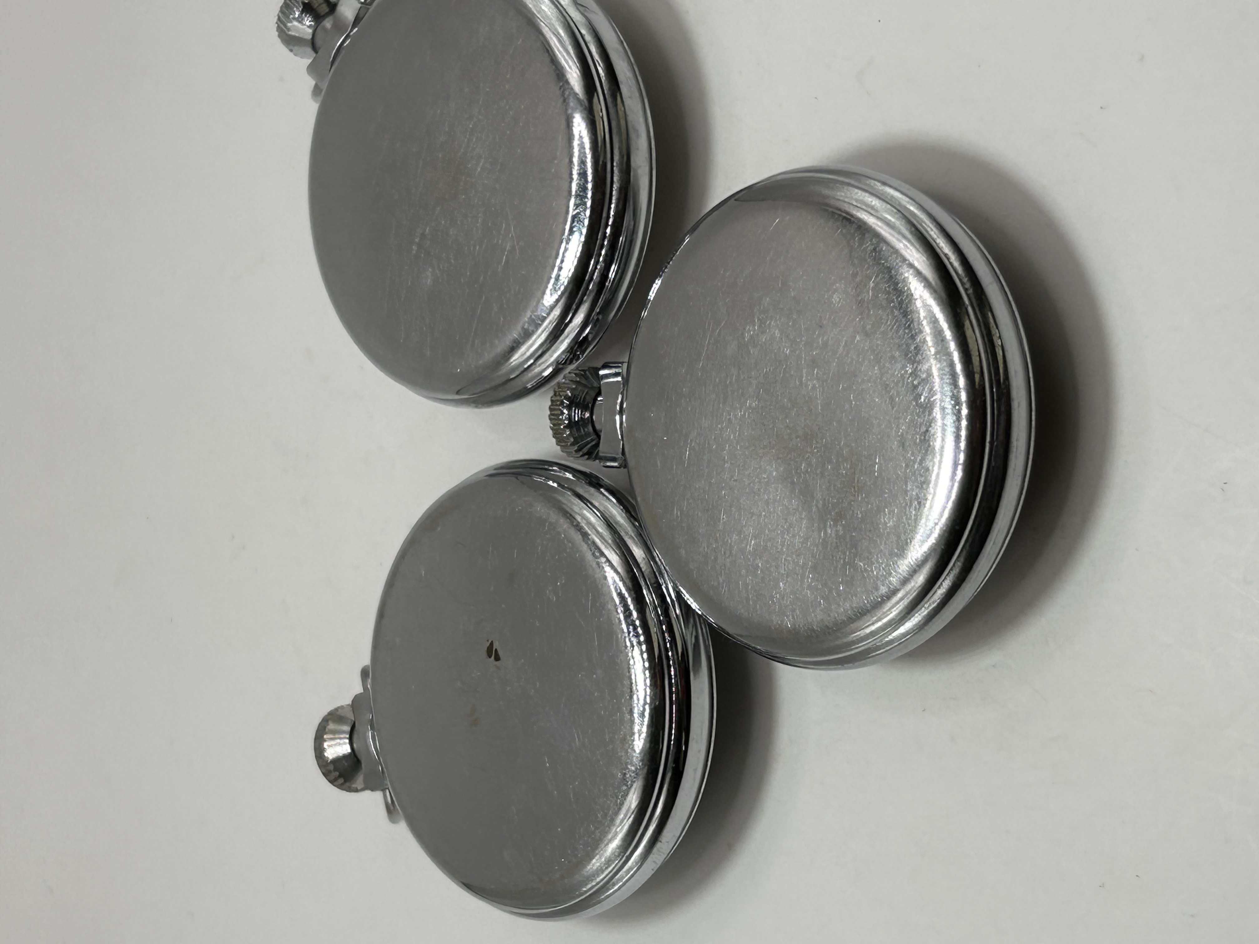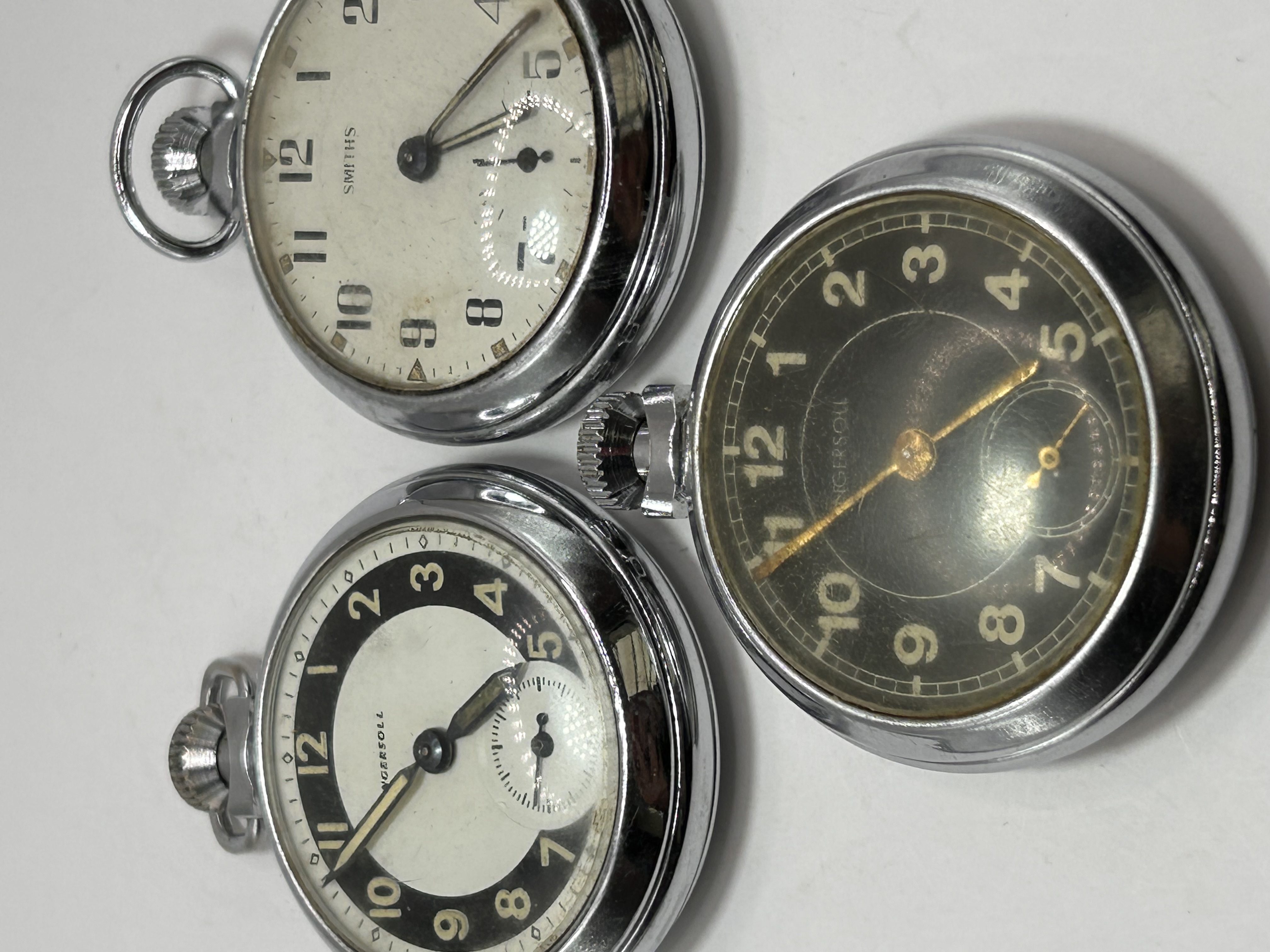 A group of three chrome plate case Ingersoll and Smiths pocket watches, circa 1960s. Each open-face pocket watch is housed in a polished or chrome-plated base metal case with a prominent crown and bail. The first watch, marked ‘INGERSOLL,’ features a two-tone black and white dial with Arabic numerals and a sub-seconds dial. The second watch, marked ‘SMITHS,’ has a cream-colored dial with Arabic numerals, a sub-seconds dial, and a minute track. The third watch, also marked ‘INGERSOLL,’ displays a black dial with luminous-style Arabic numerals and gold-tone hands, also featuring a sub-seconds dial.