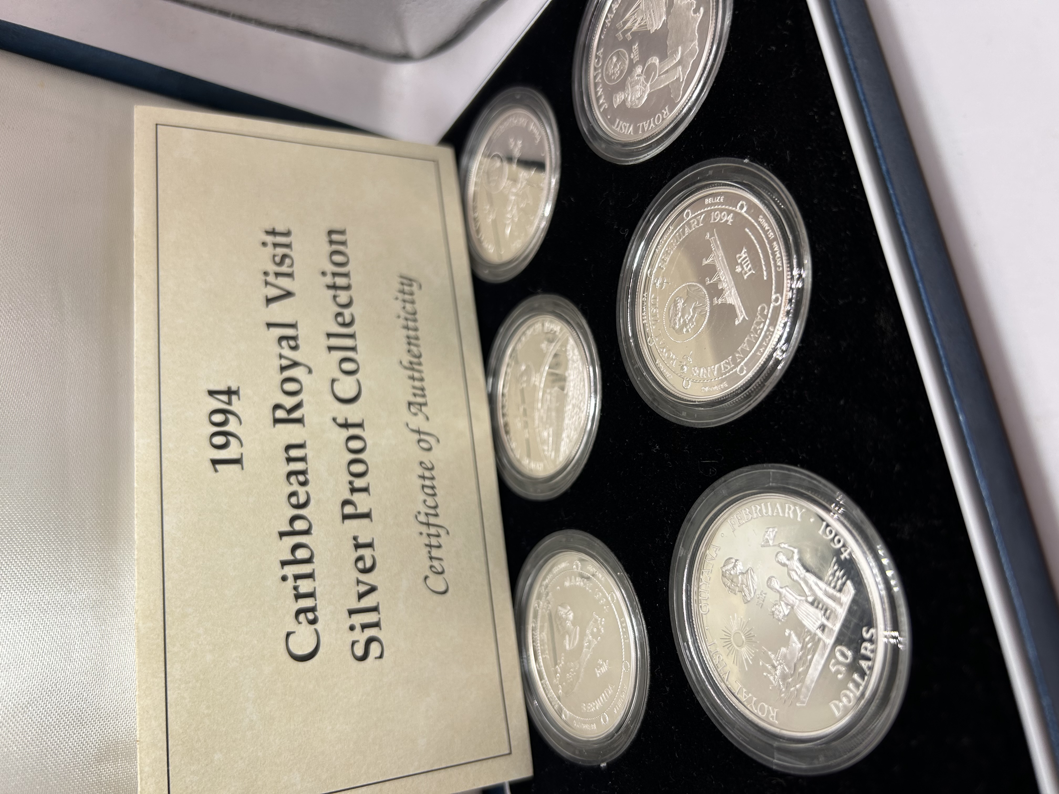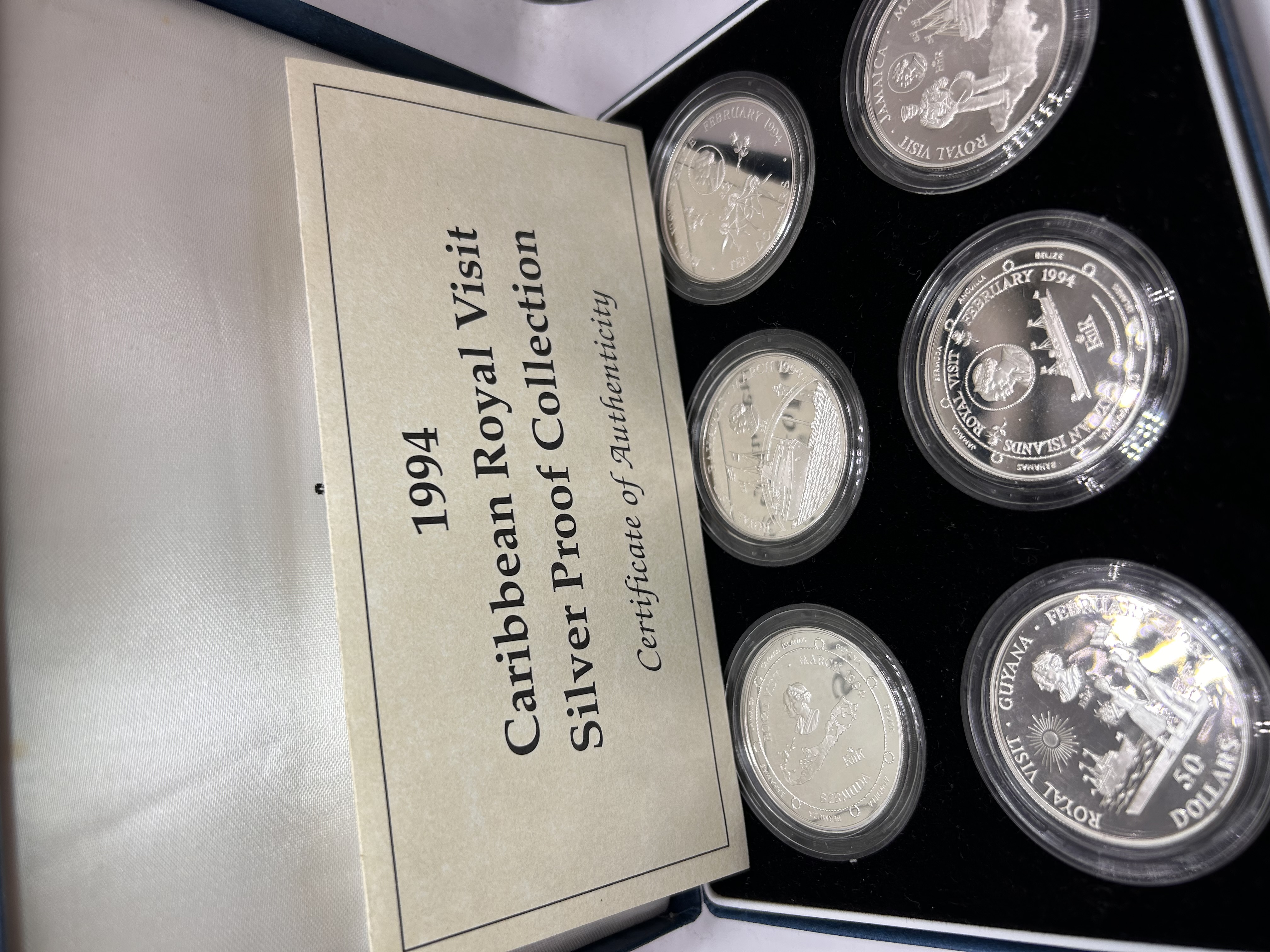 A Royal Mint 1994 Caribbean Royal Visit Silver Proof Collection. This collection comprises six silver proof coins, each weighing approximately 28 grams and individually sealed in a clear plastic capsule. The coins are dated ‘1994’ and feature ‘ROYAL VISIT’ and ’50 DOLLARS’ denominations. Various Caribbean nation names are visible, including ‘GUYANA,’ ‘JAMAICA,’ ‘BELIZE,’ ‘TRINIDAD & TOBAGO,’ and ‘ST. KITTS & NEVIS.’ The central coin also bears ‘SILVER JUBILEE’ and a portrait, likely of Queen Elizabeth II. The designs depict ships, local scenes, and figures. The set is presented in a dark blue presentation box, possibly leatherette, with a white satin-lined lid and a black velvet-like coin insert. It is accompanied by its ‘Certificate of Authenticity’.