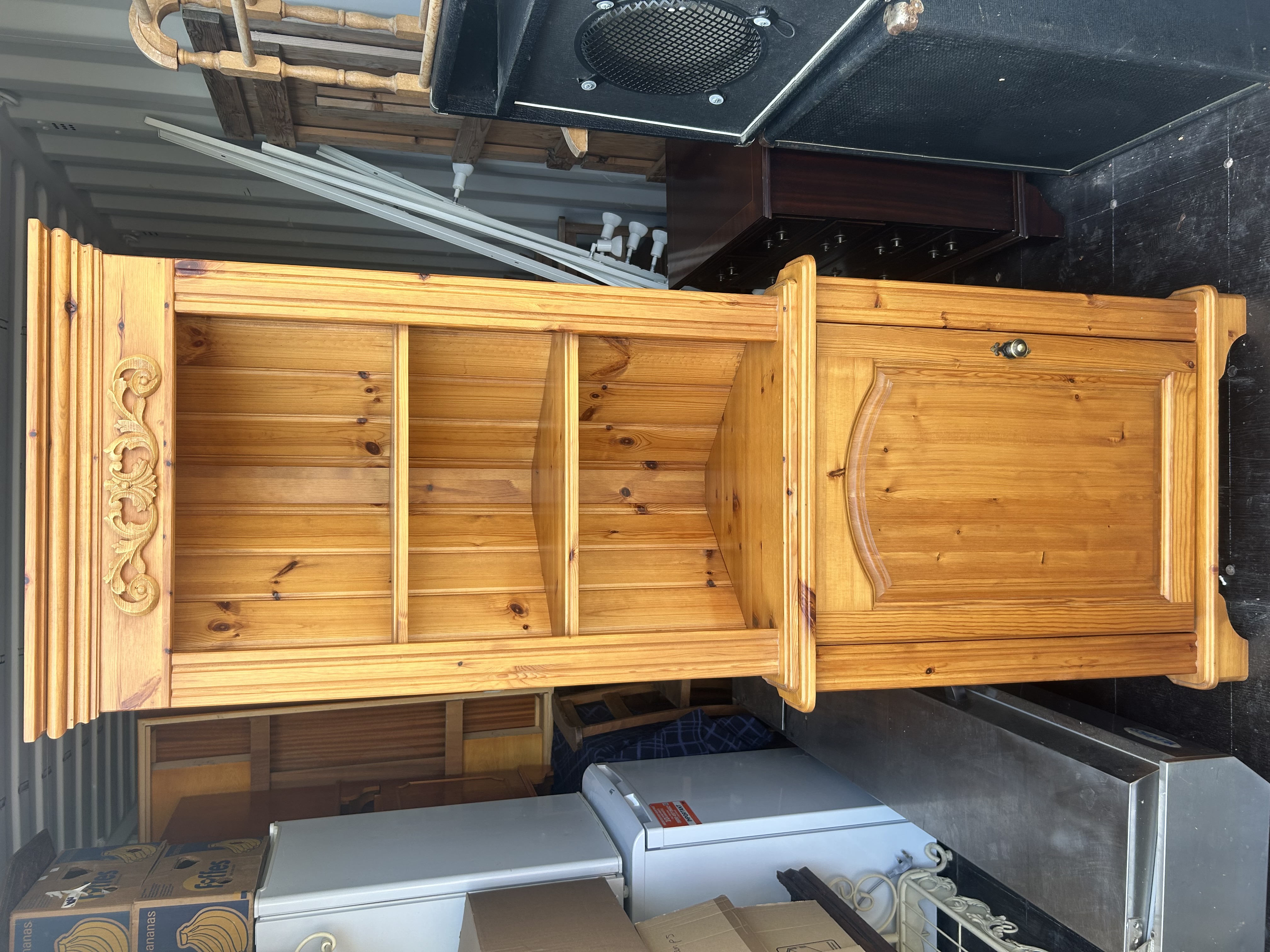 A two-part pine corner cabinet, dating from the late 20th to early 21st century, exhibiting a rustic or country style. Constructed from knotty pine with a warm, honey-toned finish, it features an open upper section with two triangular shelves and a closed lower section with a single arched panel door fitted with a brass-toned knob. Decorative carved scrollwork adorns the frieze above the open shelves, complemented by tongue-and-groove back paneling in the upper section. No discernible manufacturer’s marks or text are present.